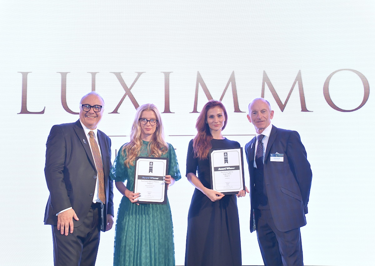 LUXIMMO получи три големи отличия - Най-добра агенция за недвижими имоти в България, Най-добър сайт за недвижими имоти в България и 5-star Winner. Призовете бяха приети от управляващия директор на агенцията Невена Стоянова и Ралица Караджова (мениджър "Комуникации").