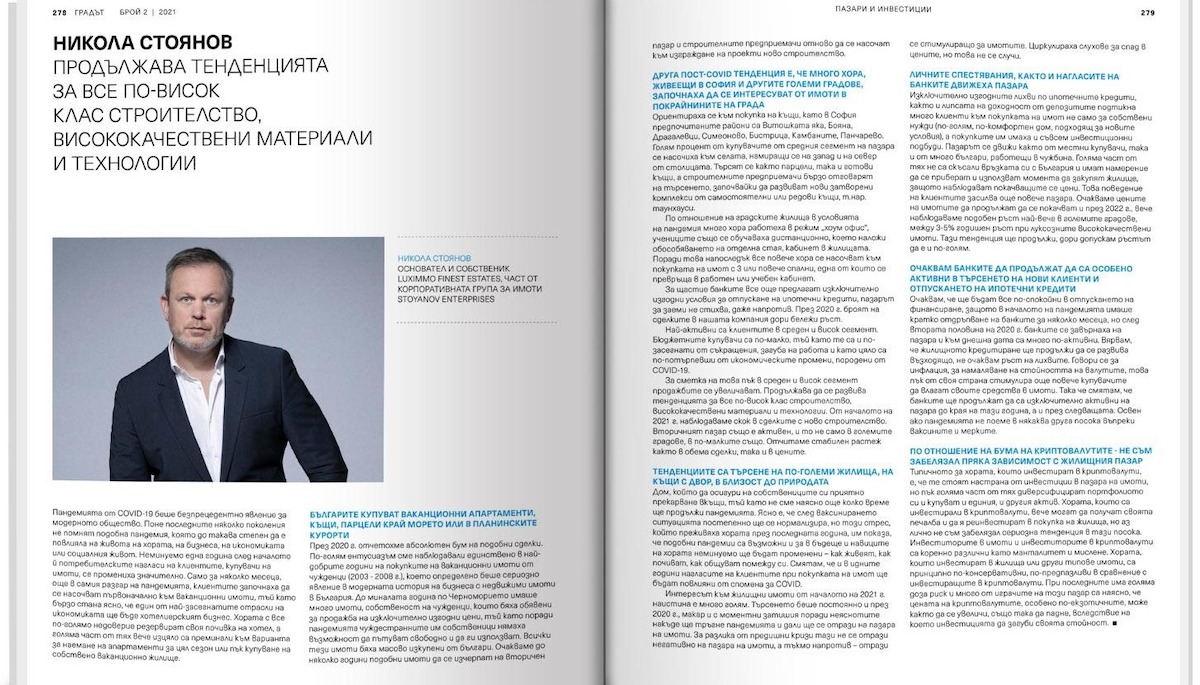 Ориентираха се към покупка на къщи, като в София предпочитаните райони са Витошката яка, Бояна, Драгалевци, Симеоново, Бистрица, Камбаните, Панчарево. Голям процент от купувачите от средния сегмент на пазара се насочиха към селата, намиращи се на запад и на север от столицата. Търсят се както парцели, така и готови къщи, а строителните предприемачи бързо отговарят на търсенето, започвайки да развиват нови затворени комплекси от самостоятелни или редови къщи, т.нар. таунхауси. По отношение на градските жилища в условията на пандемия много хора работеха в режим „хоум офис“, учениците също се обучаваха дистанционно, което наложи обособяването на отделна стая, кабинет в жилищата. Поради това напоследък все повече хора се насочват към покупката на имот с 3 или повече спални, една от които се превръща в работен или учебен кабинет. За щастие банките все още предлагат изключително изгодни условия за отпускане на ипотечни кредити, пазарът за заеми не стихва, даже напротив. През 2020 г. броят на сделките в нашата компания дори бележи ръст. Най-активни са клиентите в среден и висок сегмент. Бюджетните купувачи са по-малко, тъй като те са и по-засегнати от съкращения, загуба на работа и като цяло са по-потърпевши от икономическите промени, породени от COVID-19. За сметка на това пък в среден и висок сегмент продажбите се увеличават. Продължава да се развива тенденцията за все по-висок клас строителство, висококачествени материали и технологии. От началото на 2021 г. наблюдаваме скок в сделките с ново строителство. Вторичният пазар също е активен, и то не само в големите градове, в по-малките също. Отчитаме стабилен растеж както в обема сделки, така и в цените.