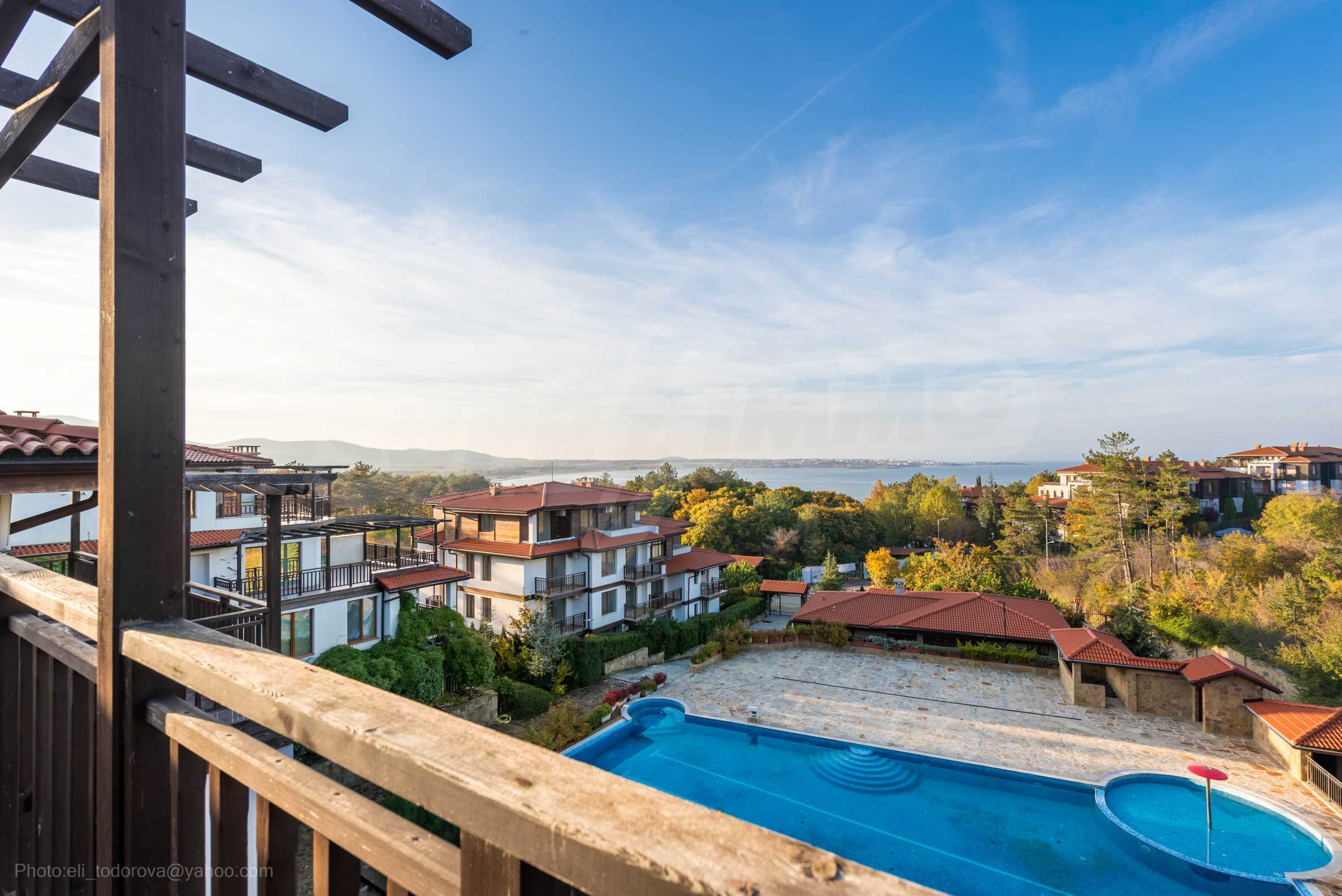 Имотът се намира на 4-ти, последен етаж в Корпус "В" и се състои от обширна дневна с кухненски бокс и зона-трапезария, 3 спални, 3 комбинирани бани/тоалет, 2 панорамни тераси с обща площ от 109.39 кв.м, с красива гледка към гората, басейна и морето.