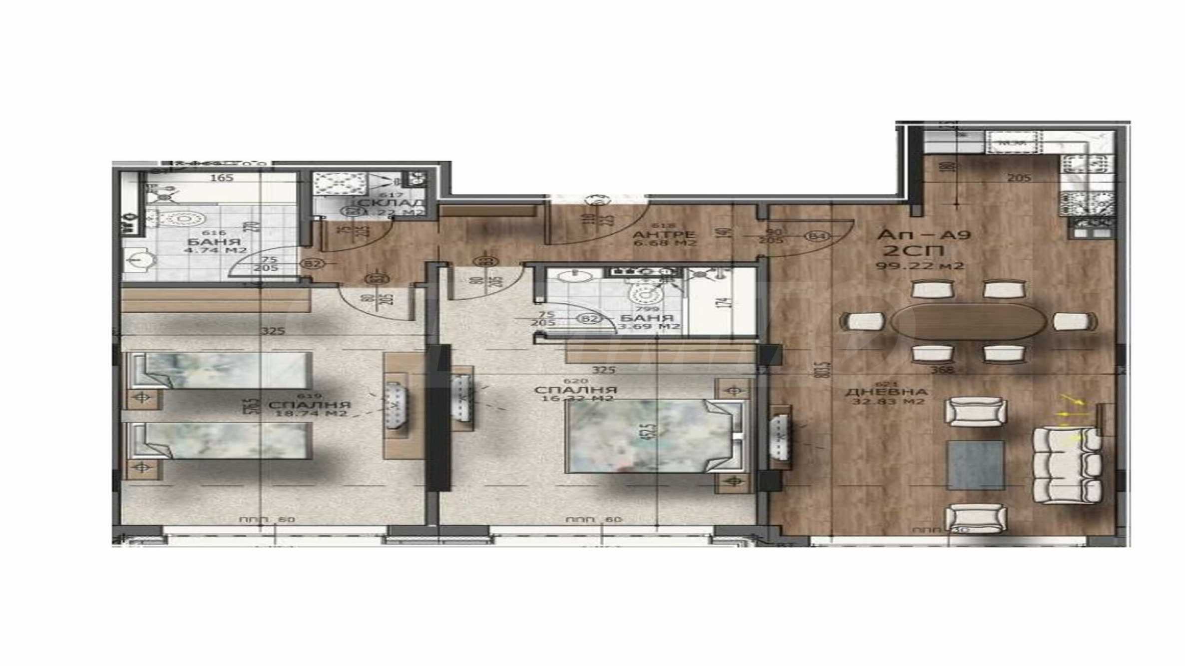 Апартаментът е разположен на 5-и етаж и предлага площ от 117.88 кв.м, функционално разпределена в антре, всекидневна с кухненска част, две спални и баня с тоалетна. Предлага се качествено завършен по Български Държавен Стандарт.
