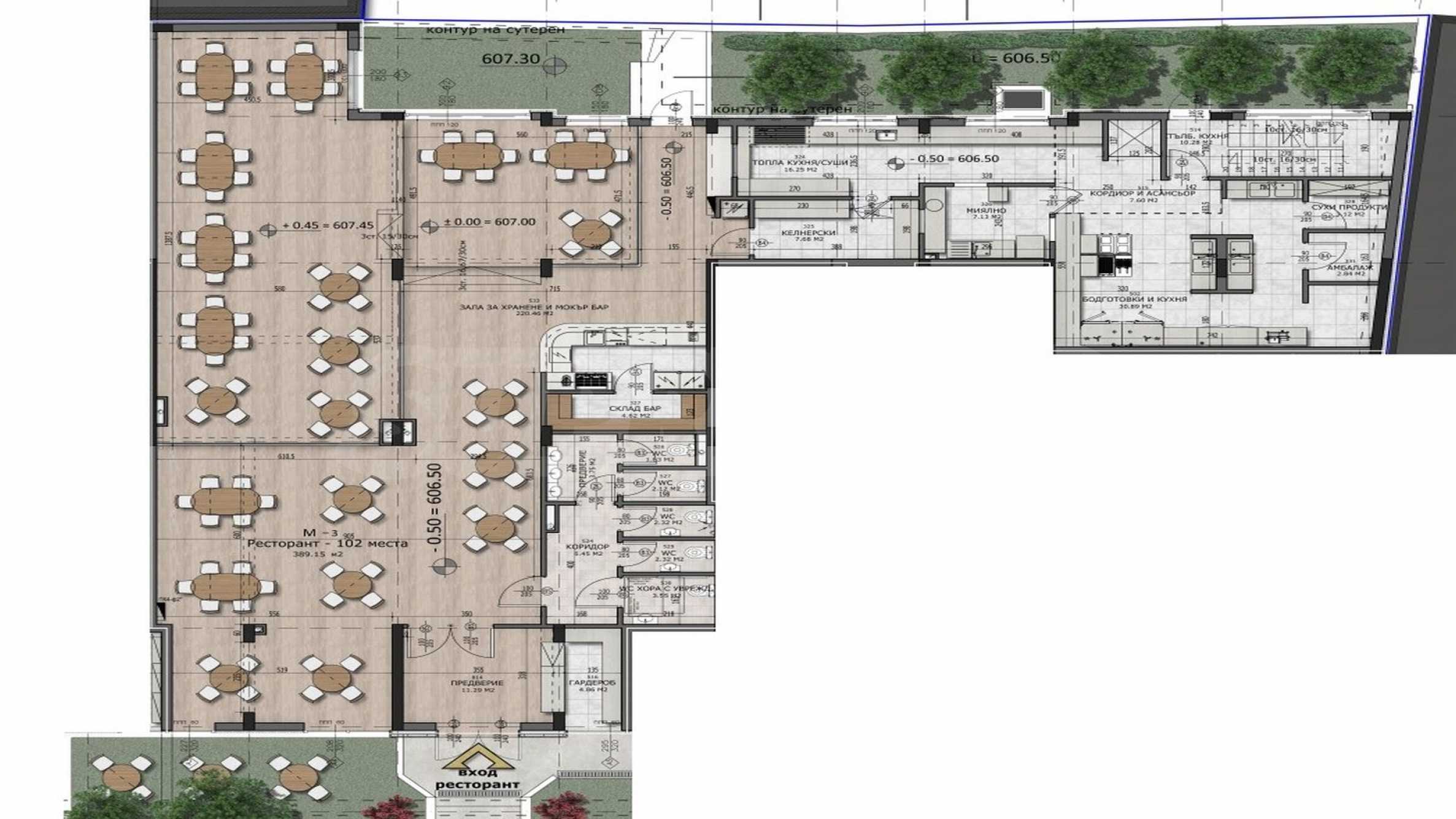 Имотът е разположен на ниво партер с вход от към главна улица. Предлага чиста площ от 465.16 кв.м и се състои от: просторна търговска зала с капацитет 102 човека, зона за гардеробна, тоалетни, бар зона с обособен склад, просторна кухня с обособени всички необходими помещения. Към обекта има 76.06 кв.м двор.