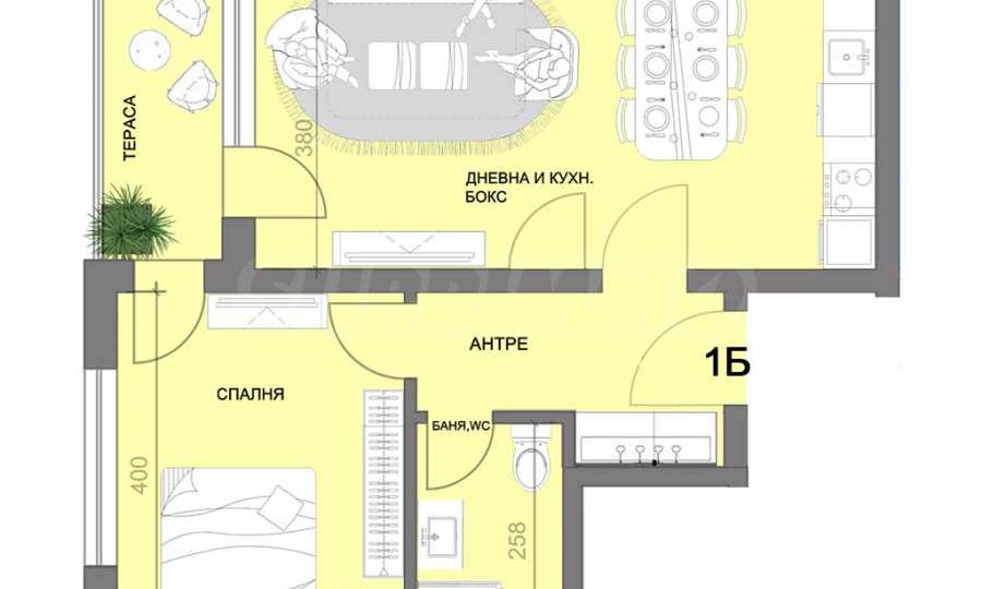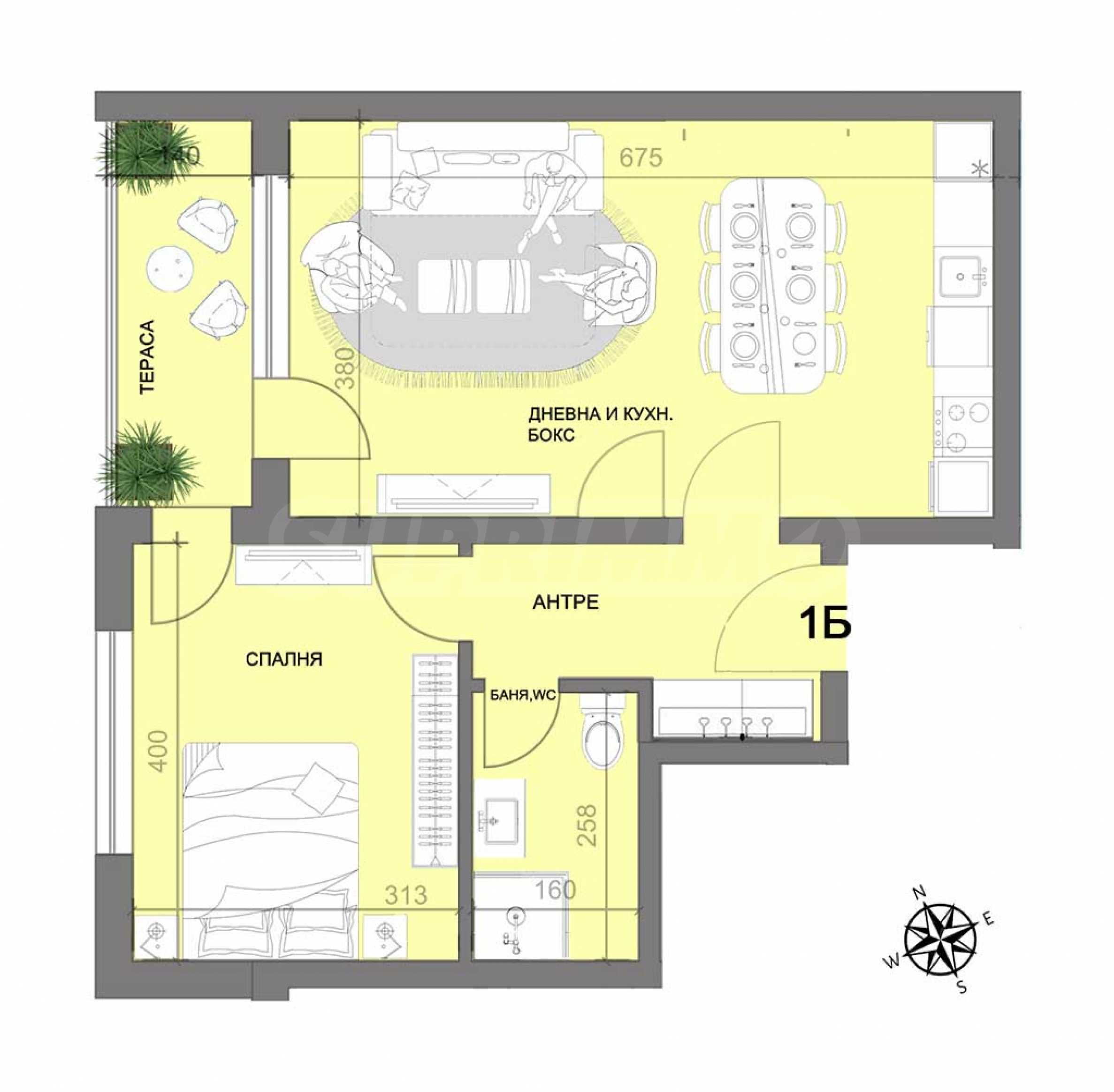 Жилището се състои от дневна с кухненски бокс, спалня, баня с тоалетна, антре и тераса.