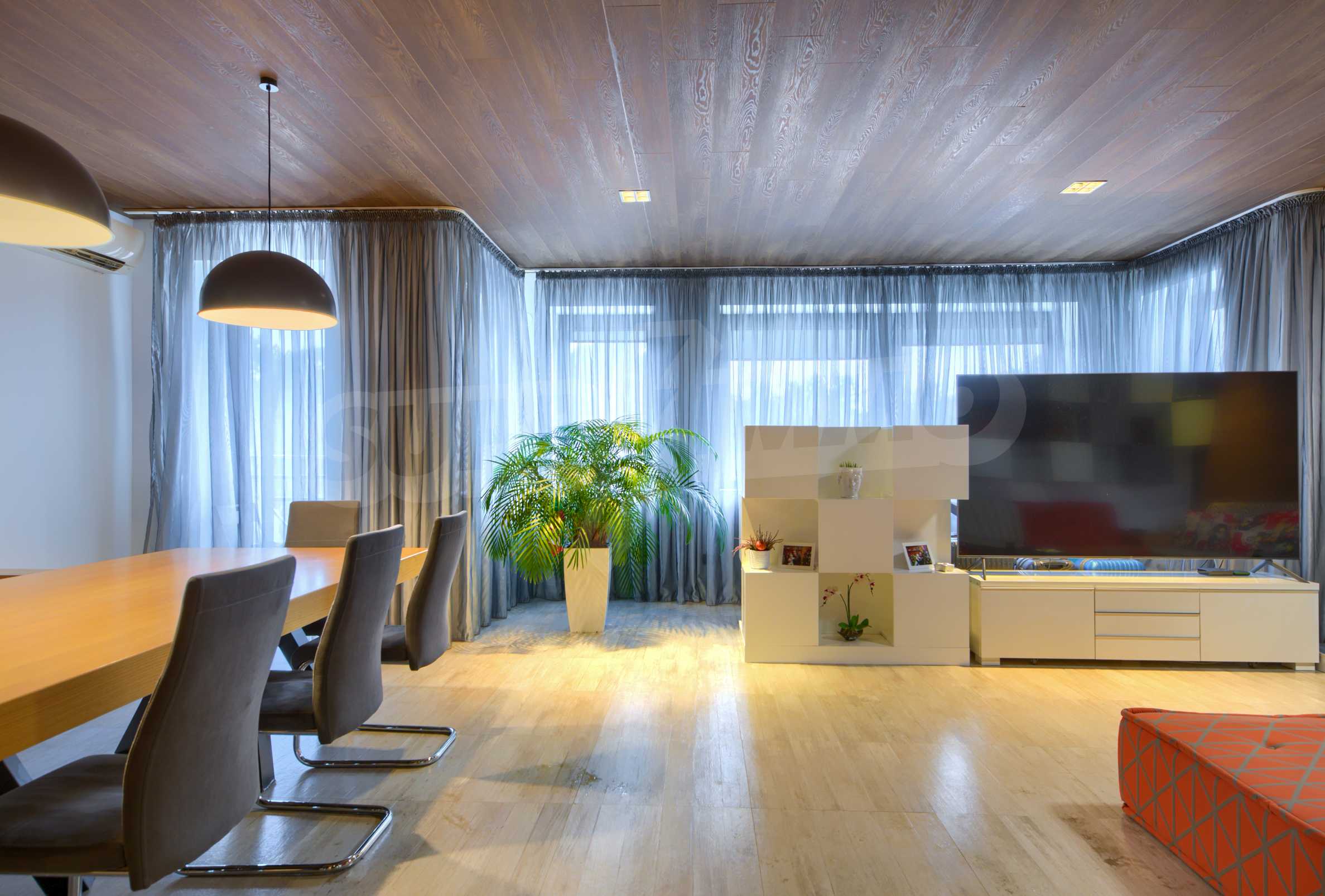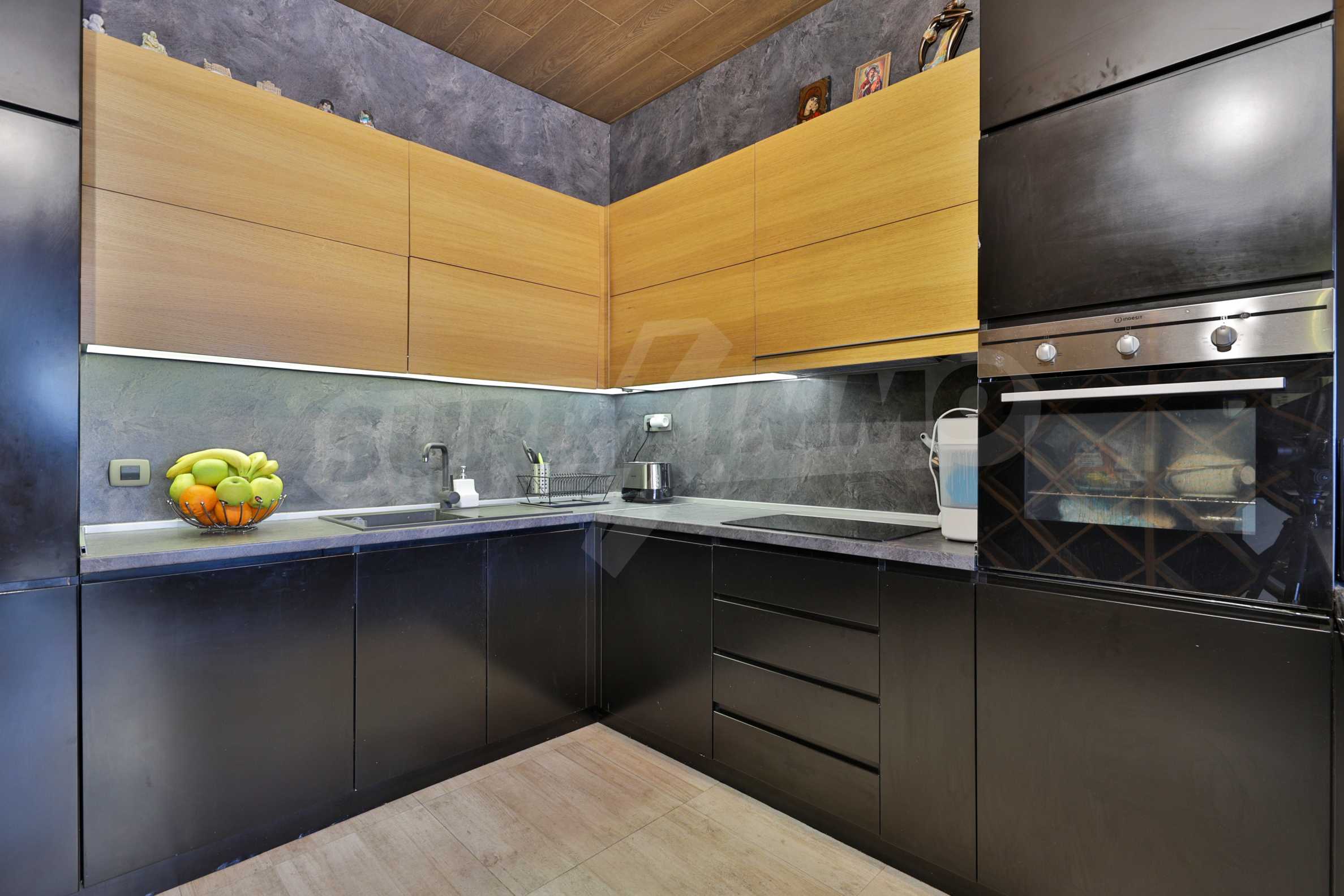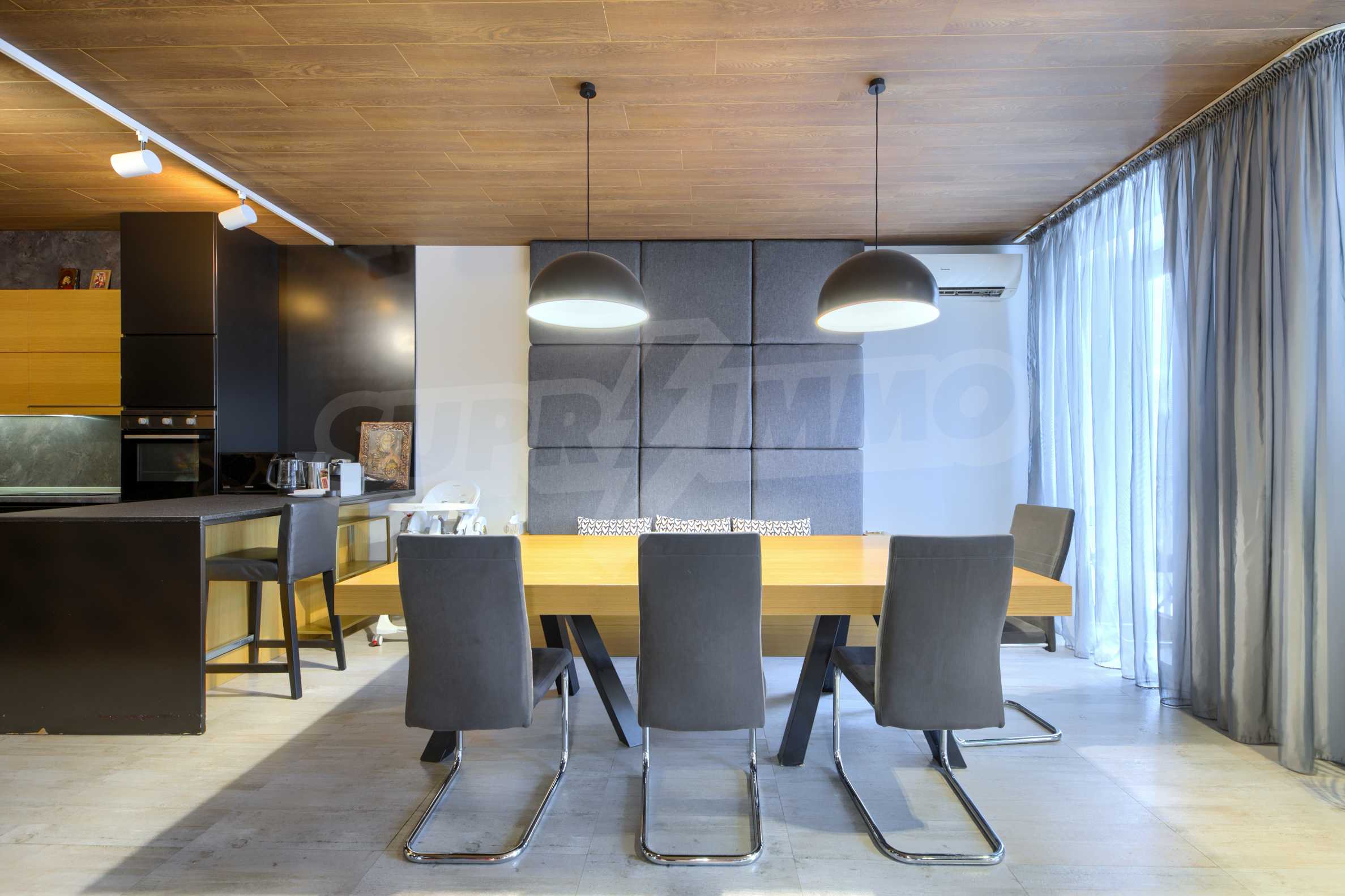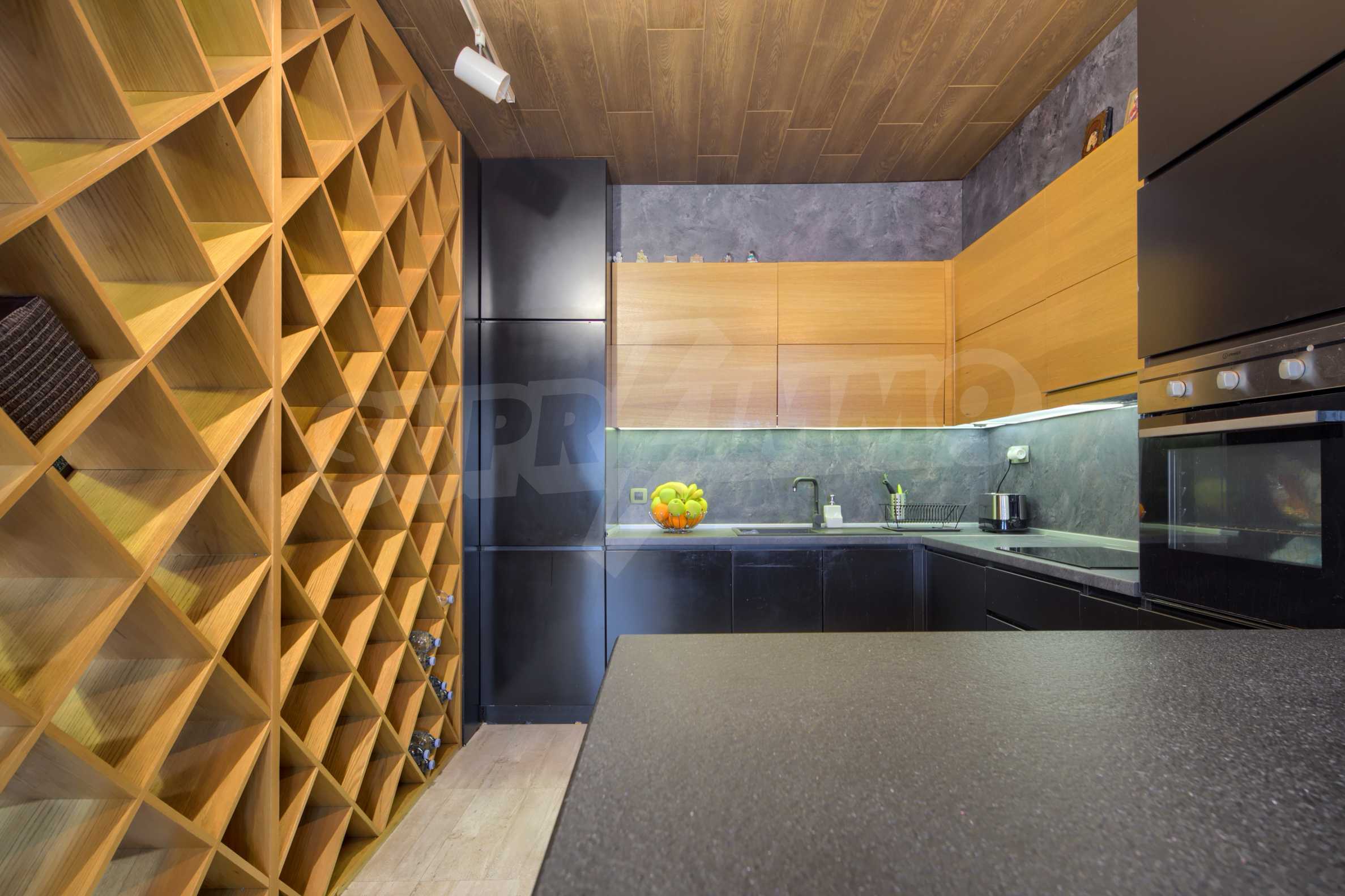 Общата квадратура на апартамента е 180 кв.м. Обзаведен е със специално внимание към всеки един детайл. Използвани са естествени материали, технически камък, италиански гранитогрес. Апартаментът е оборудван с висок клас електроуреди: фурна и миялна INDESIT, хладилник WHIRLPOOL, пералня AEG. Отоплението е на електрическо котле и климатици.