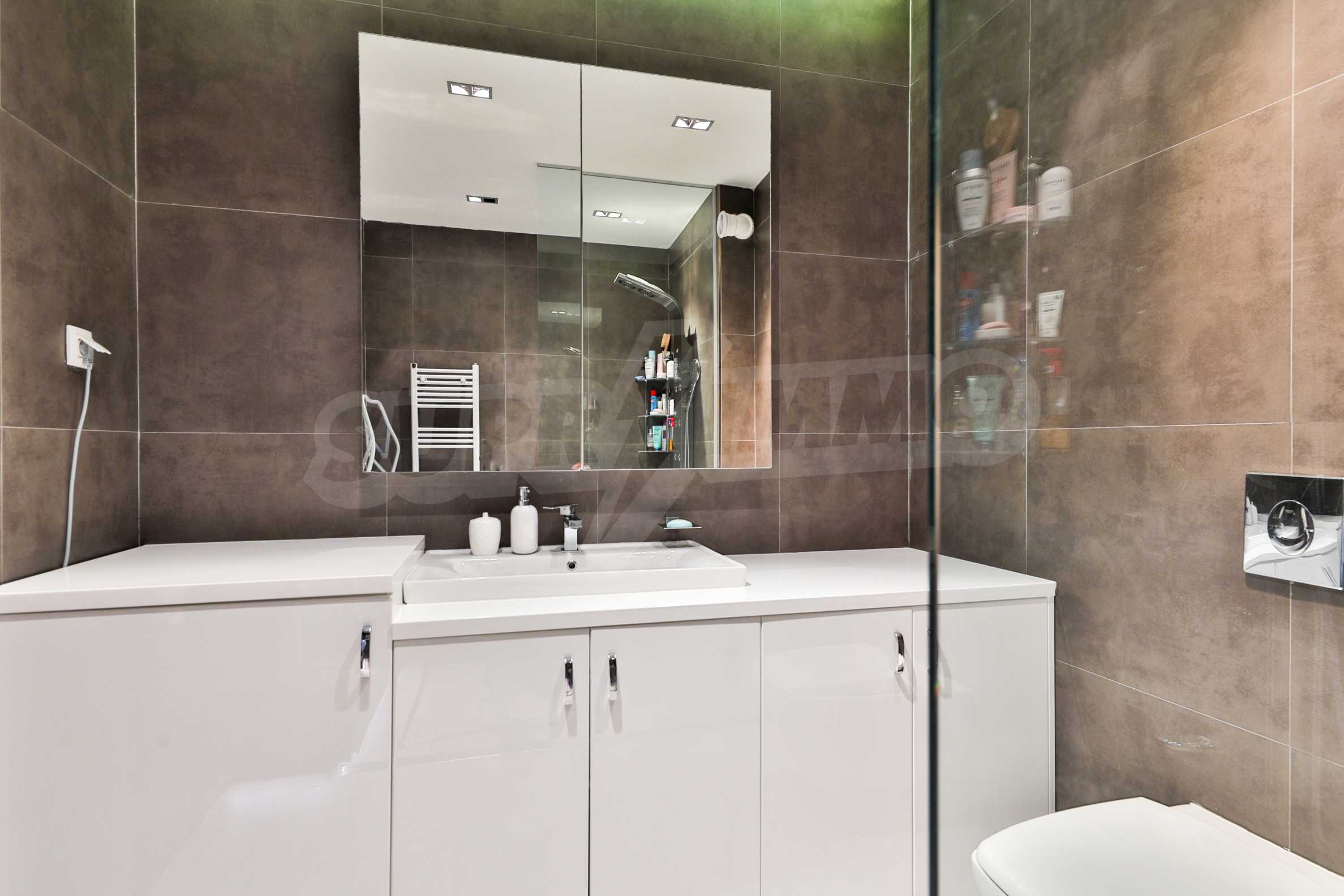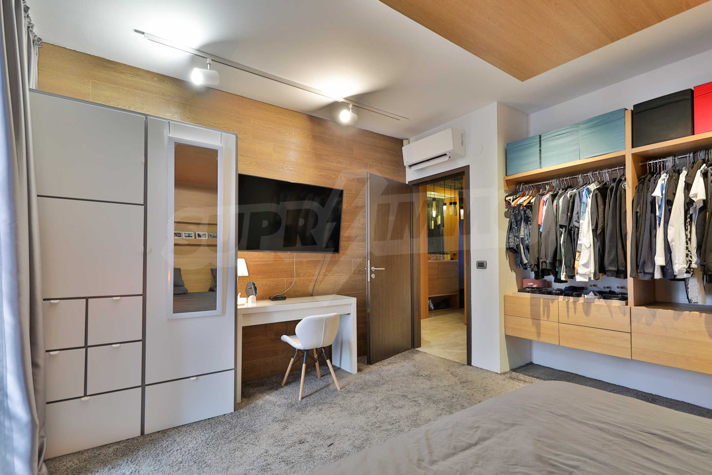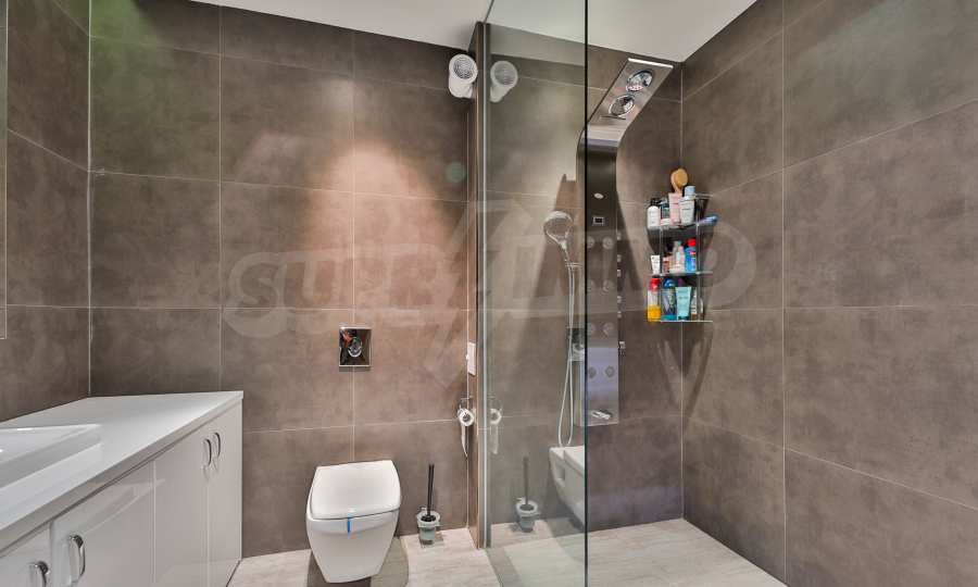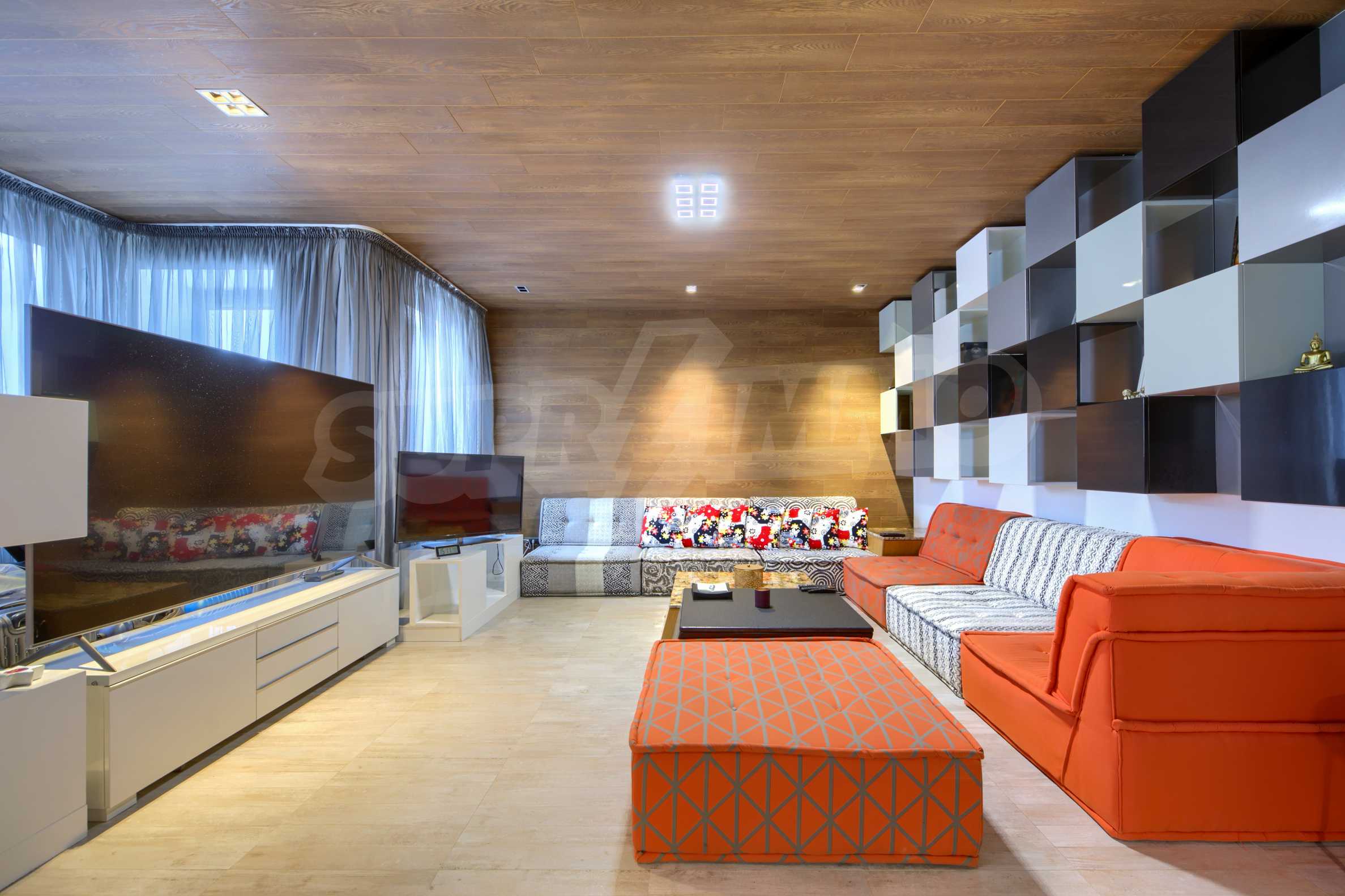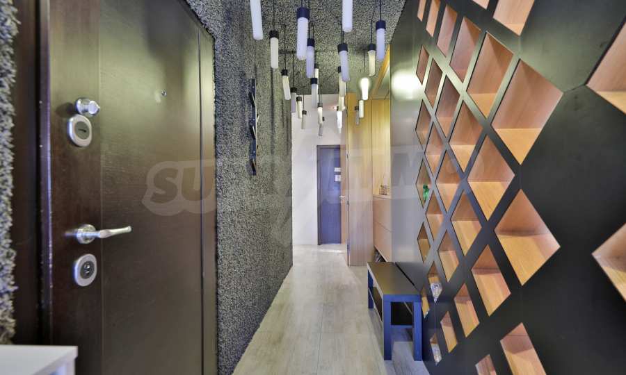 Общата квадратура на апартамента е 180 кв.м. Обзаведен е със специално внимание към всеки един детайл. Използвани са естествени материали, технически камък, италиански гранитогрес. Апартаментът е оборудван с висок клас електроуреди: фурна и миялна INDESIT, хладилник WHIRLPOOL, пералня AEG. Отоплението е на електрическо котле и климатици.