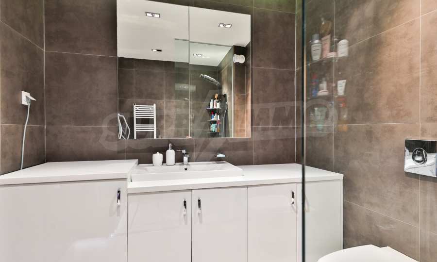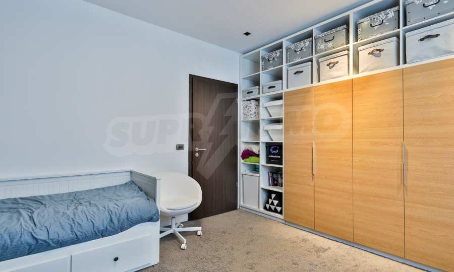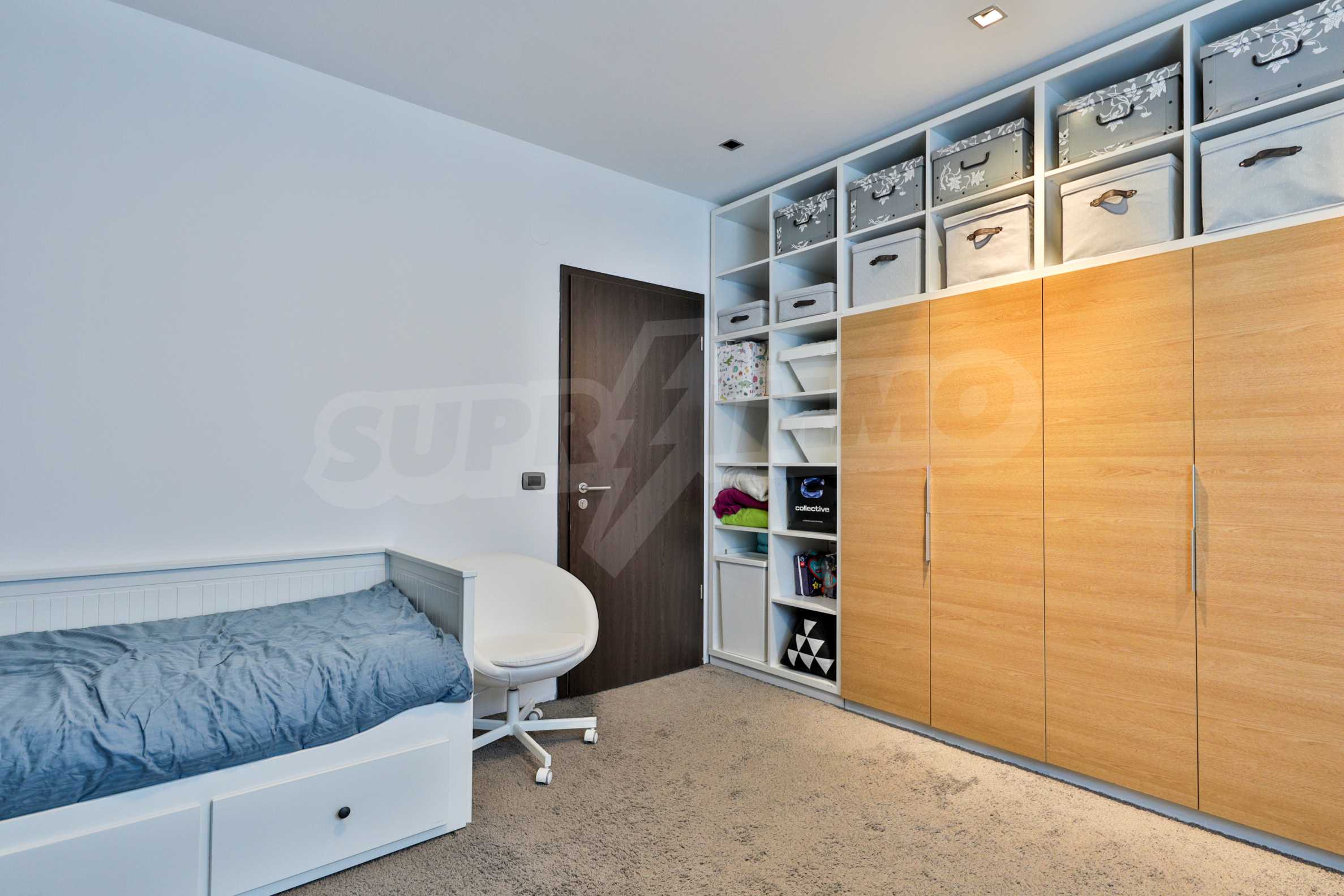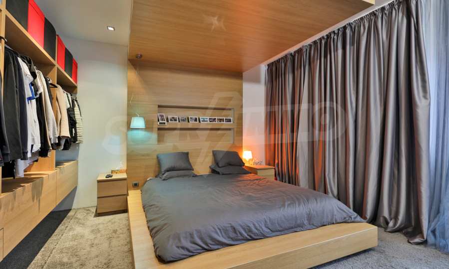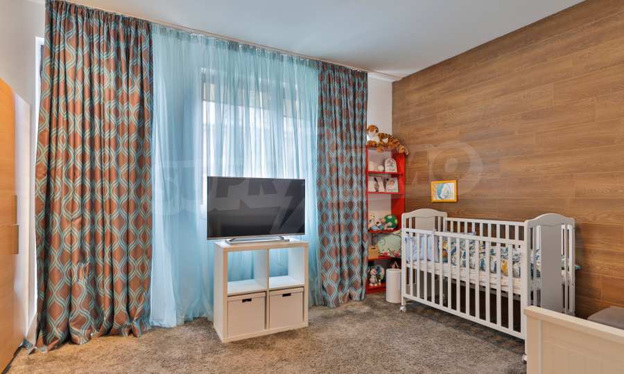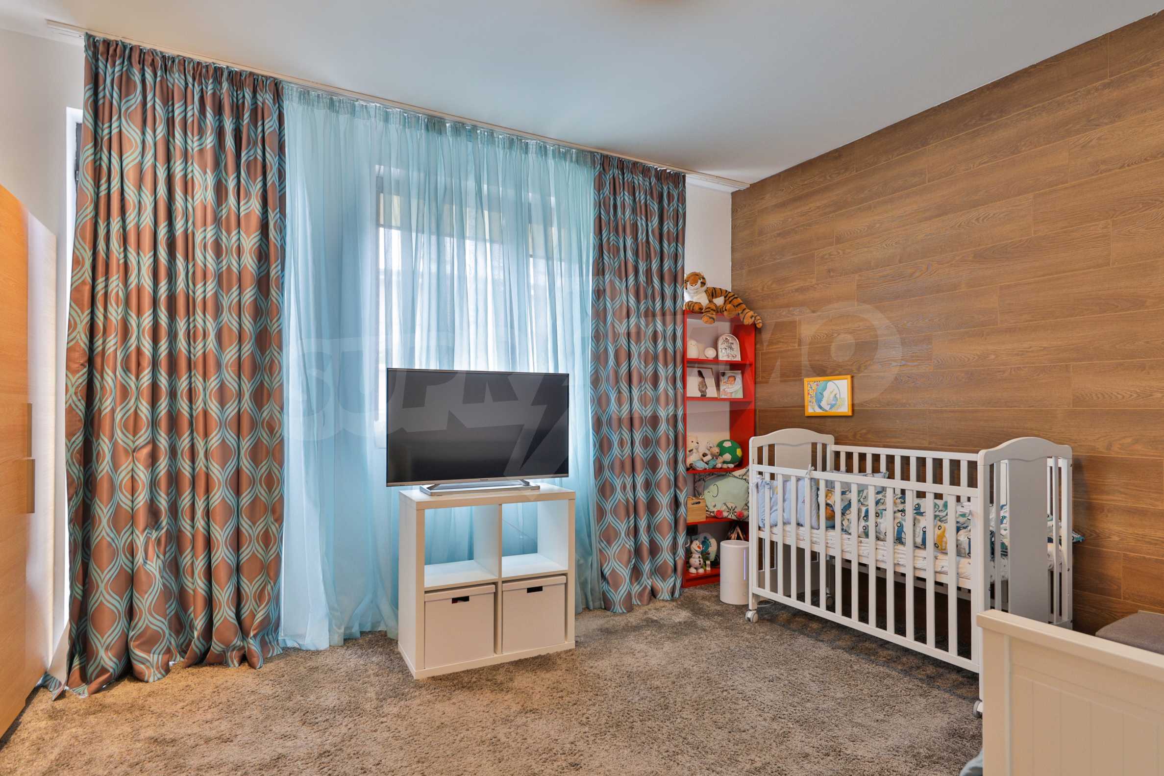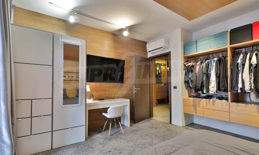 Общата квадратура на апартамента е 180 кв.м. Обзаведен е със специално внимание към всеки един детайл. Използвани са естествени материали, технически камък, италиански гранитогрес. Апартаментът е оборудван с висок клас електроуреди: фурна и миялна INDESIT, хладилник WHIRLPOOL, пералня AEG. Отоплението е на електрическо котле и климатици.