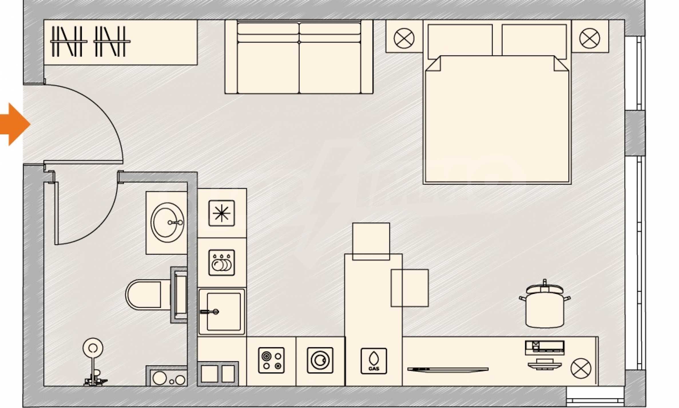 Студиото се намира на 3-ти етаж в 7-етажна сграда и е с обща площ 46.26 кв.м, разпределена между всекидневна с кухненска част и спален кът, баня с тоалетна.