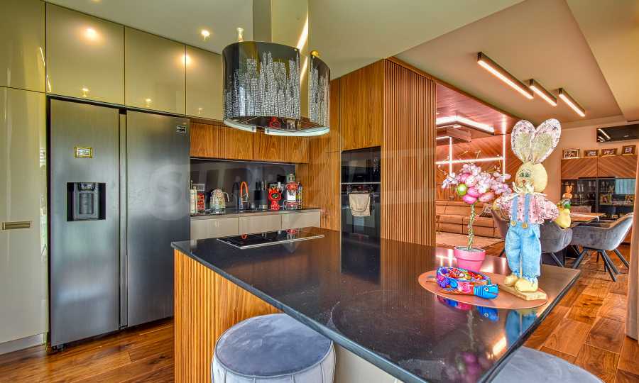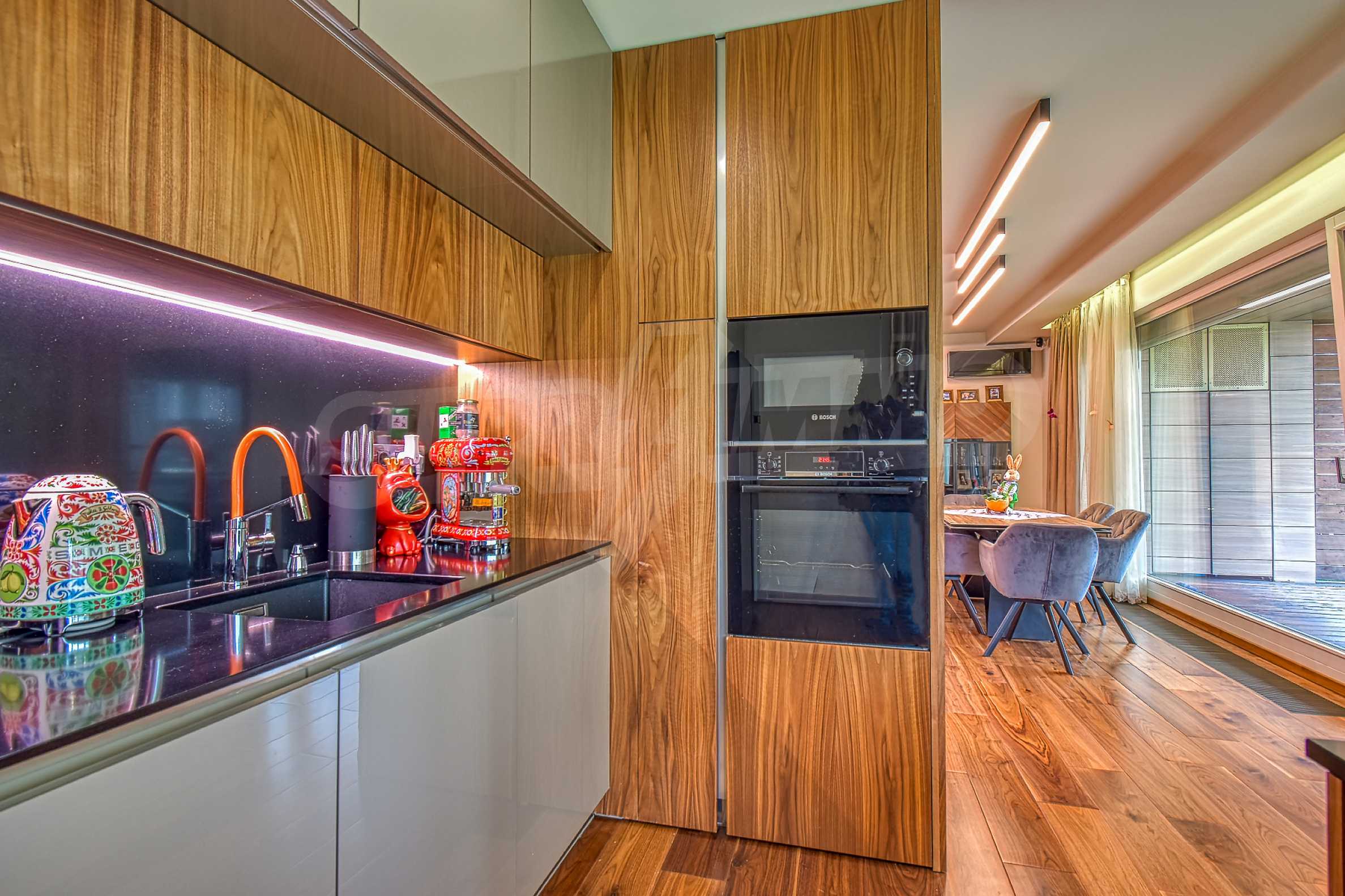 Апартаментът предлага изложение на юг - запад и следното разпределение: входно предверие, просторна всекидневна с кухня, родителска спалня с баня към нея, втора стая, втора баня и прилежащ озеленен двор с площ 174 кв.м. Обзаведен е по дизайнерски проект, с вложени материали от най- висок клас и оборудван с висок клас електроуреди BOSH. Стаите са светли и просторни, предоставящи пълен комфорт и уют.