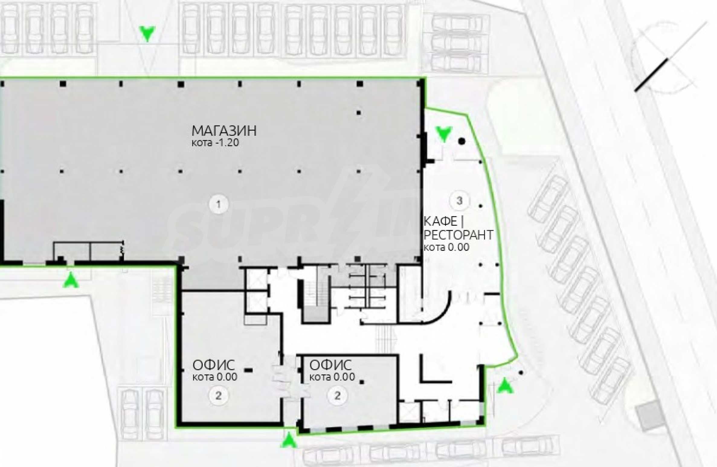 Имотът е разположен на ниво партер и предлага 910 кв.м обща площ. Сградата разполага с паркоместа на открито, както и такива на подземно ниво, над 1400 кв.м площи на всеки етаж, тераси на всяко ниво, както и кафе-ресторант с открита тераса.