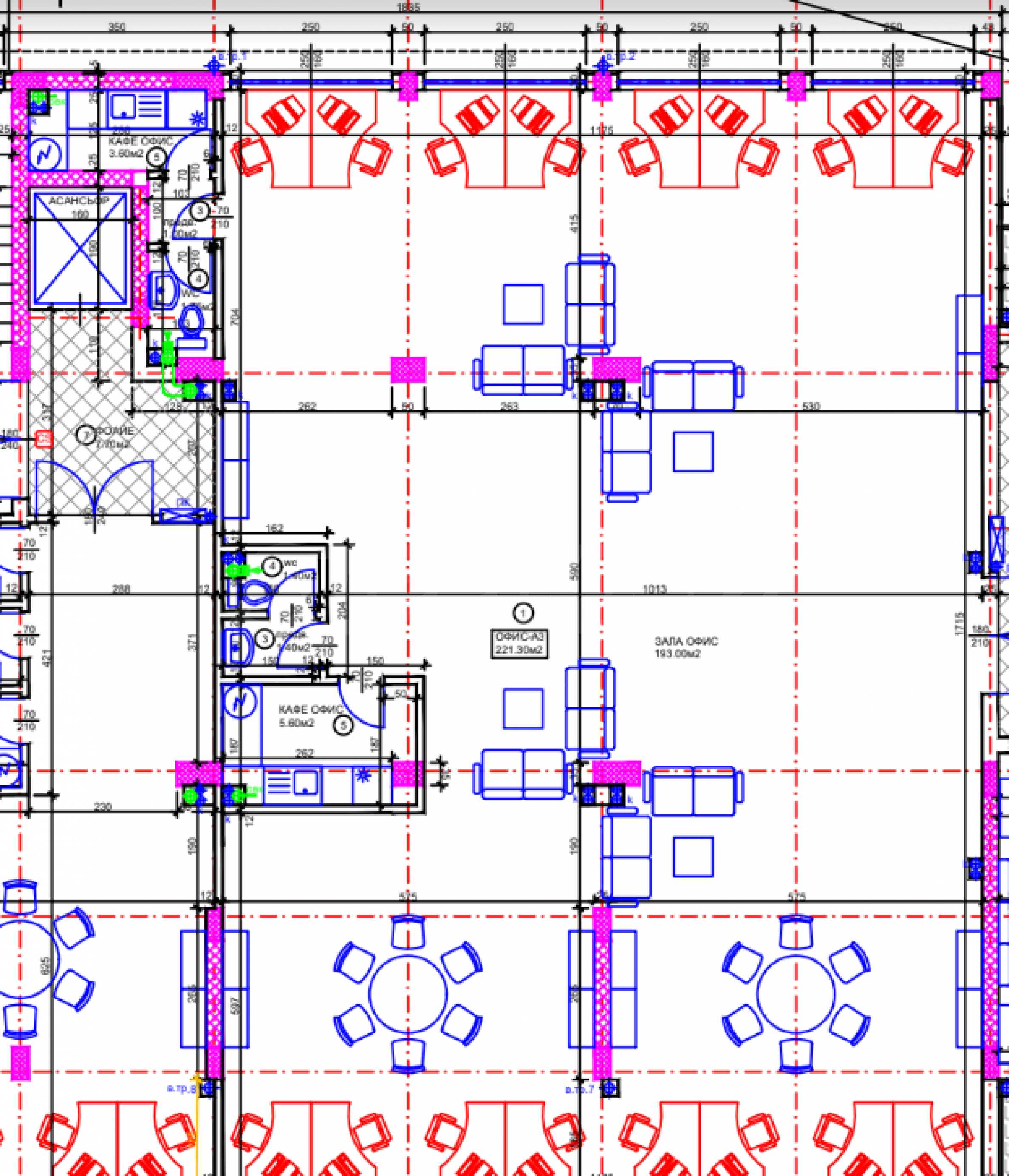 Офисът с обща площ от 221 кв.м е разположен на 4-ти етаж от 6 и има следното разпределение: