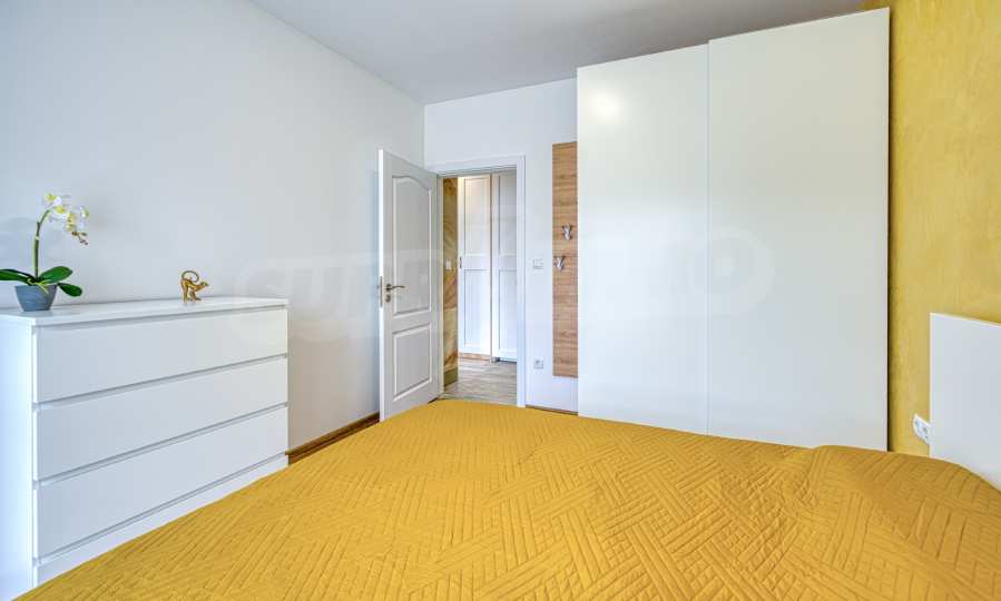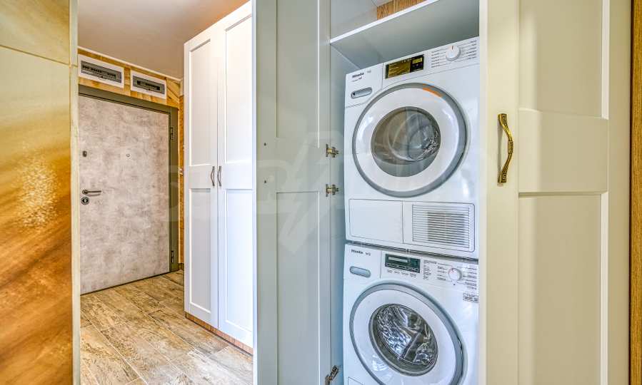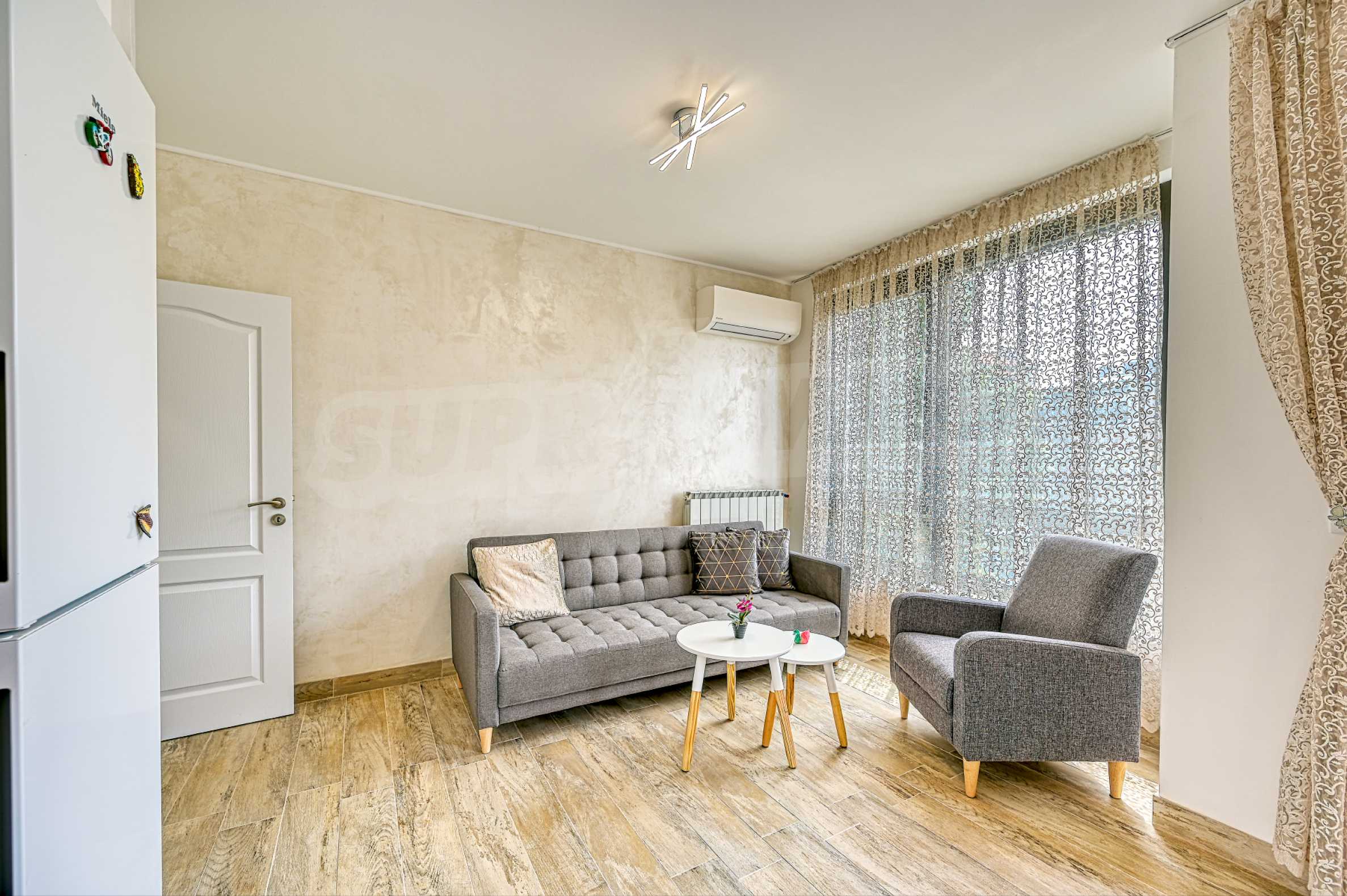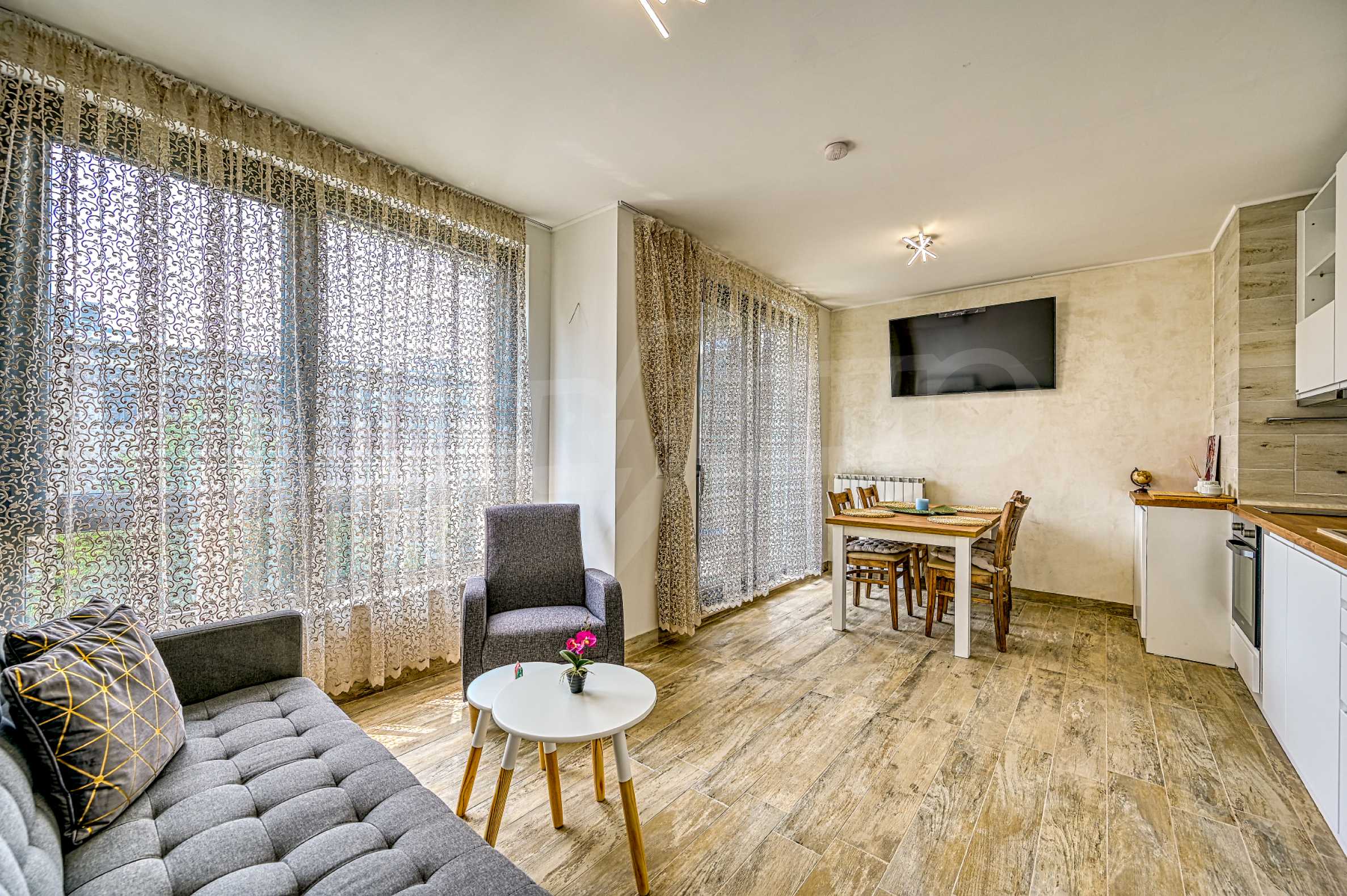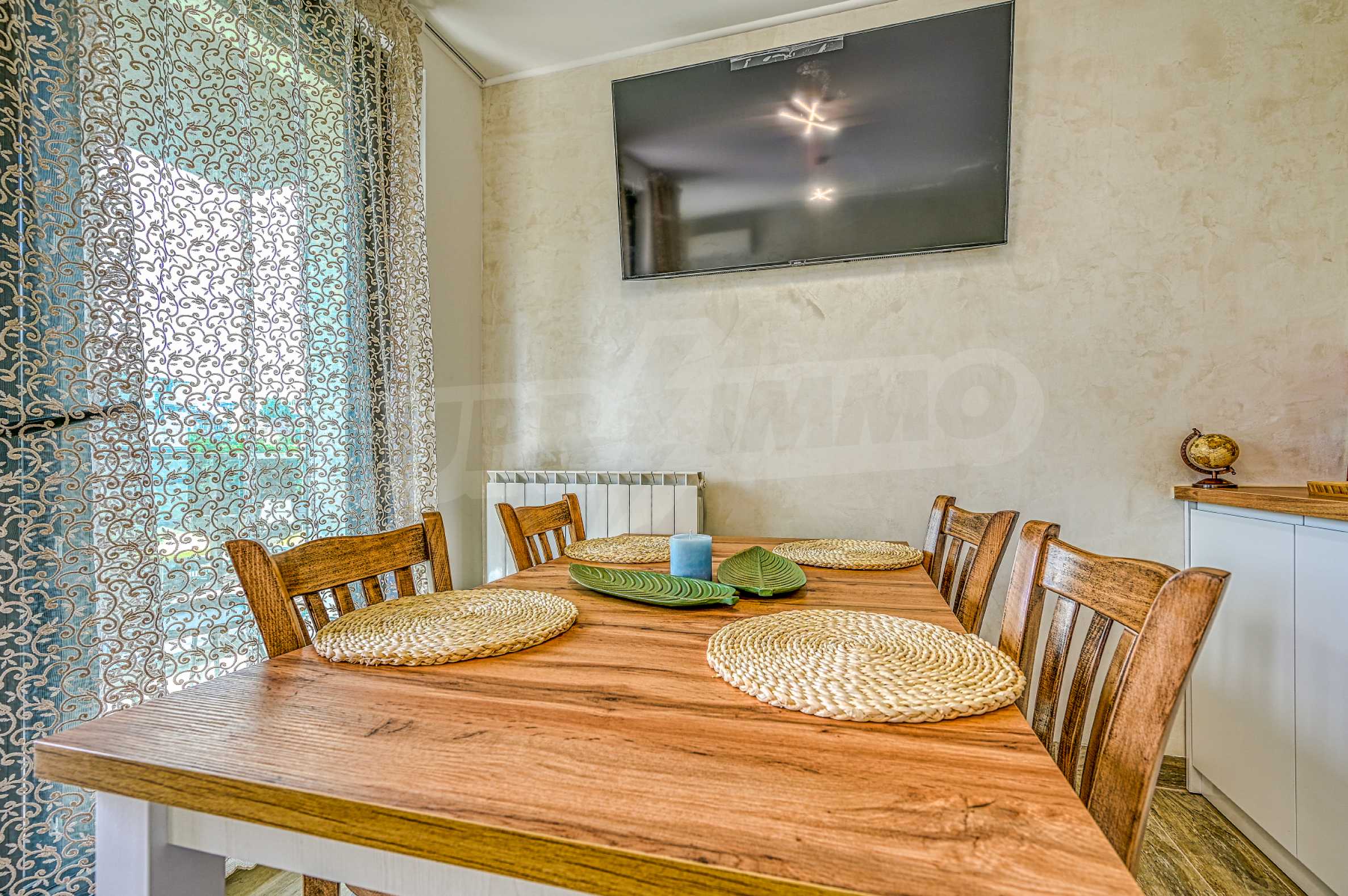 Обзавеждането е с комфортни мебели и висок клас електроуреди - фурна и котлони, електроуреди, микровълнова фурна, сушилня, пералня, както и консумативи - препарати, прибори и други. Диванът във всекидневната е разтегателен.