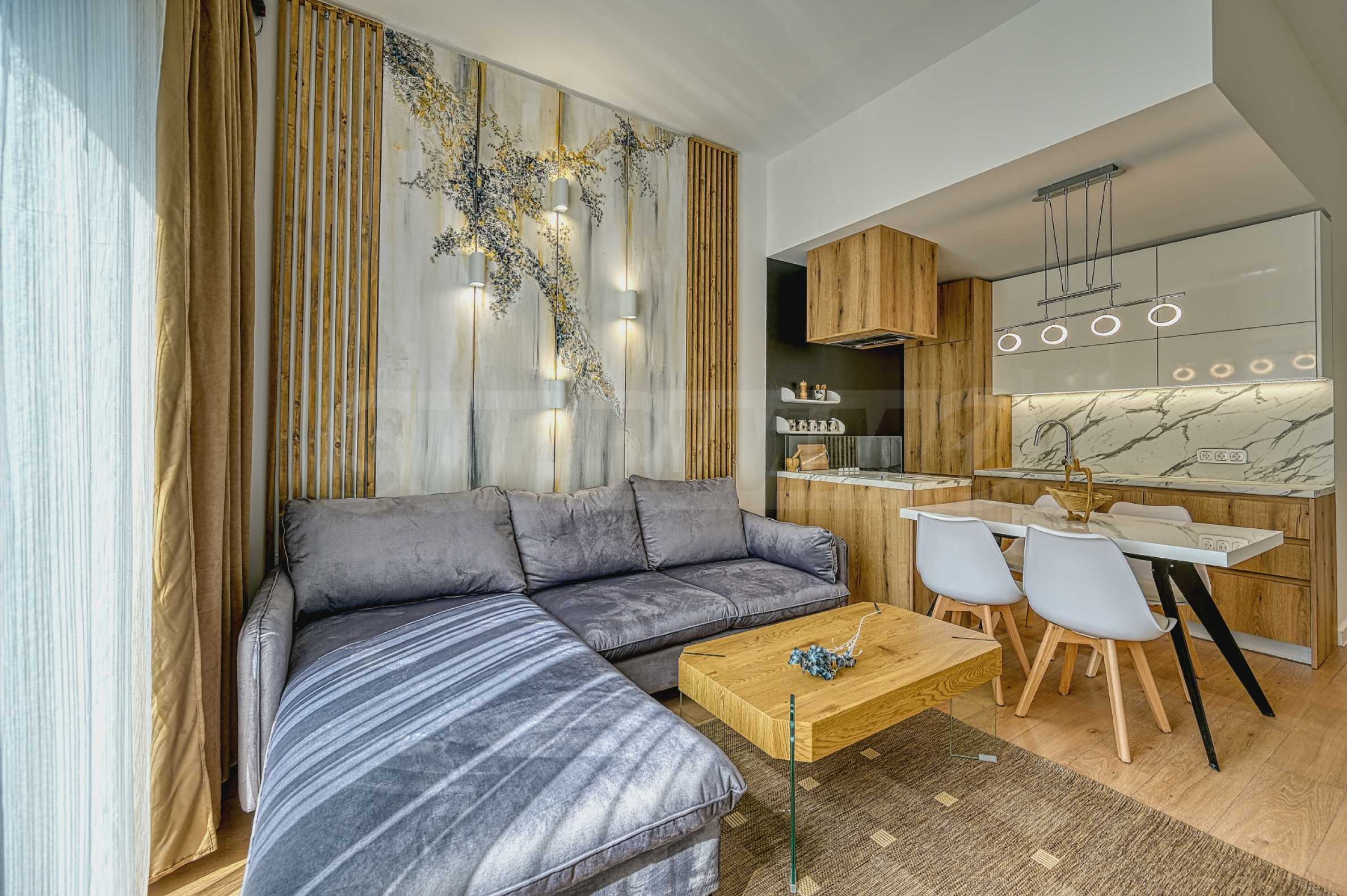 Апартаментът е със следното разпределение: коридор, светла всекидневна /21.32 кв.м/, балкон/ общ за двете стаи/спалня /13.82кв.м./, баня и килер.