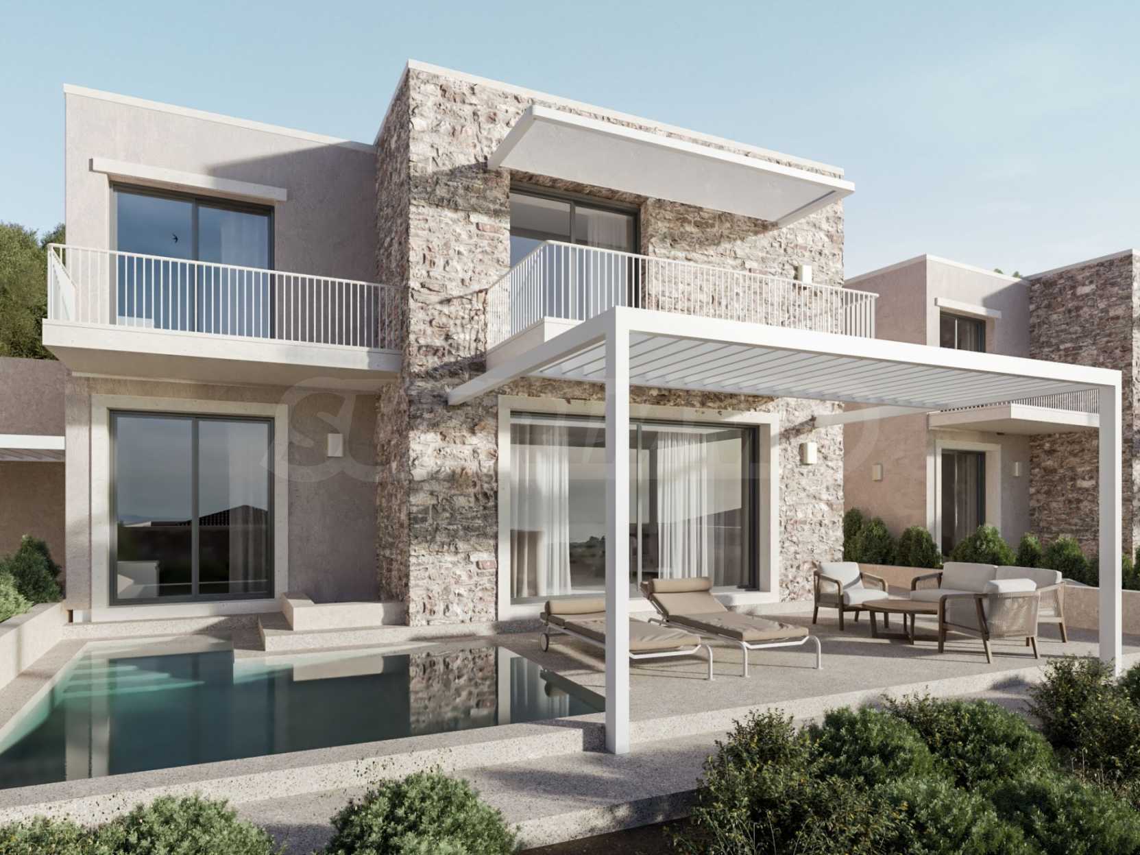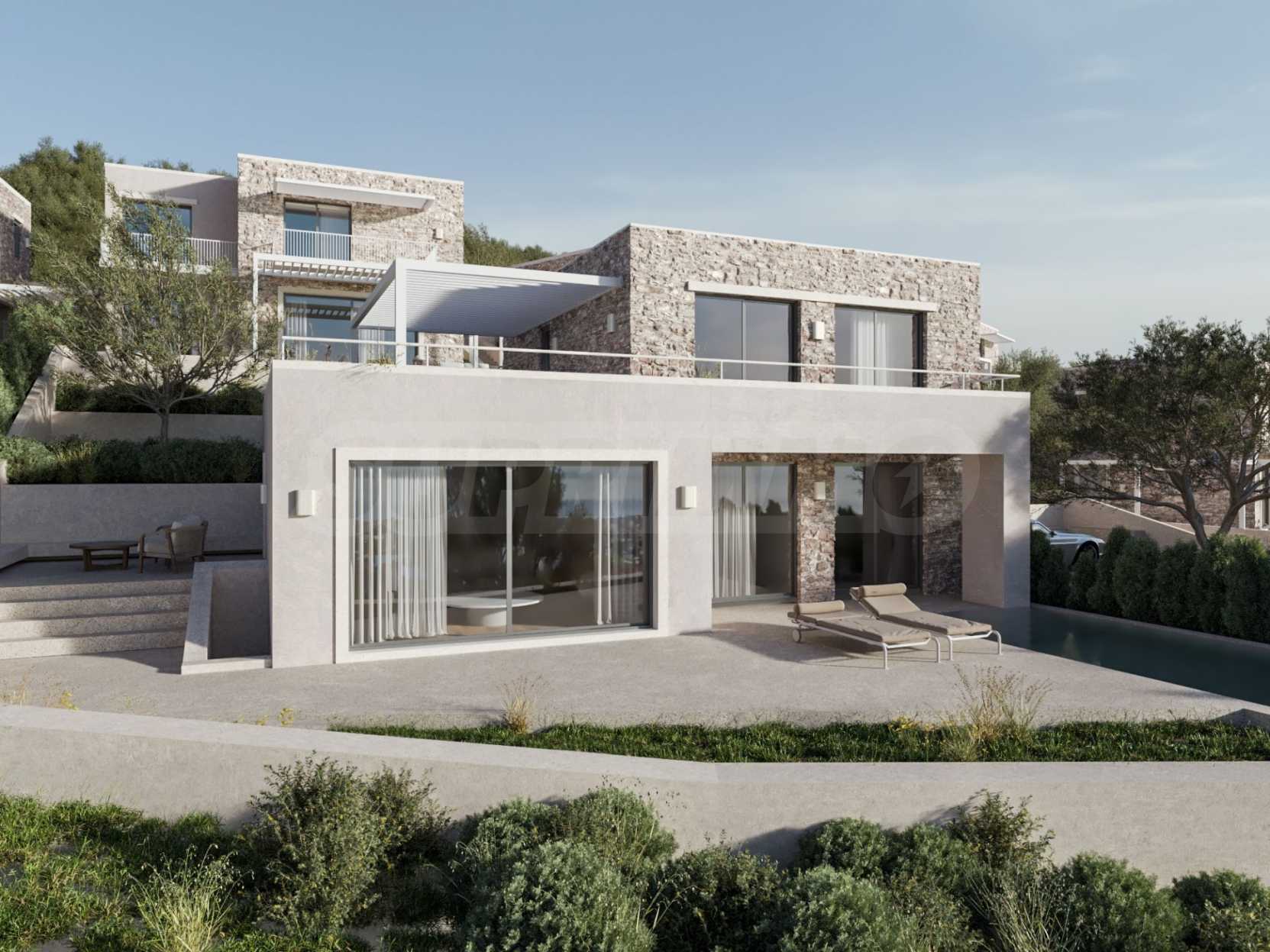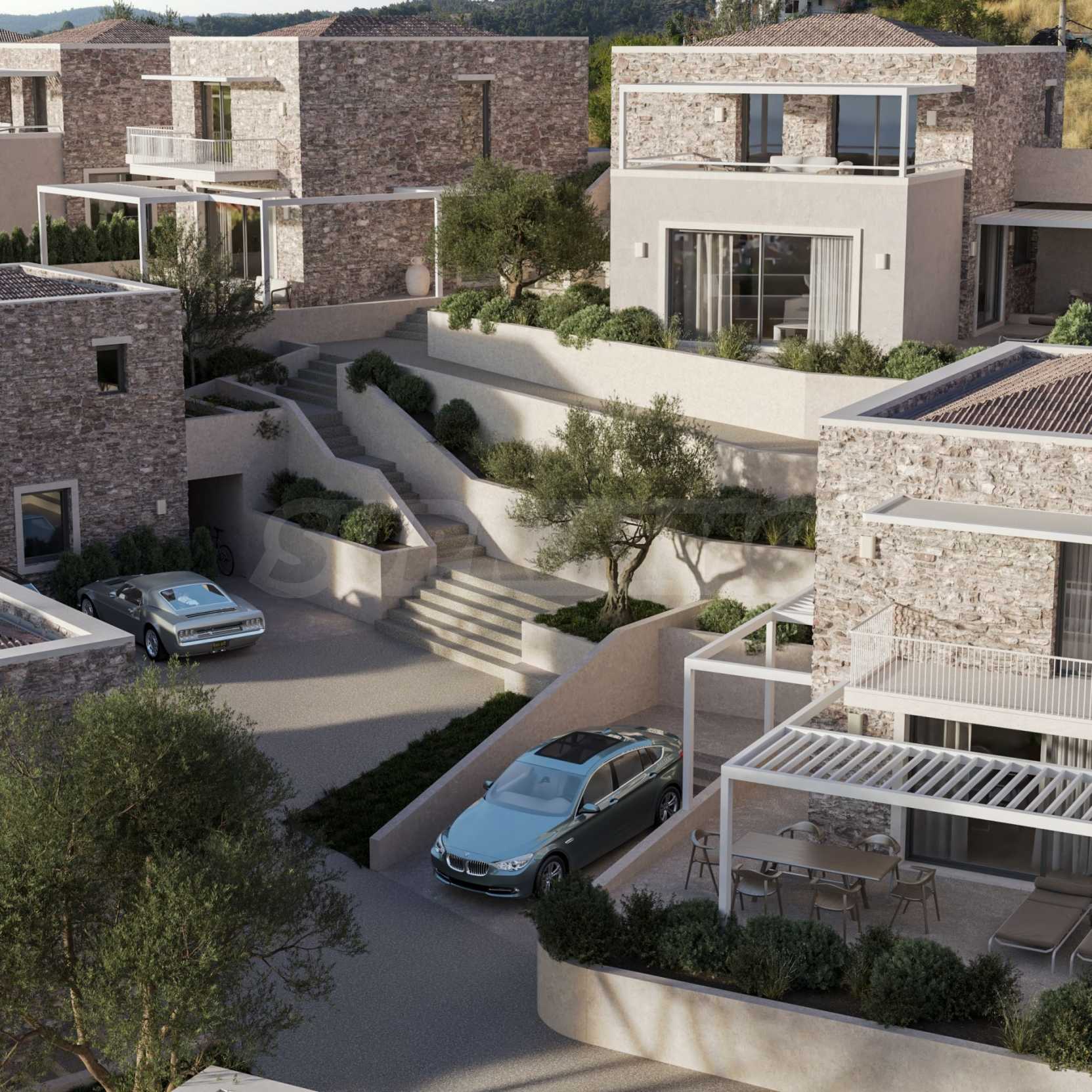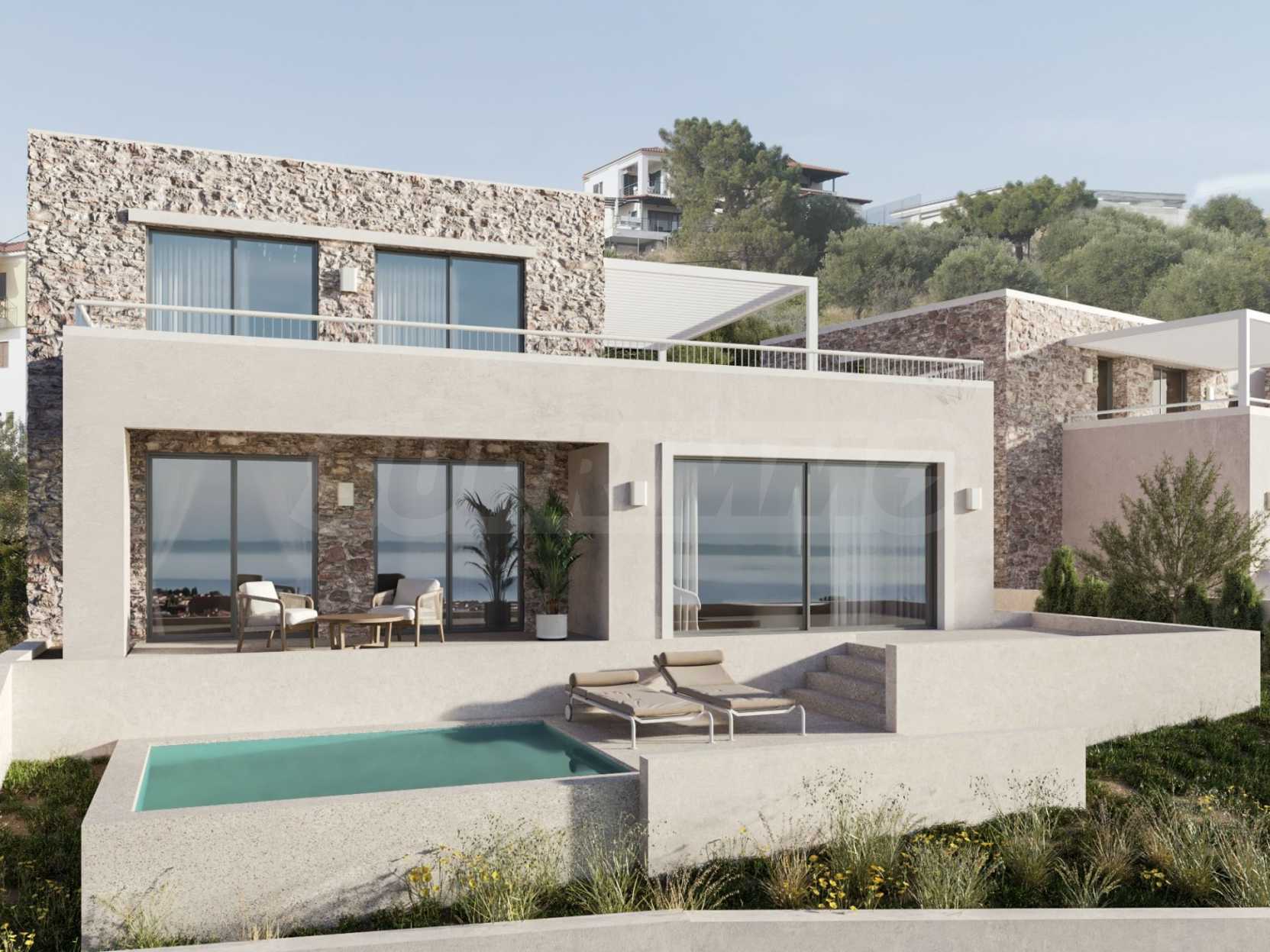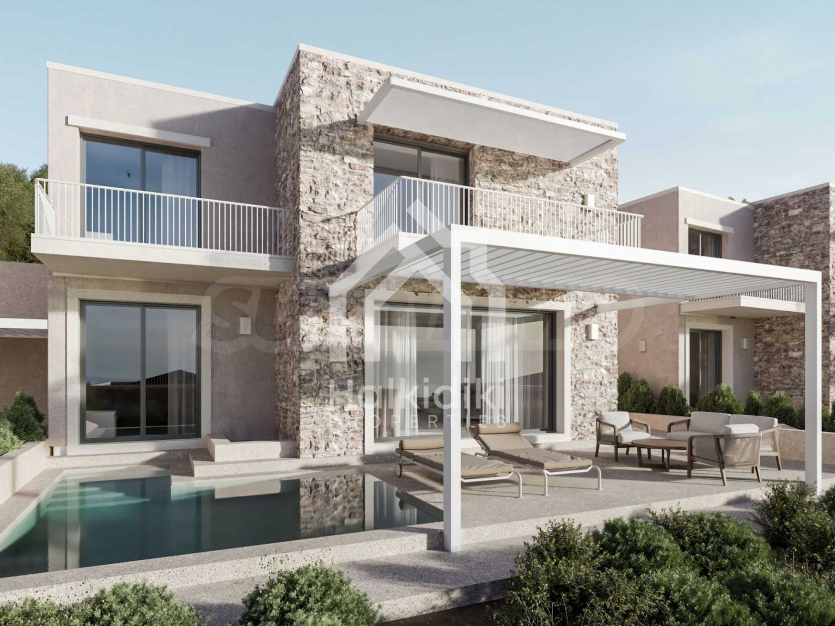 Луксозен имот, Красива самостоятелна къща в комплекс с басейн, на пешеходно разстояние от морето, на забележително място в Ситония, в сърцето на Халкидики. Имотът е разположен на площ от 219.59 кв.м. , с изключителна морска панорама, на 1.1 км от центъра на селото Състои се от 3 нива с общо 240 кв.м. жилищна площ. Имотът включва 4 спални, 1 WC. , склад и 2 бани