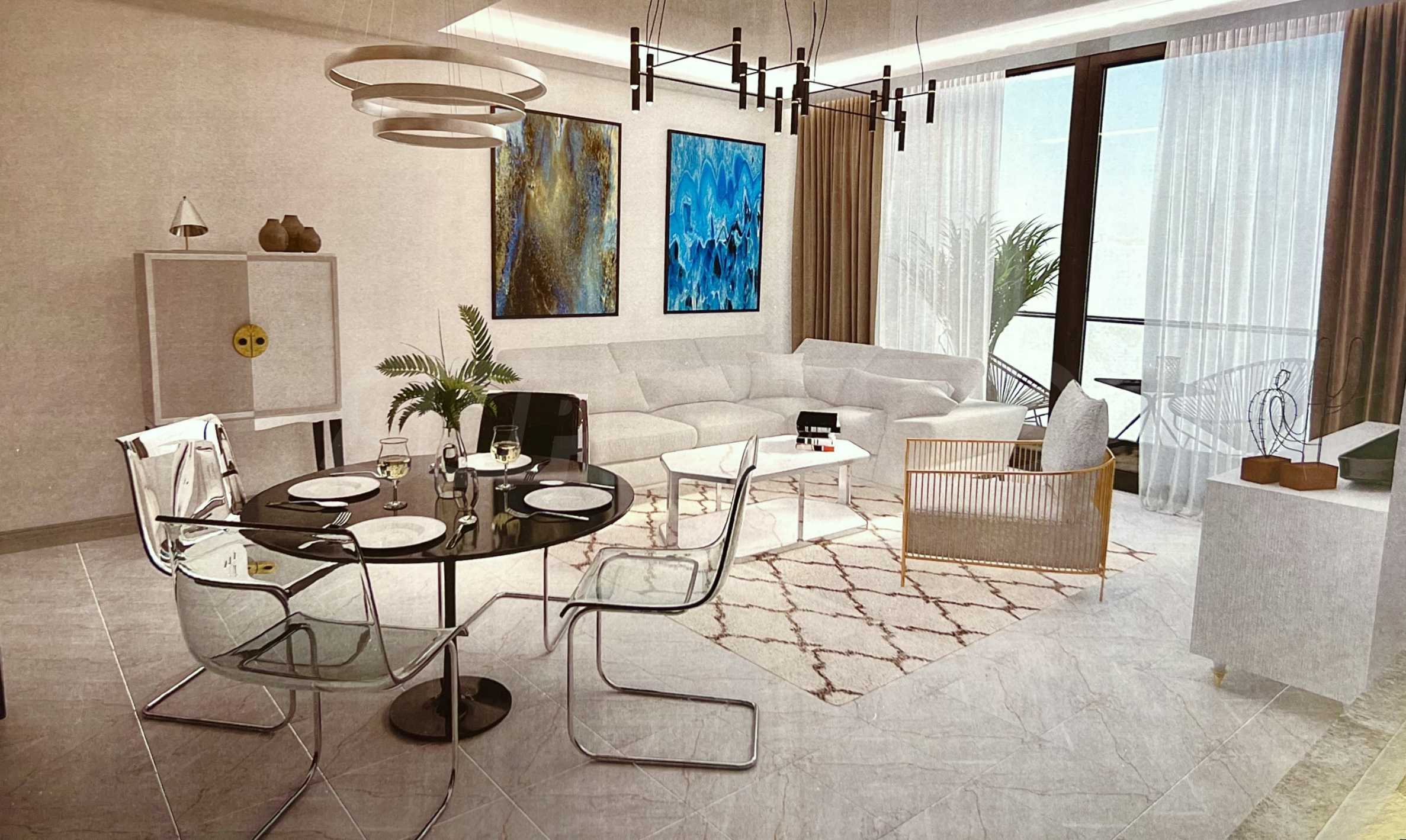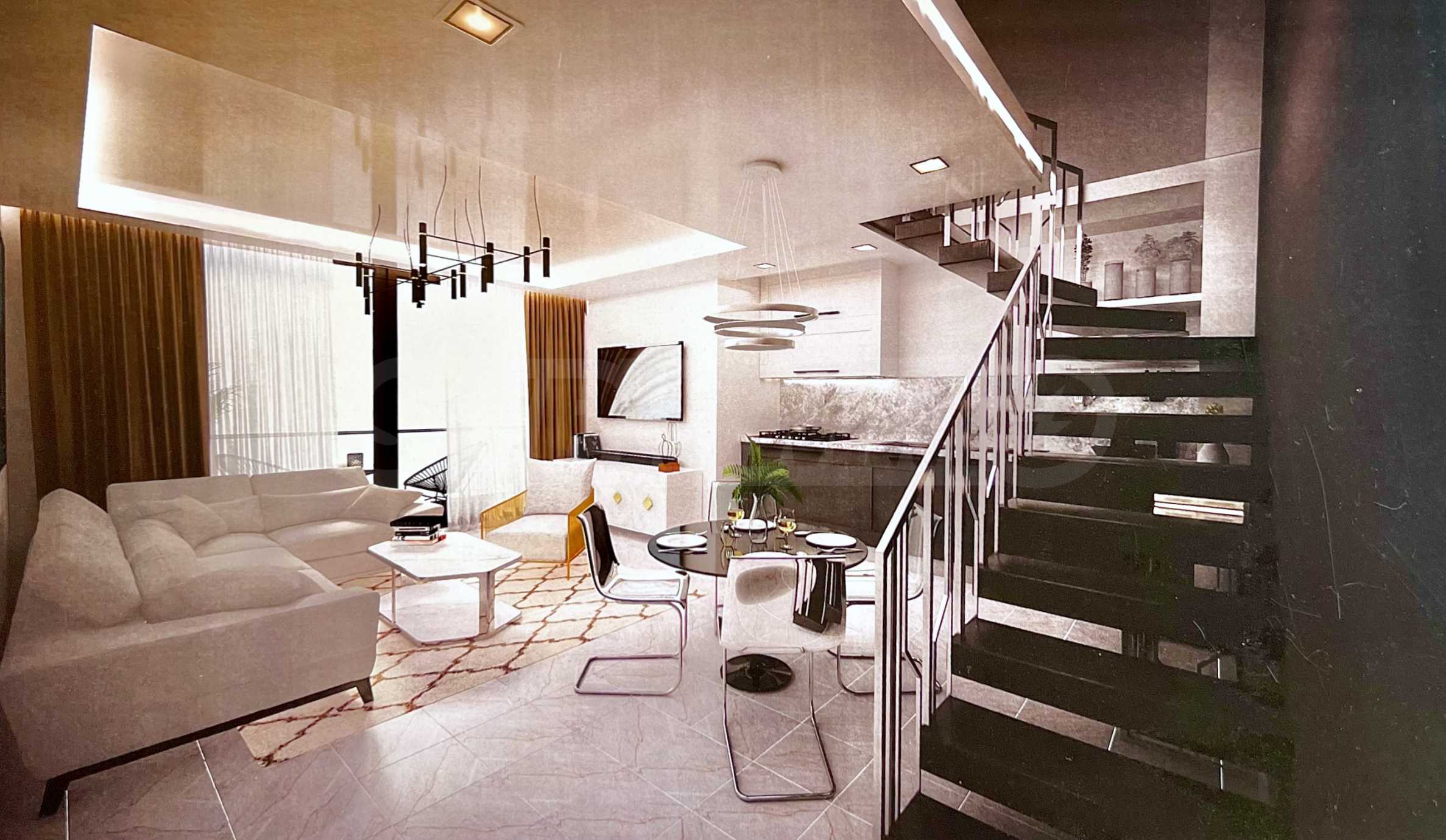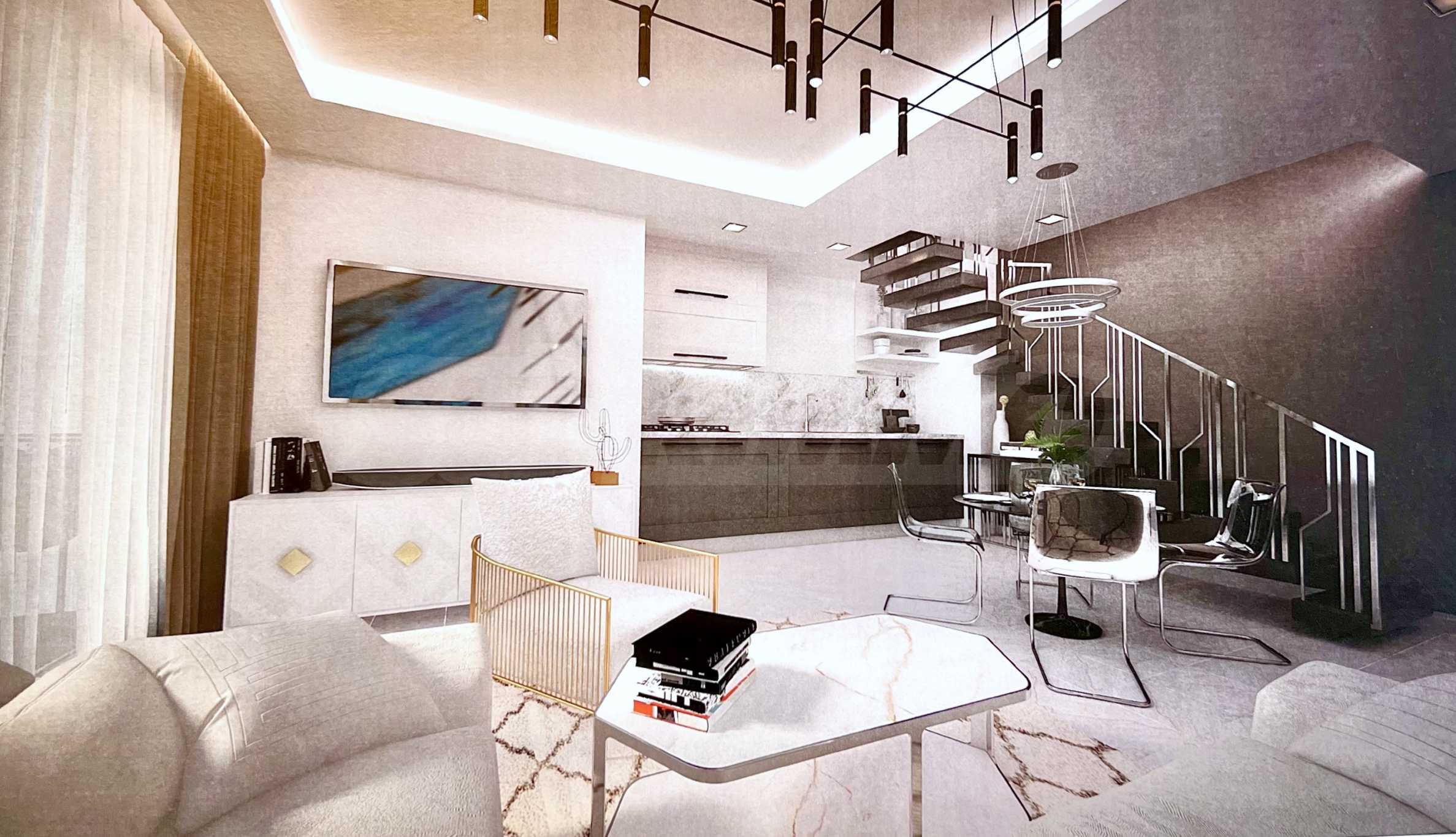 Представеният апартамент е разположен на 2-ри и 3-ти етаж и е с обща площ 92 кв.м удобно разпределена във всекидневна с кухненска част, две спални и две бани с тоалетна. Апартаментът се предава завършен „до ключ“, с входни и интериорни врати, преинсталация за климатици, и оборудвана баня с тоалетна.