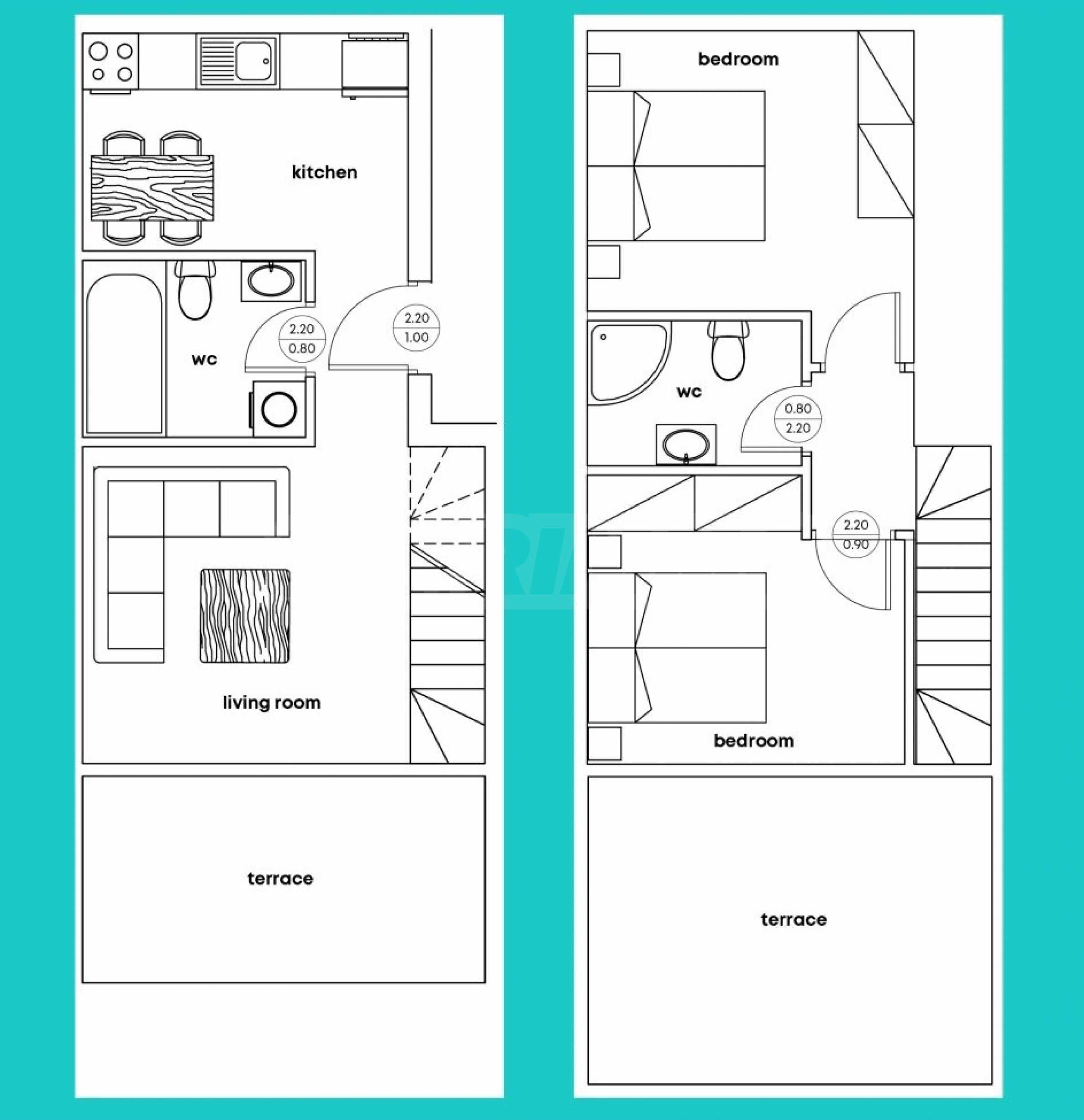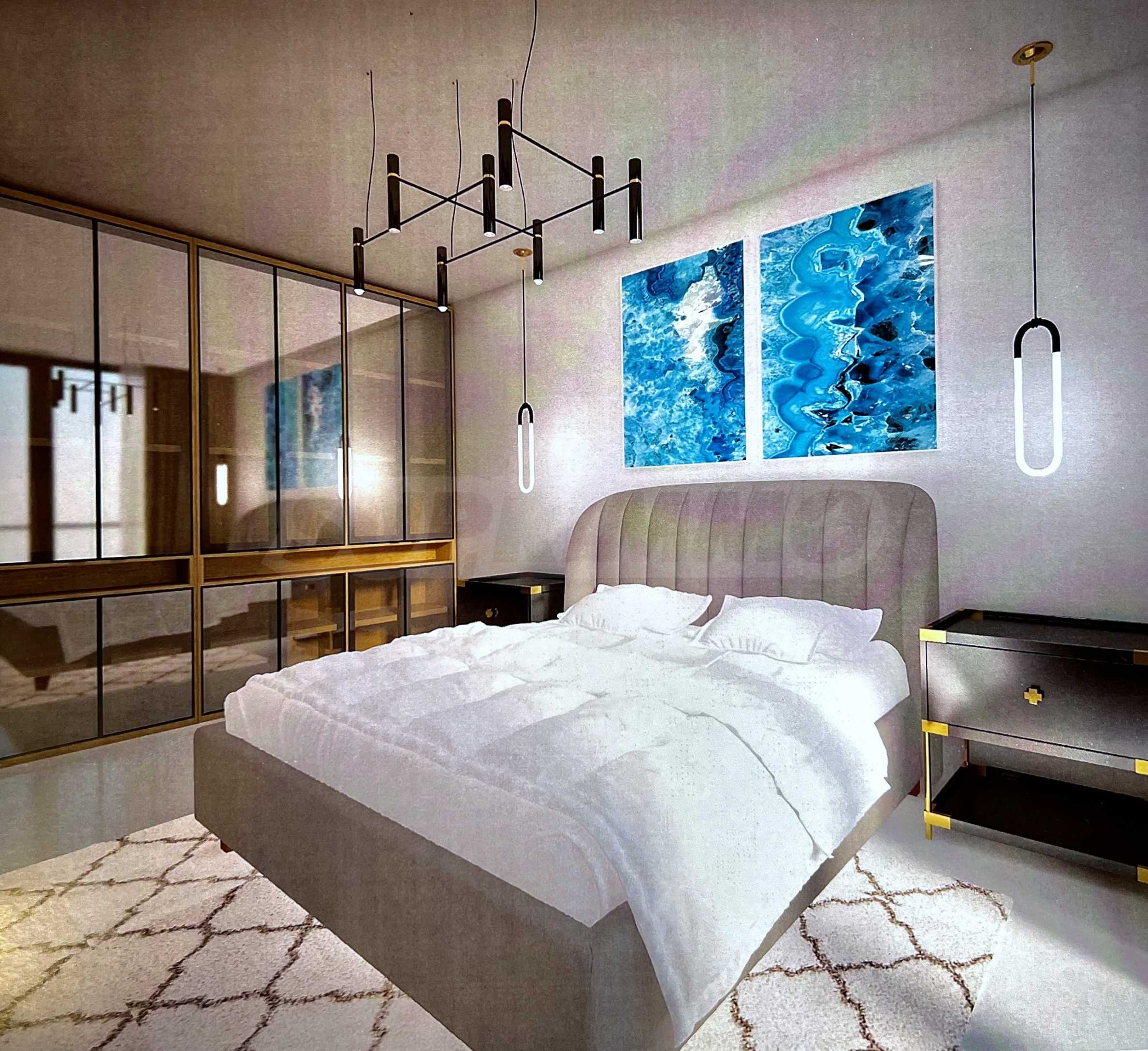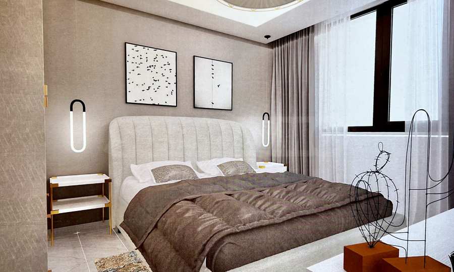 Представеният апартамент е разположен на 2-ри и 3-ти етаж и е с обща площ 92 кв.м удобно разпределена във всекидневна с кухненска част, две спални и две бани с тоалетна. Апартаментът се предава завършен „до ключ“, с входни и интериорни врати, преинсталация за климатици, и оборудвана баня с тоалетна.