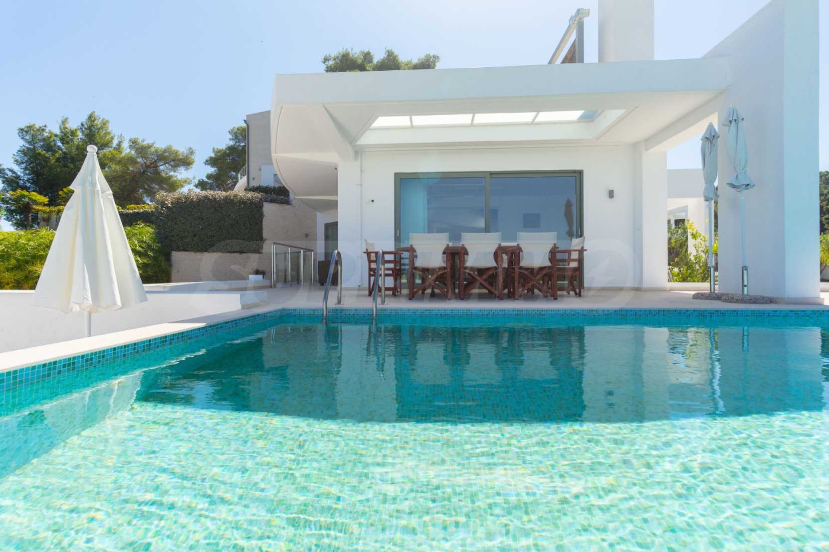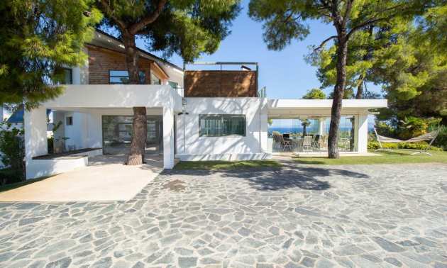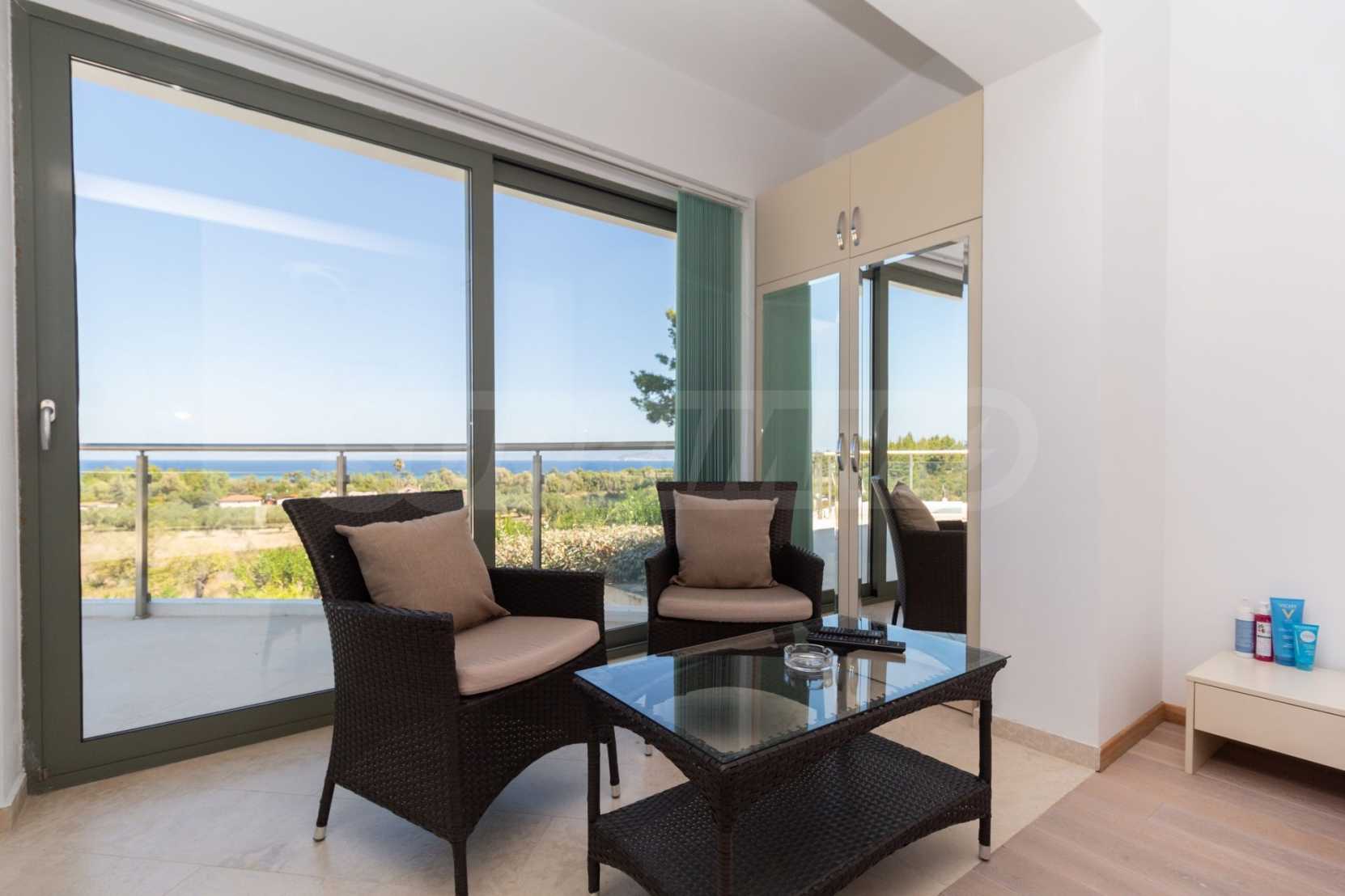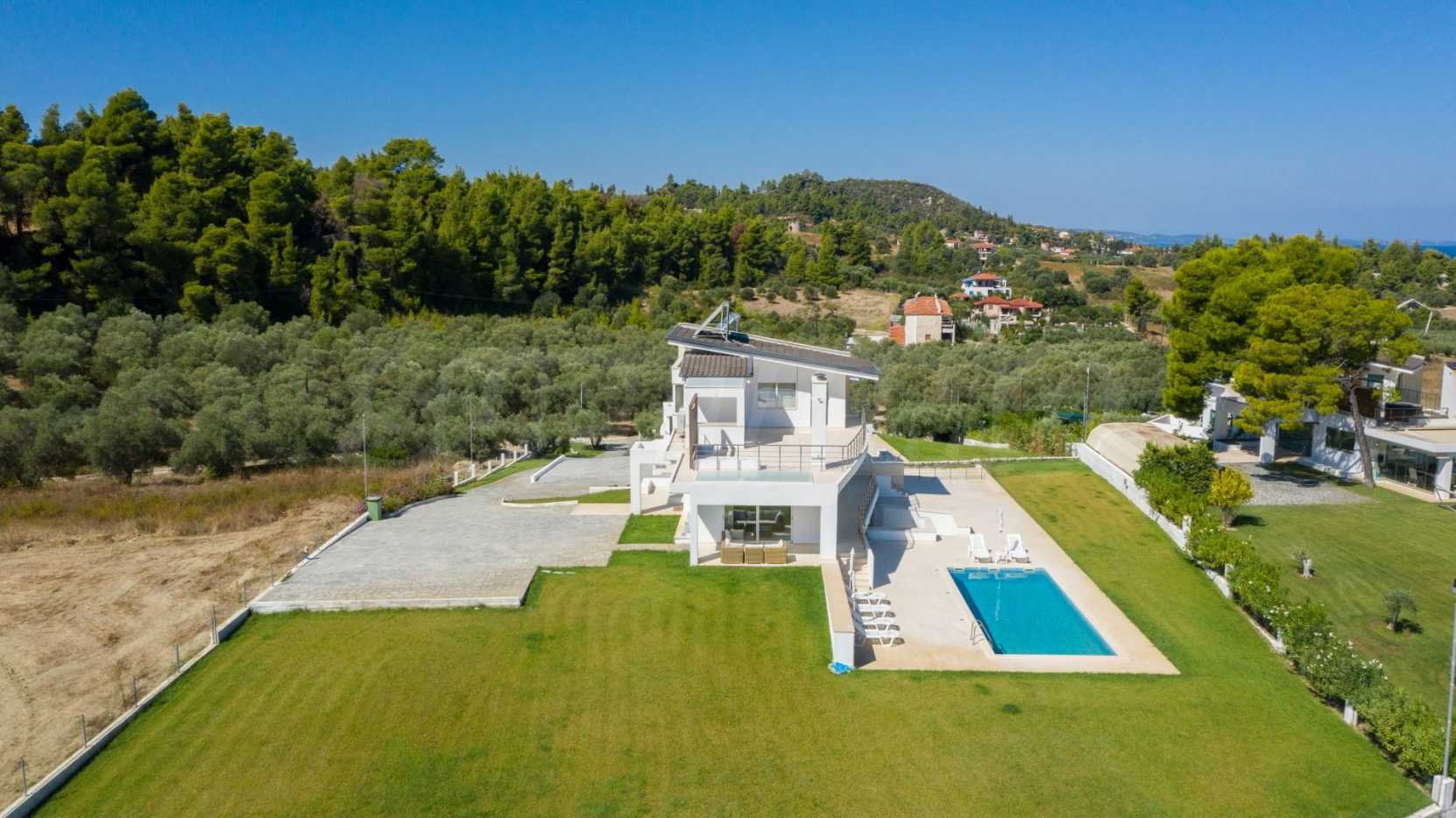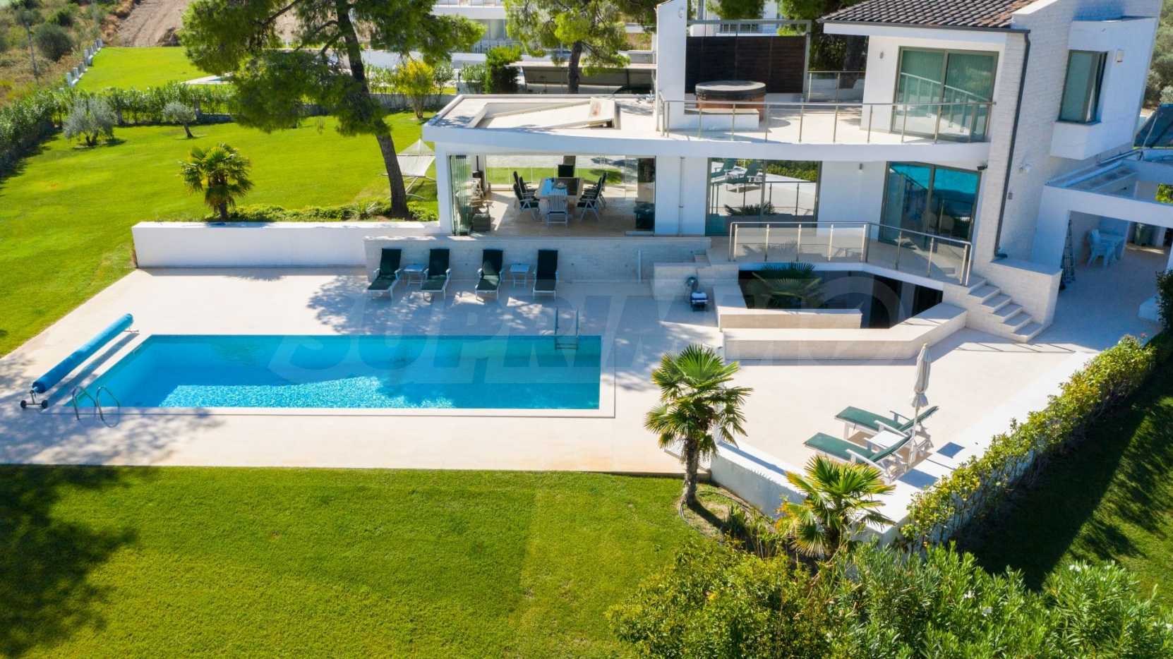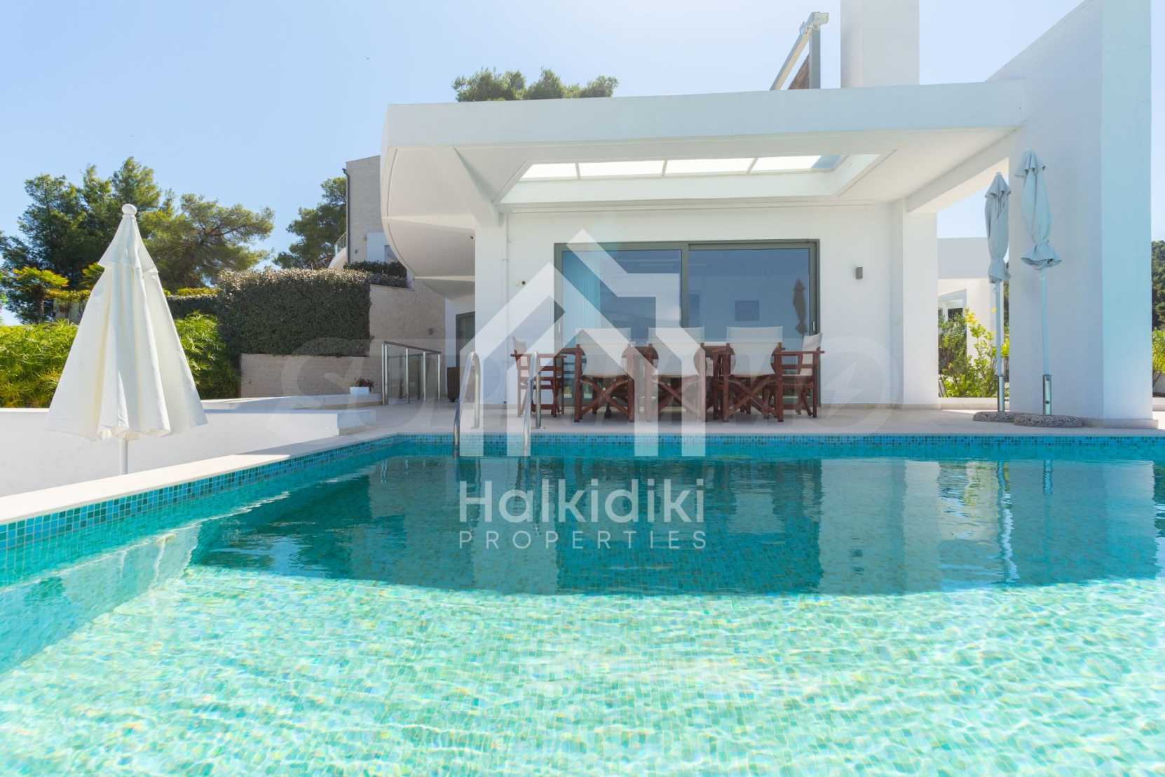 Луксозна резиденция. Красива самостоятелна къща с луксозен басейн, на забележително място в Касандра, в малкия рай на Халкидики. Имотът е разположен на площ от 2000 кв.м. , с изключителна морска панорама, Състои се от 3 нива с общо 330 кв.м. жилищна площ. Имотът включва 5 спални, 1 WC. , склад и 4 бани
