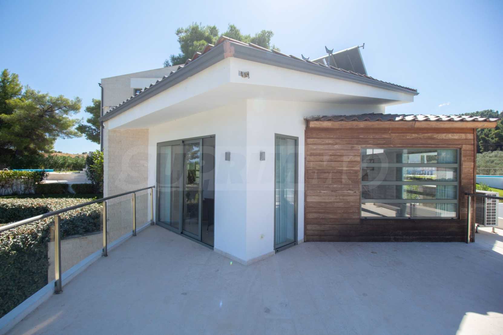 Луксозна резиденция. Красива самостоятелна къща с луксозен басейн, на забележително място в Касандра, в малкия рай на Халкидики. Имотът е разположен на площ от 2000 кв.м. , с изключителна морска панорама, Състои се от 3 нива с общо 330 кв.м. жилищна площ. Имотът включва 5 спални, 1 WC. , склад и 4 бани
