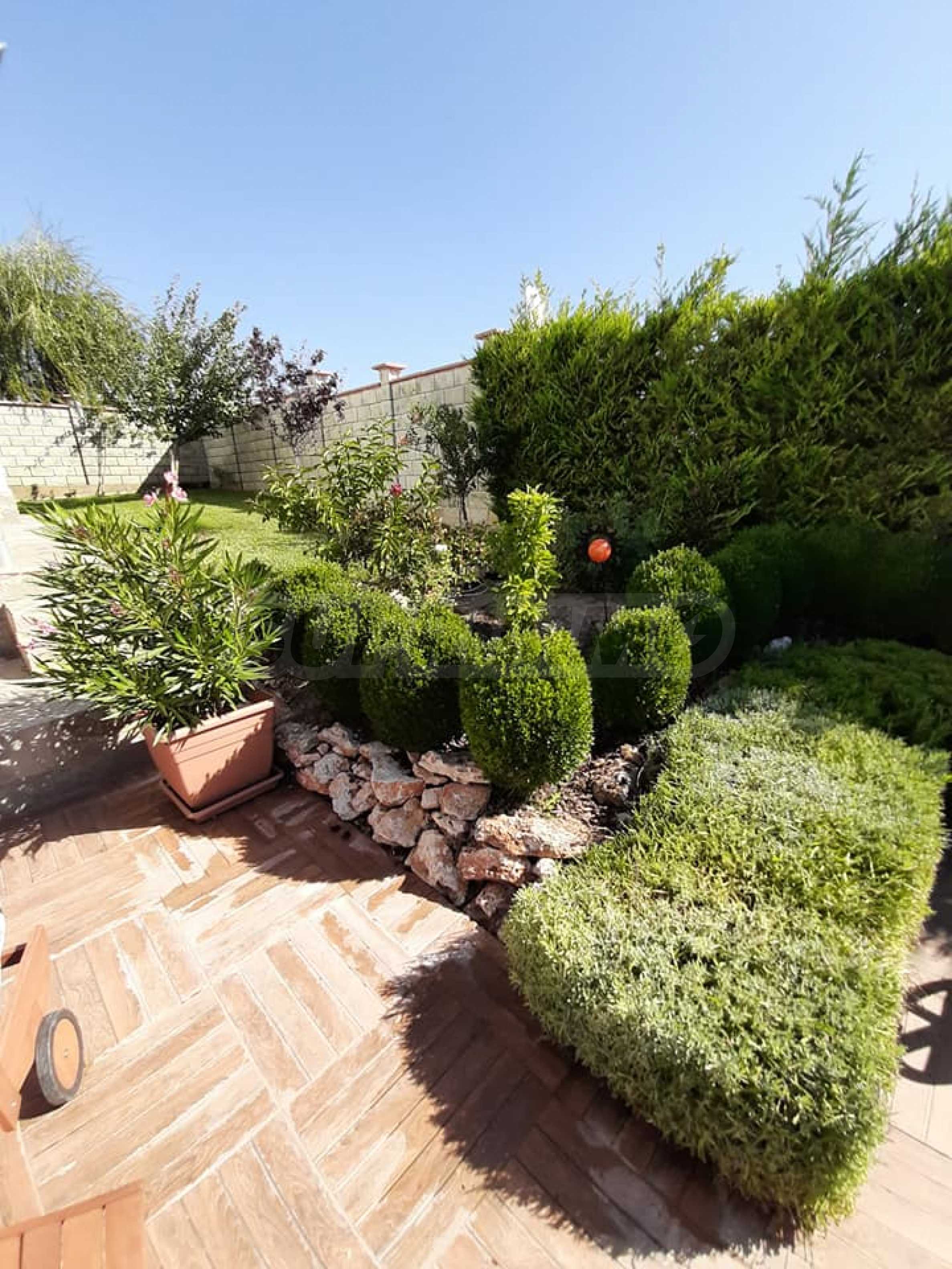 Има напоителна система за поддръжка на озеленяването, изградена масивна постройка от дърво за складиране на градински принадлежности.