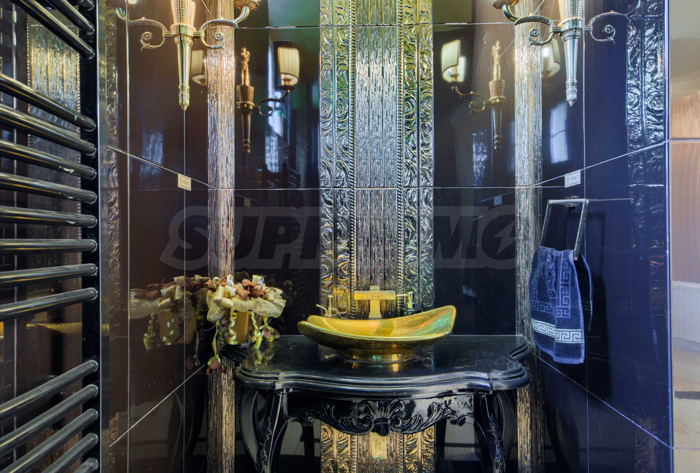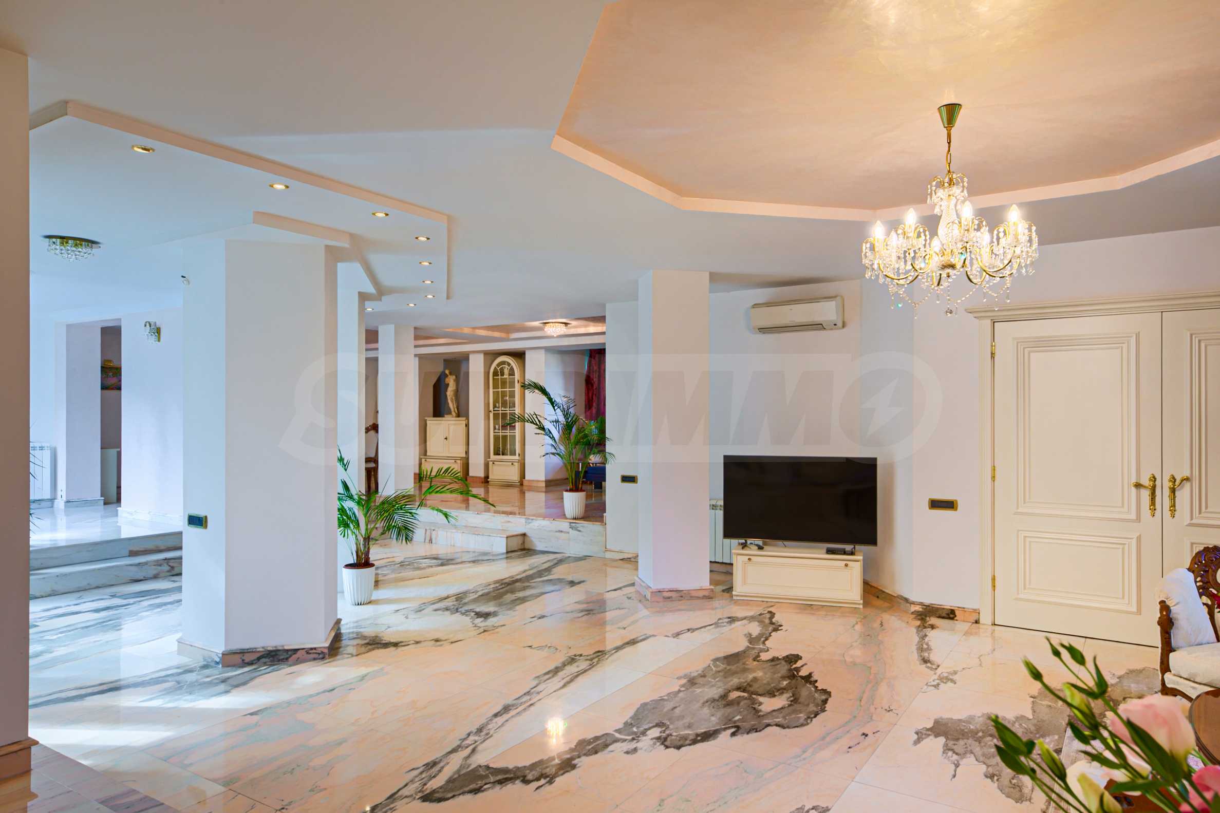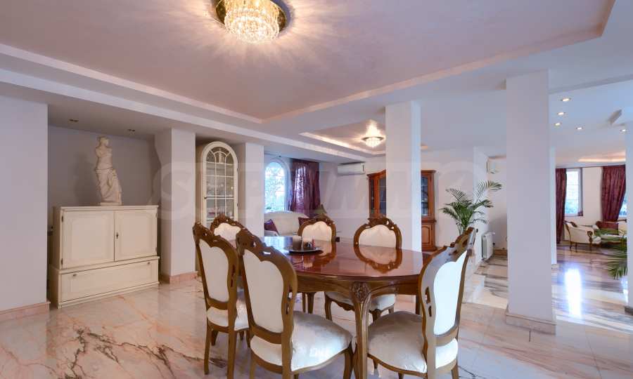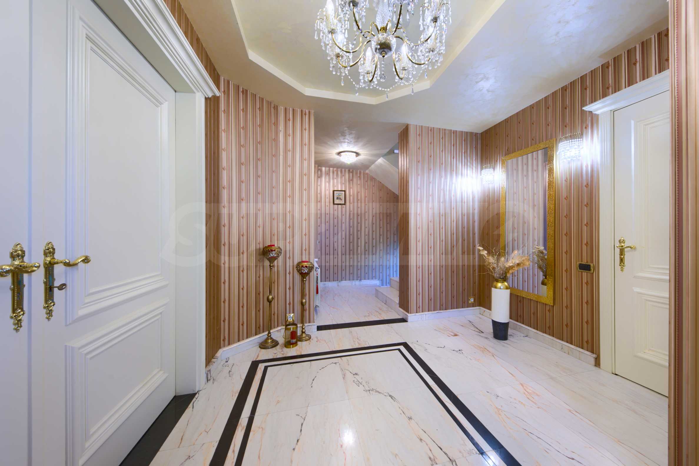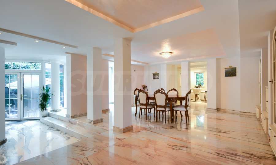 • първи етаж (230 кв.м): просторно антре, слънчева дневна със зимна градина и великолепна мраморна камина – реплика на камината в замъка "Балморал". На същия етаж се намират трапезария, кът за кафе, кухня в аристократичен ретро стил с осветителни тела Bohemia и Swarovski, както и баня за гости в изискано черно-златно Versace оформление. От дневната има директен достъп към двора.
