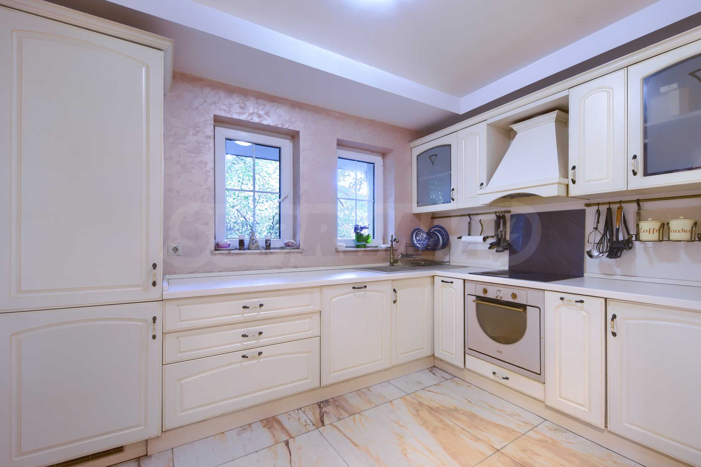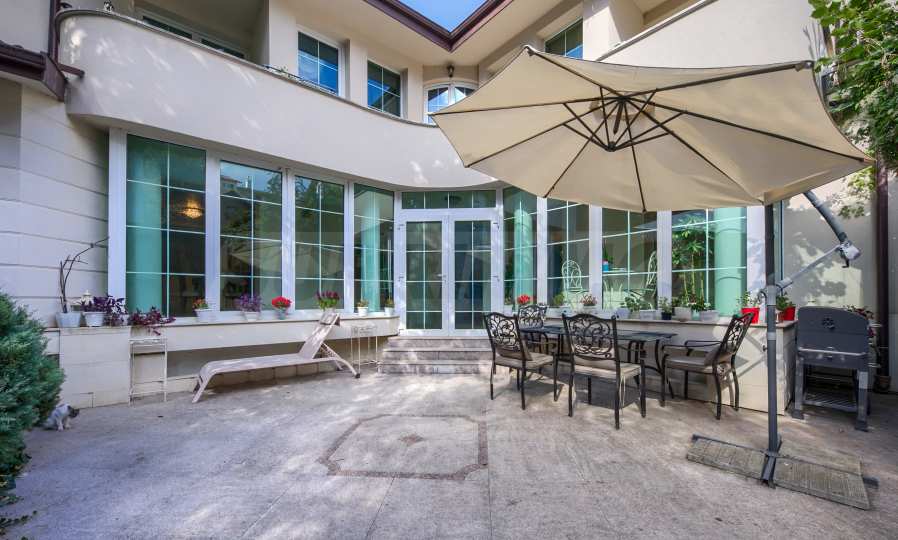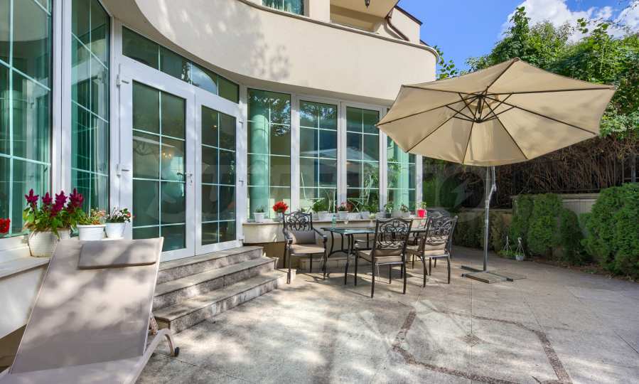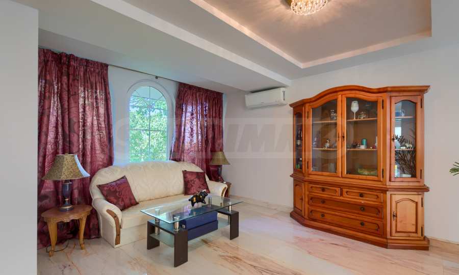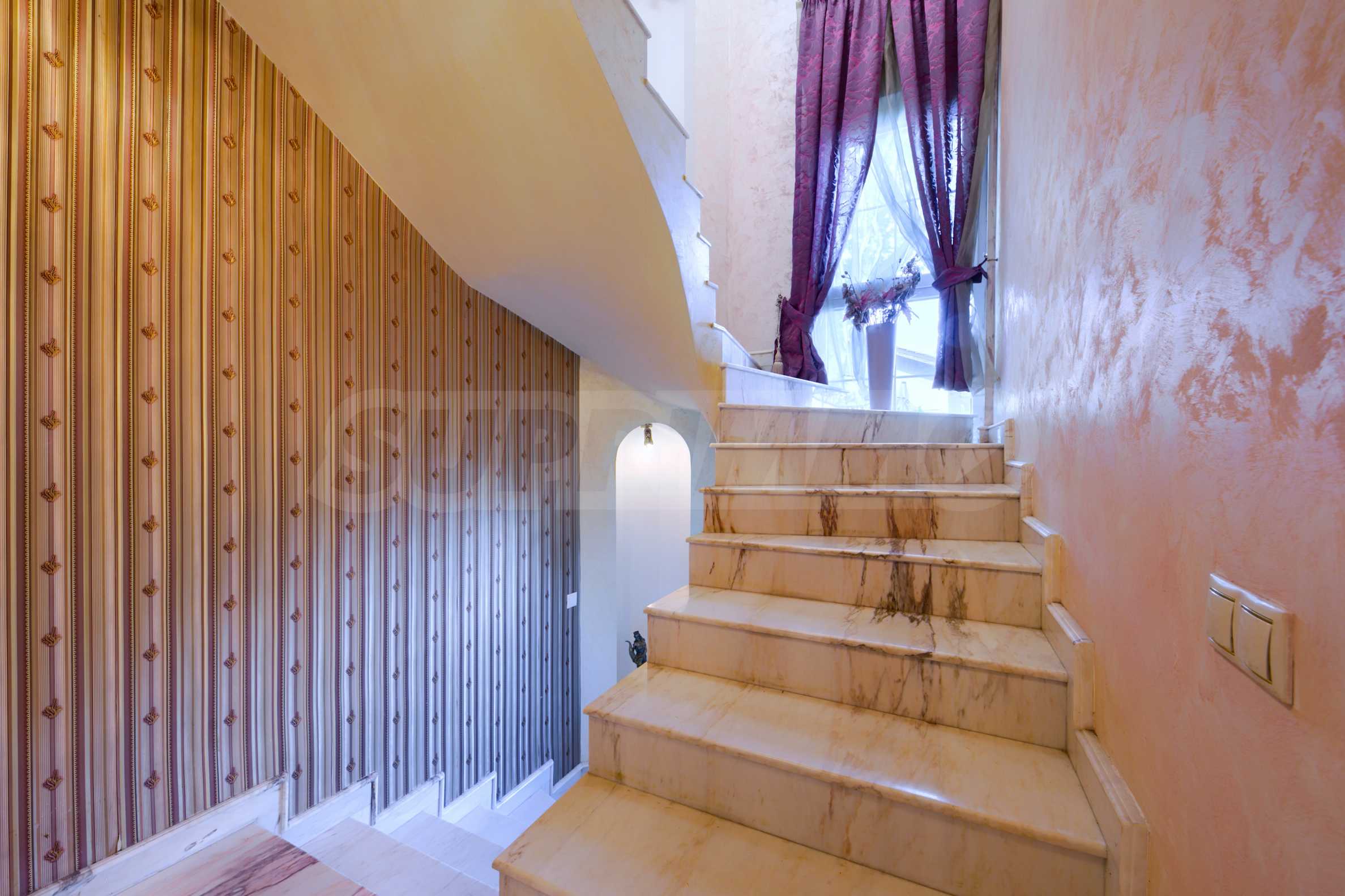 • първи етаж (230 кв.м): просторно антре, слънчева дневна със зимна градина и великолепна мраморна камина – реплика на камината в замъка "Балморал". На същия етаж се намират трапезария, кът за кафе, кухня в аристократичен ретро стил с осветителни тела Bohemia и Swarovski, както и баня за гости в изискано черно-златно Versace оформление. От дневната има директен достъп към двора.
