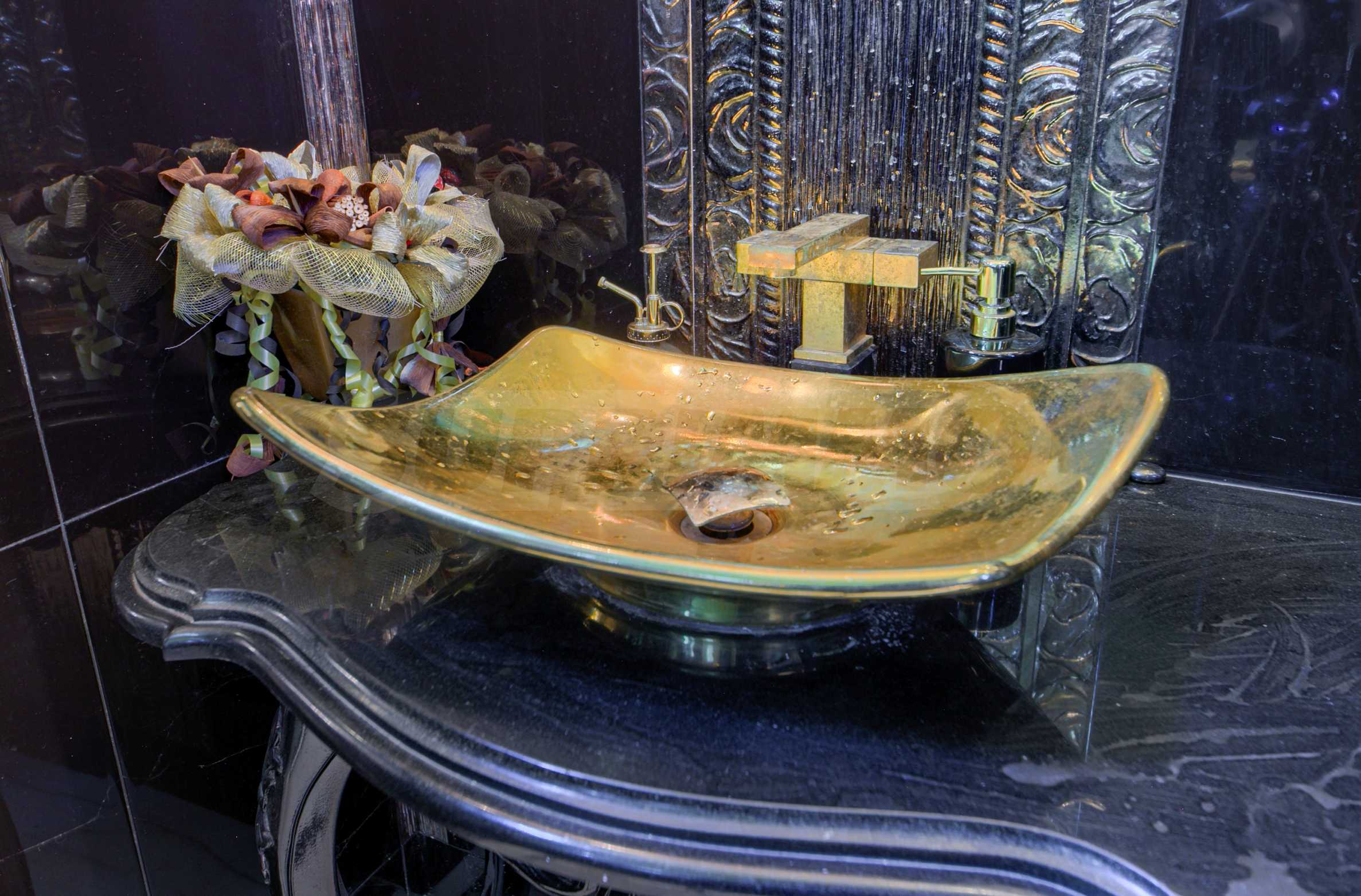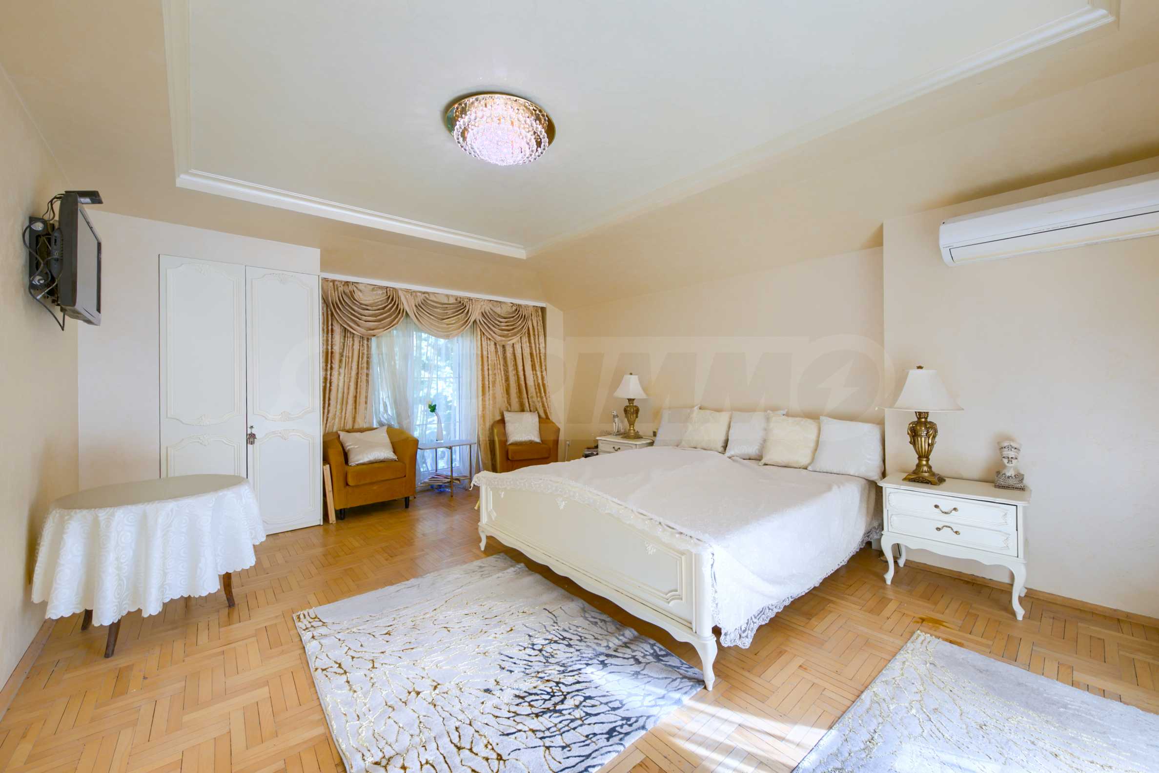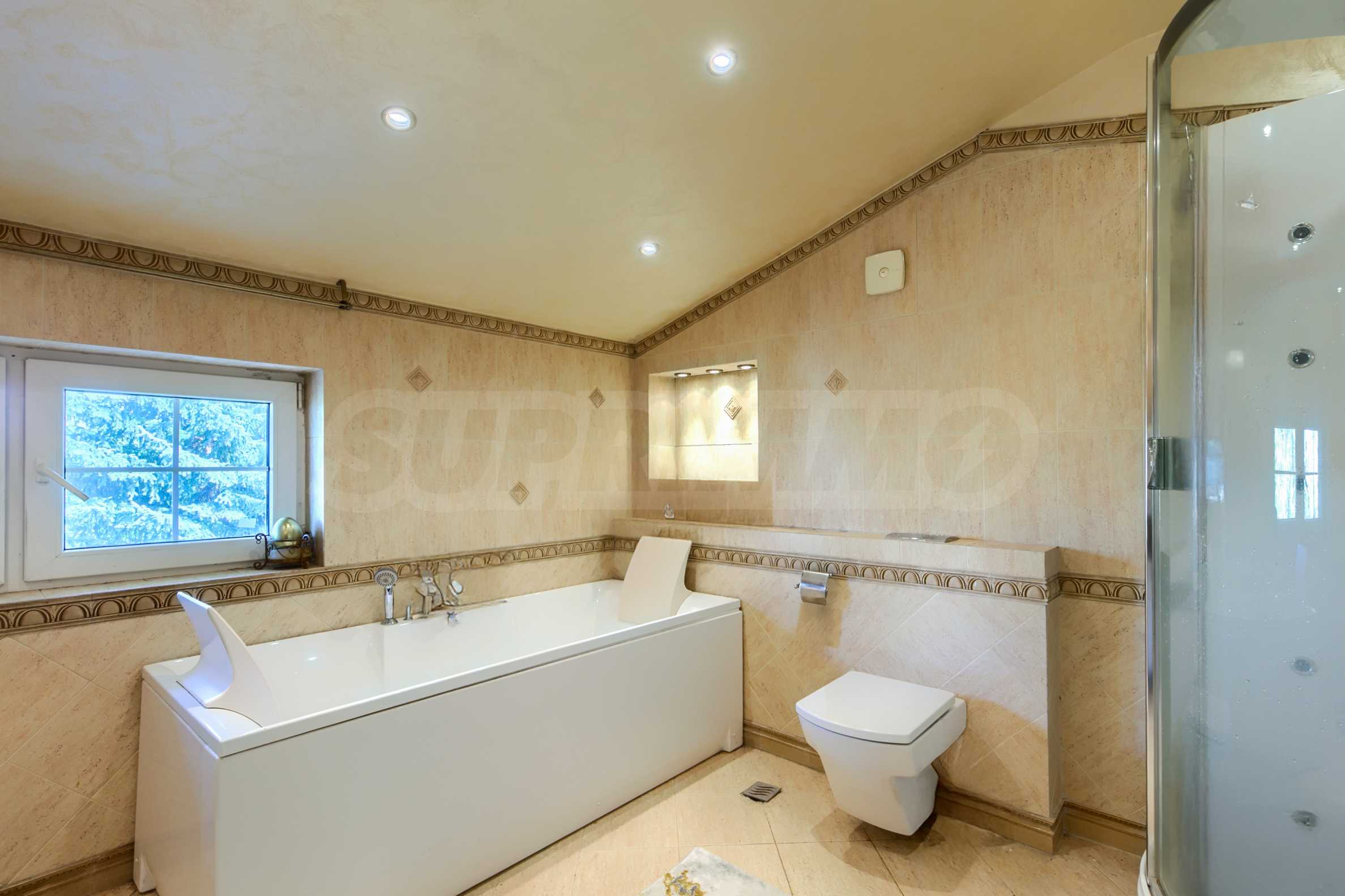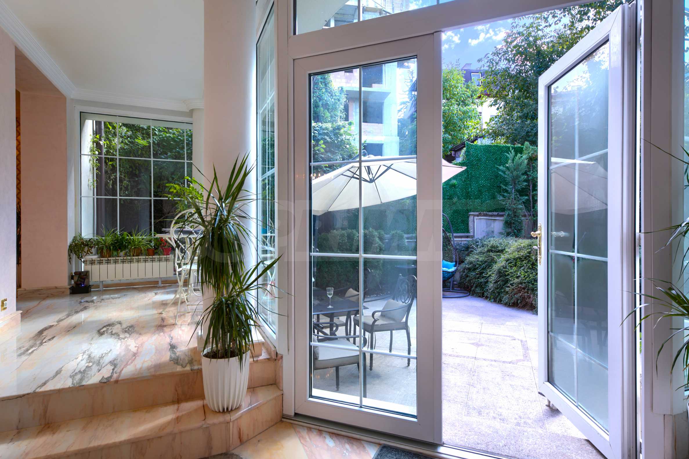 • първи етаж (230 кв.м): просторно антре, слънчева дневна със зимна градина и великолепна мраморна камина – реплика на камината в замъка "Балморал". На същия етаж се намират трапезария, кът за кафе, кухня в аристократичен ретро стил с осветителни тела Bohemia и Swarovski, както и баня за гости в изискано черно-златно Versace оформление. От дневната има директен достъп към двора.