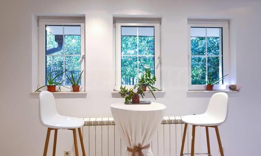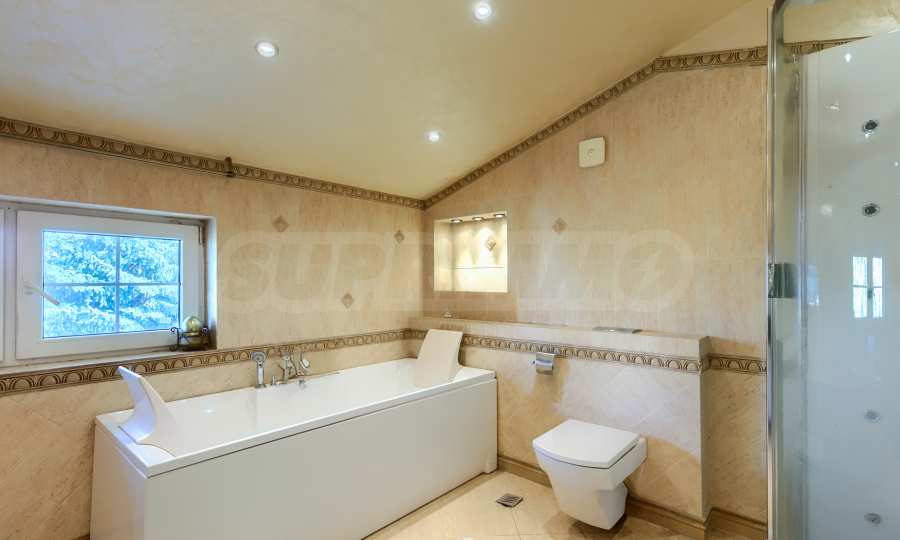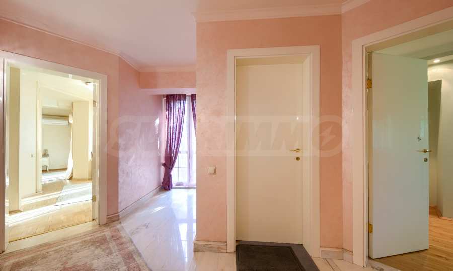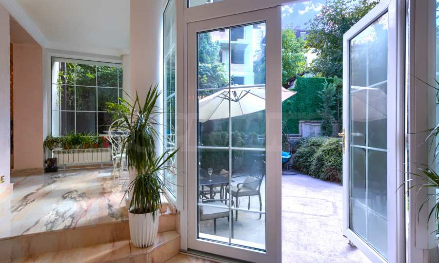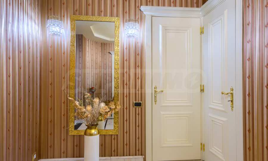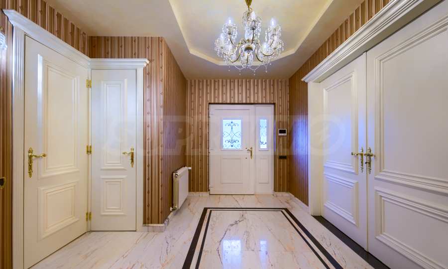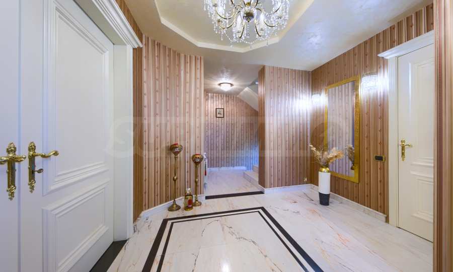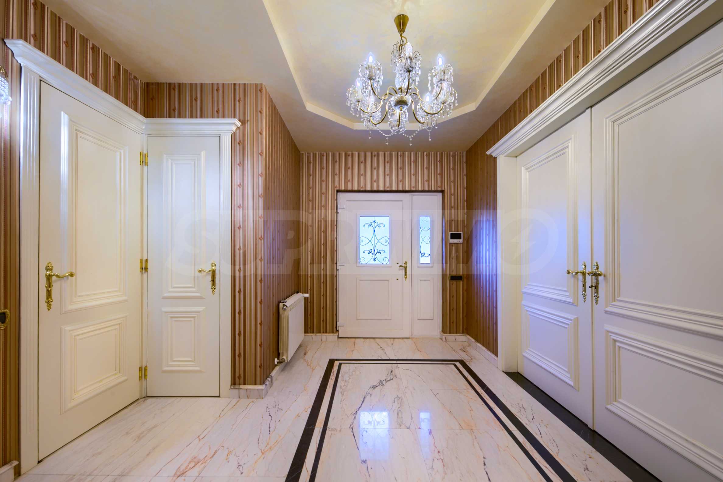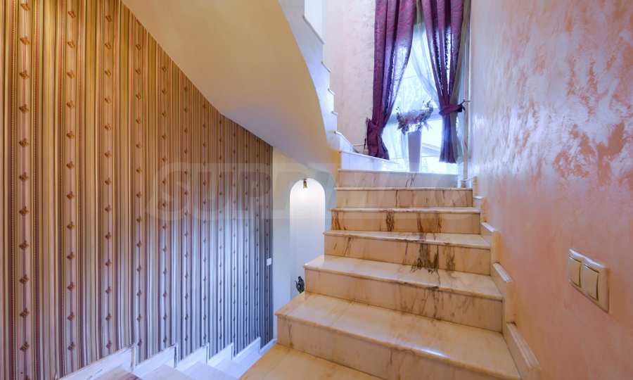 Вътрешното пространство е изпълнено с лукс и внимание към детайла: подовете са покрити с рядък розов мрамор Rosso Portogallo, стените са изработени с Stucco Veneziano и Suahili мазилки, а дограмата Kömmerling с вградена бяла хелима придава завършеност и съвършен баланс между функционалност и естетика.