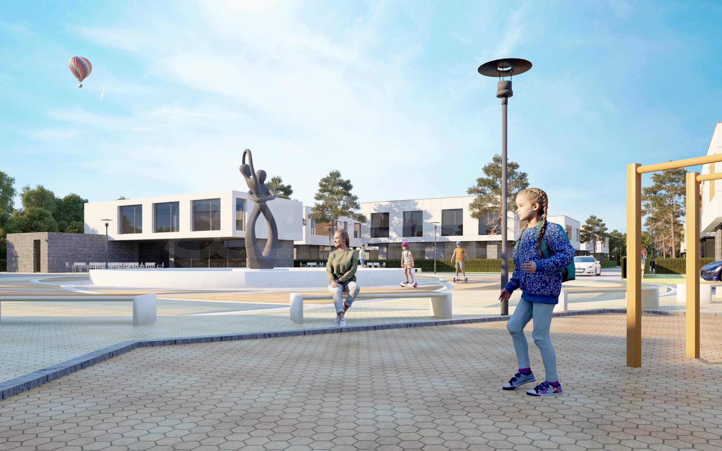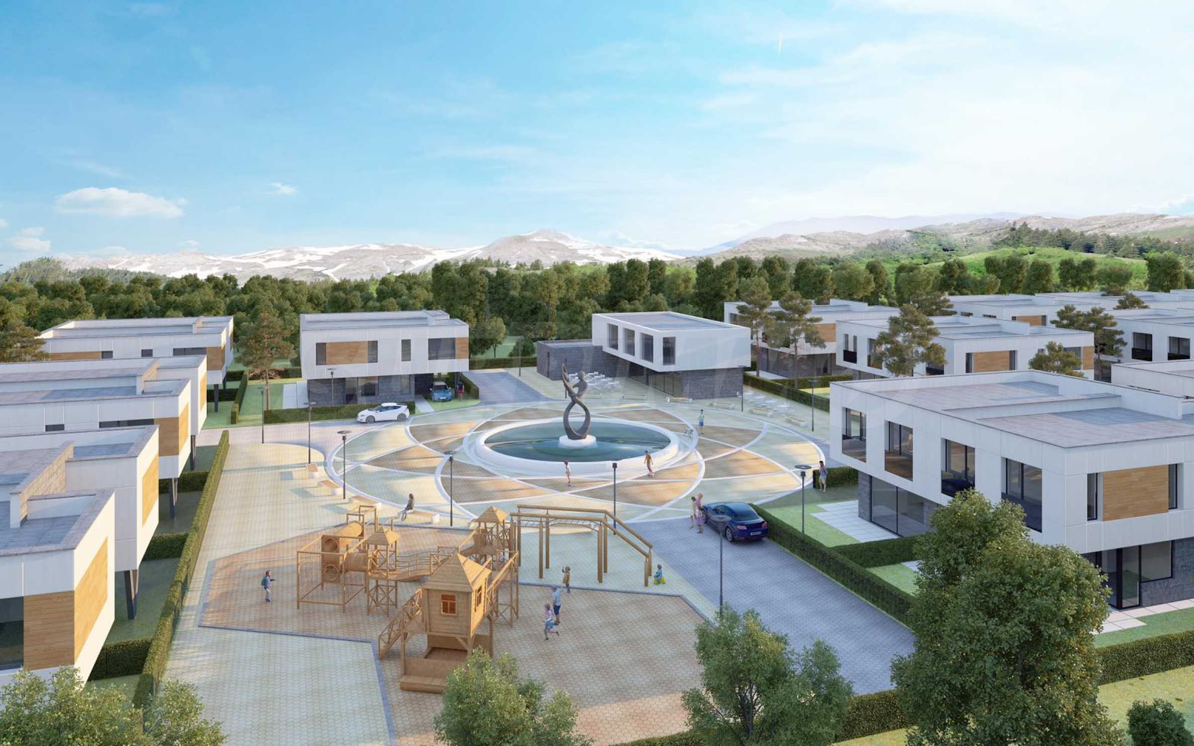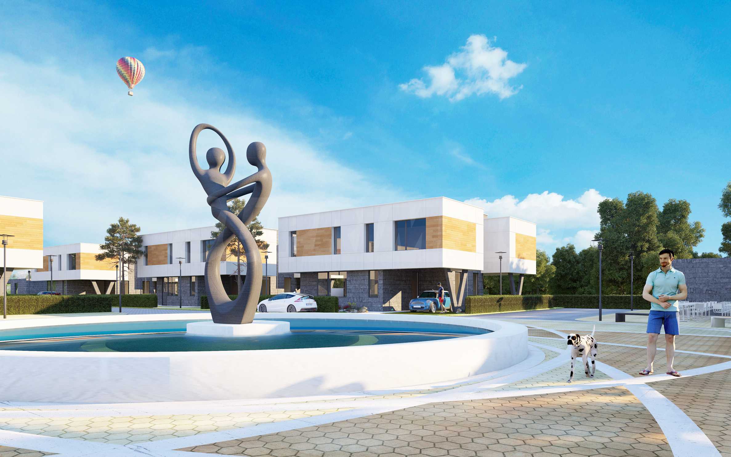 Къщите ще са заобиколени от собствени частни дворове, градини и места за почивка, а централното място в парка ще заема специално изработен и поставен по правилата на Фън Шуй фонтан. Към всяка къща ще има зарядни за електрически коли.
