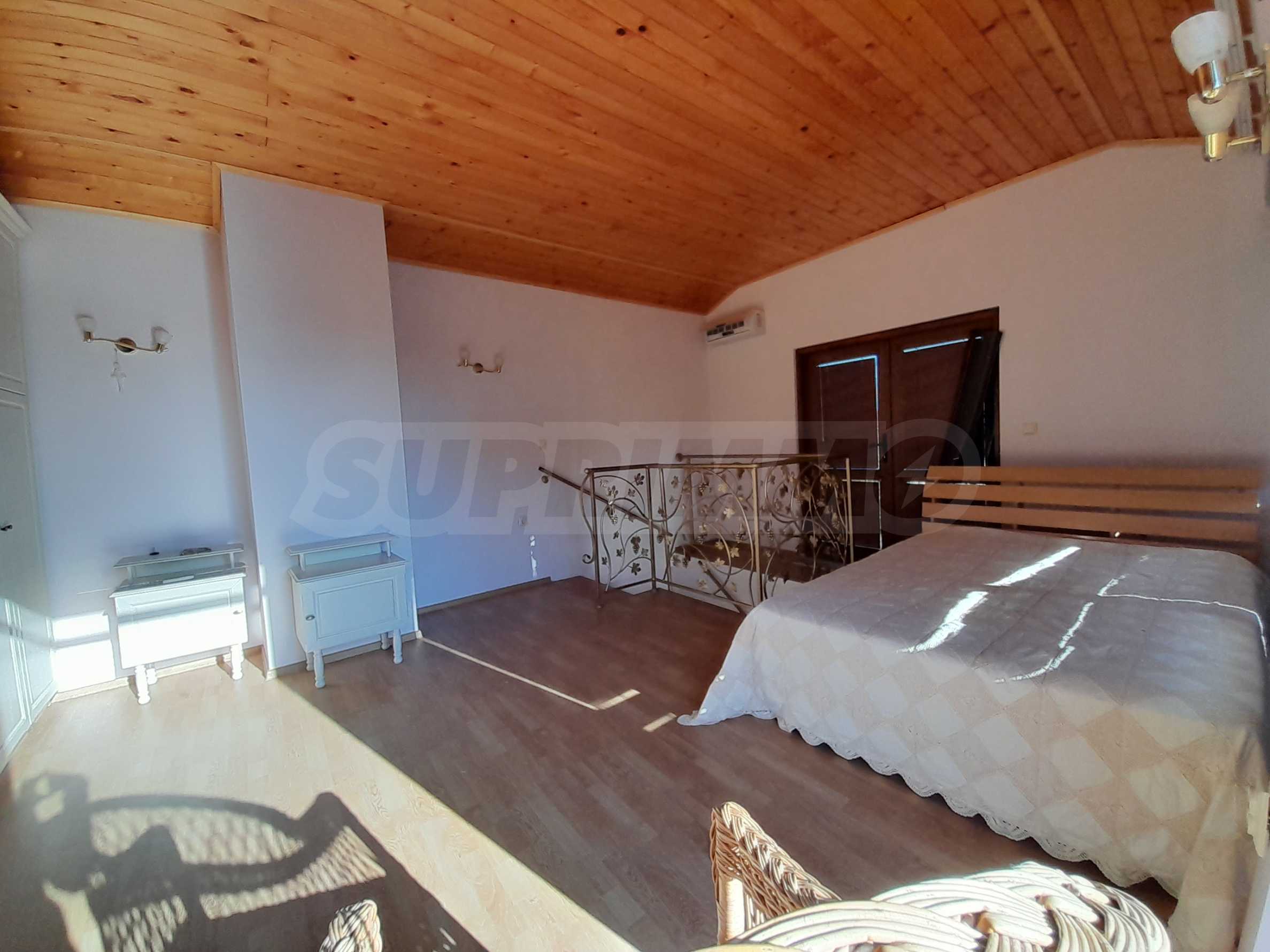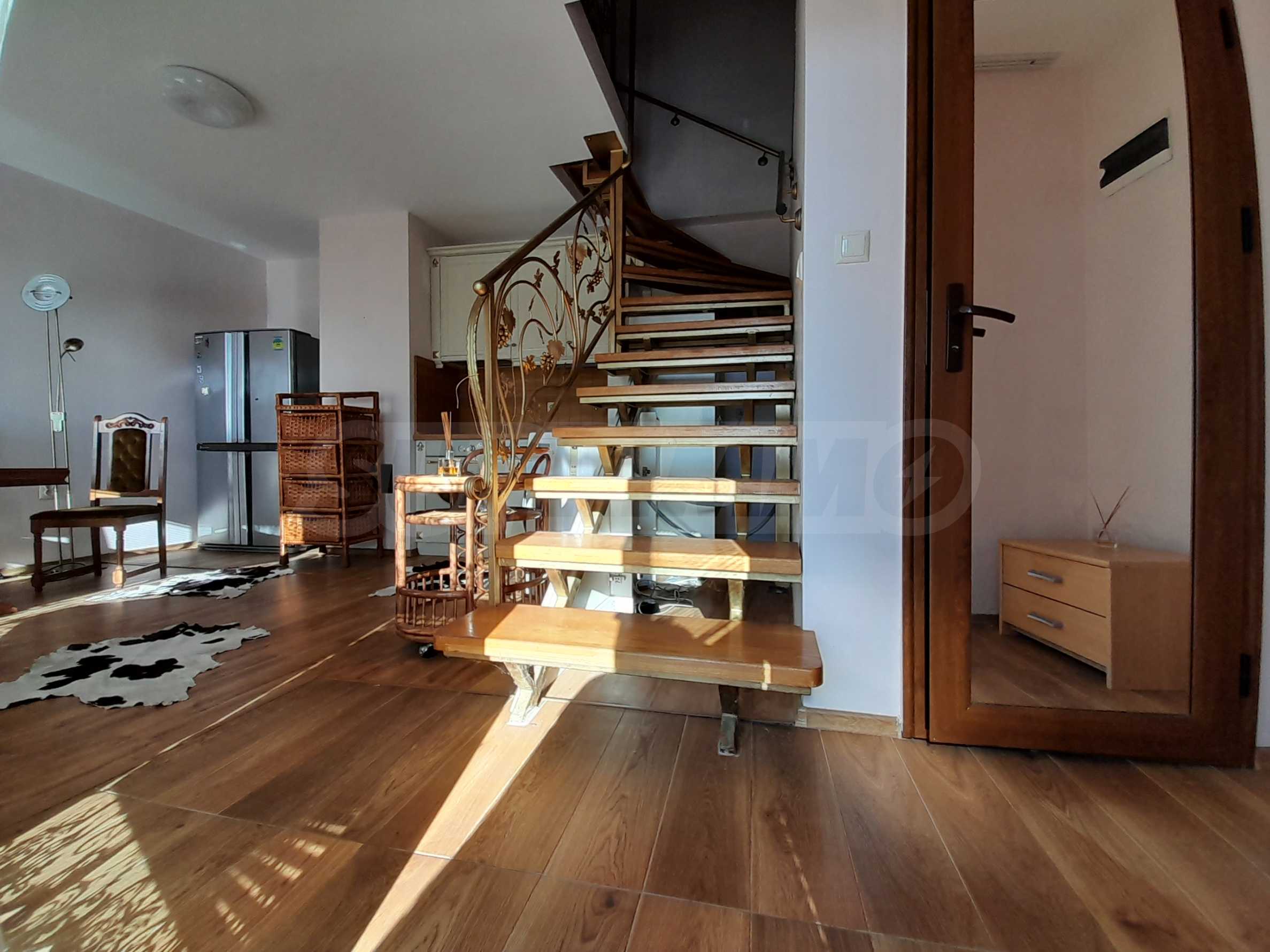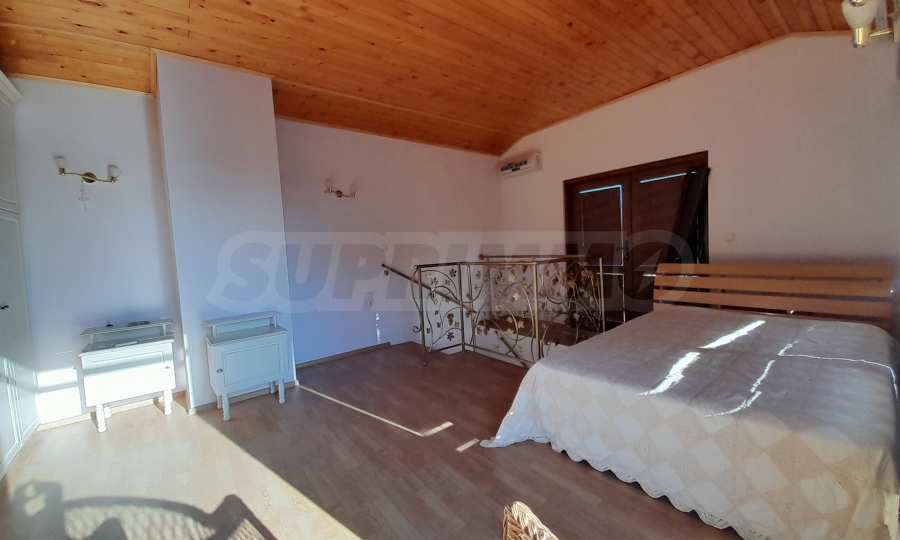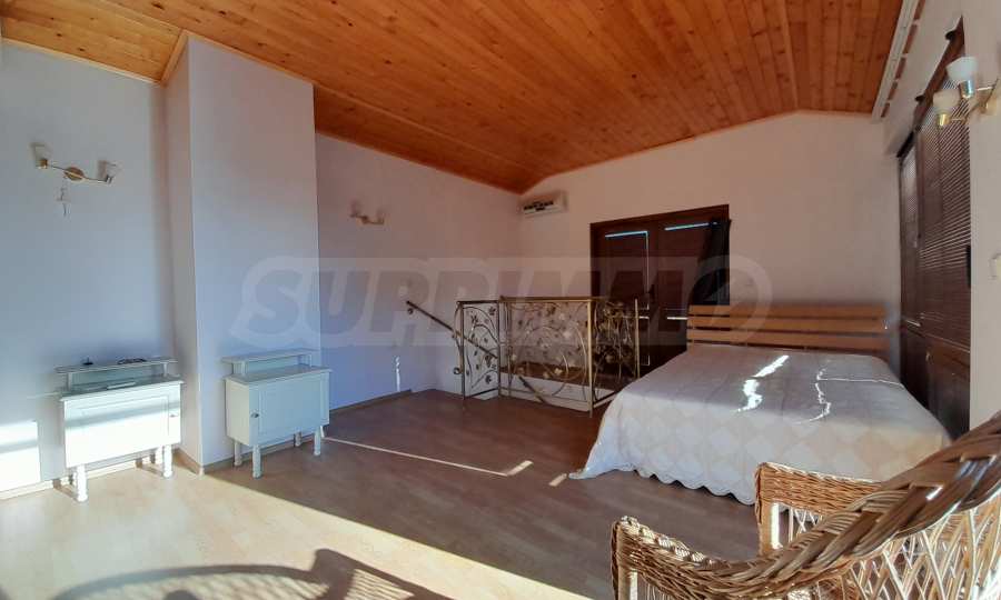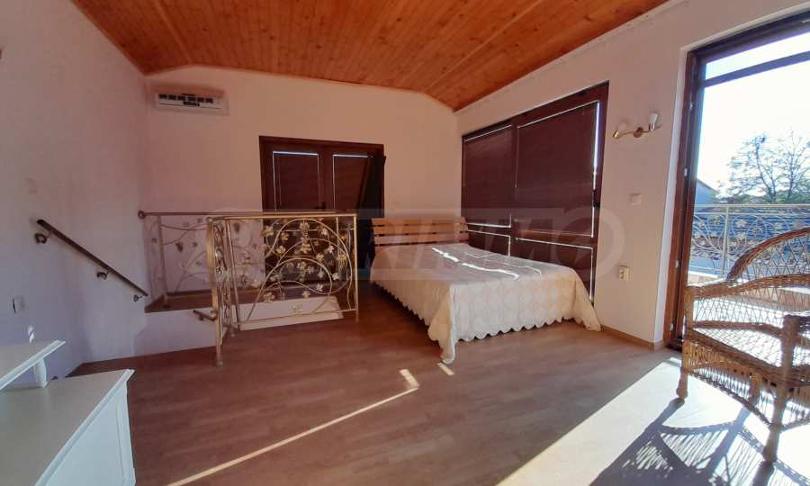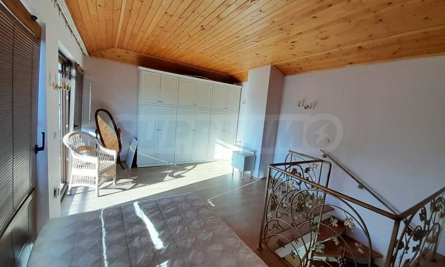 Изкачването на втория етаж е по вита стълба, с декоративни бронзови елементи. На горното ниво е разположена спалня, с шкафове, трикрилен гардероб и ретро огледало.