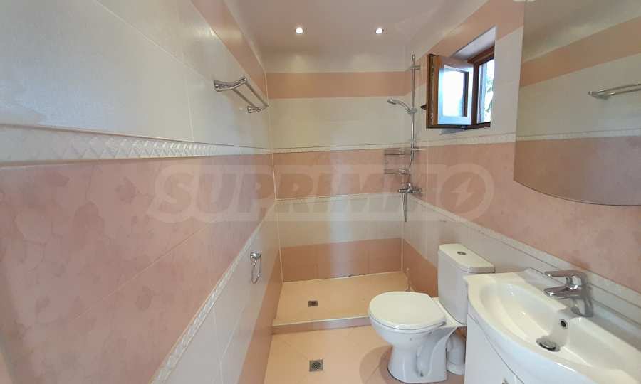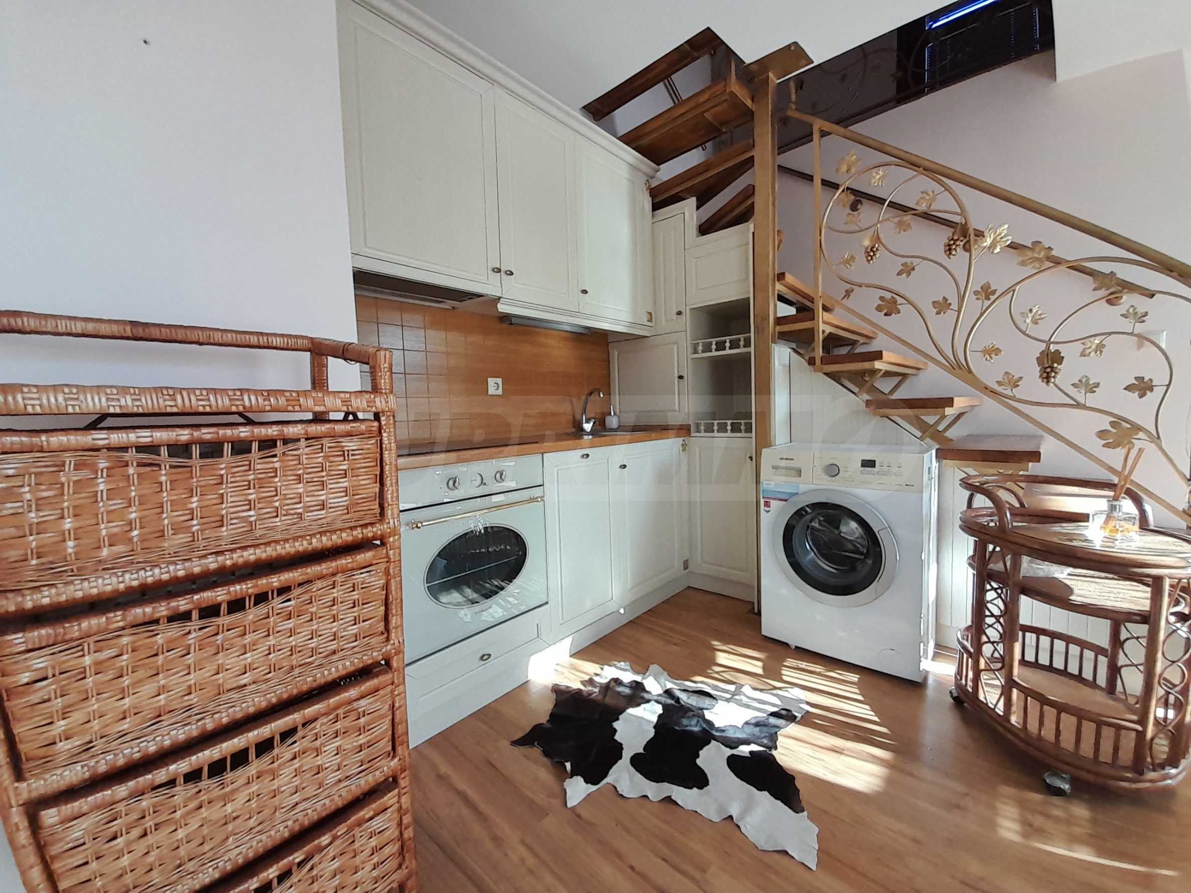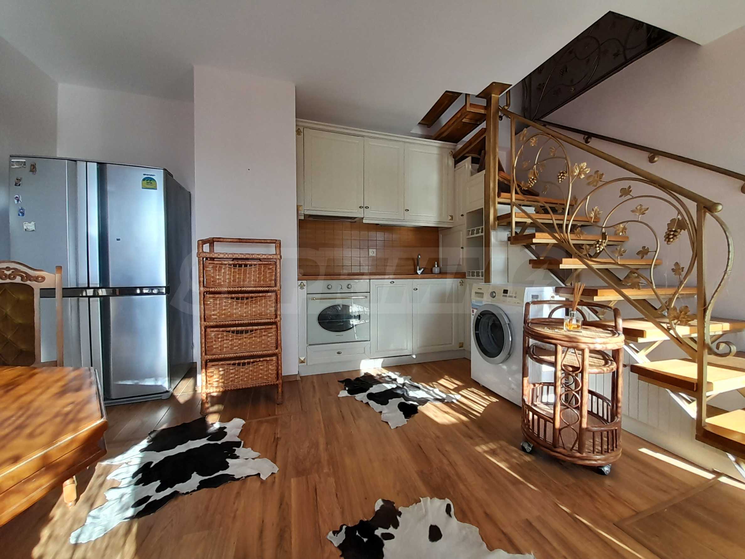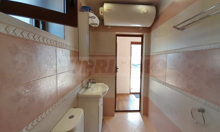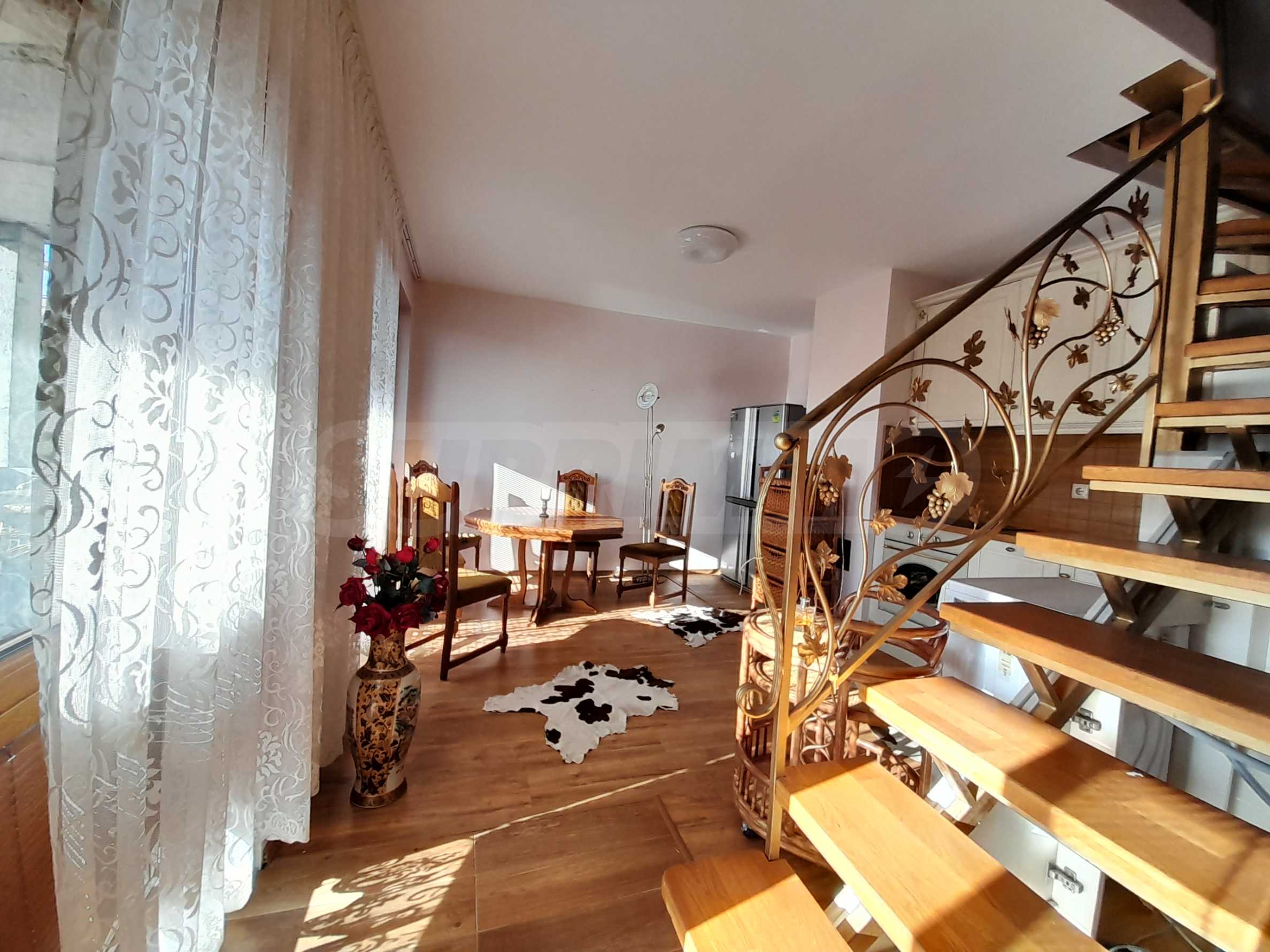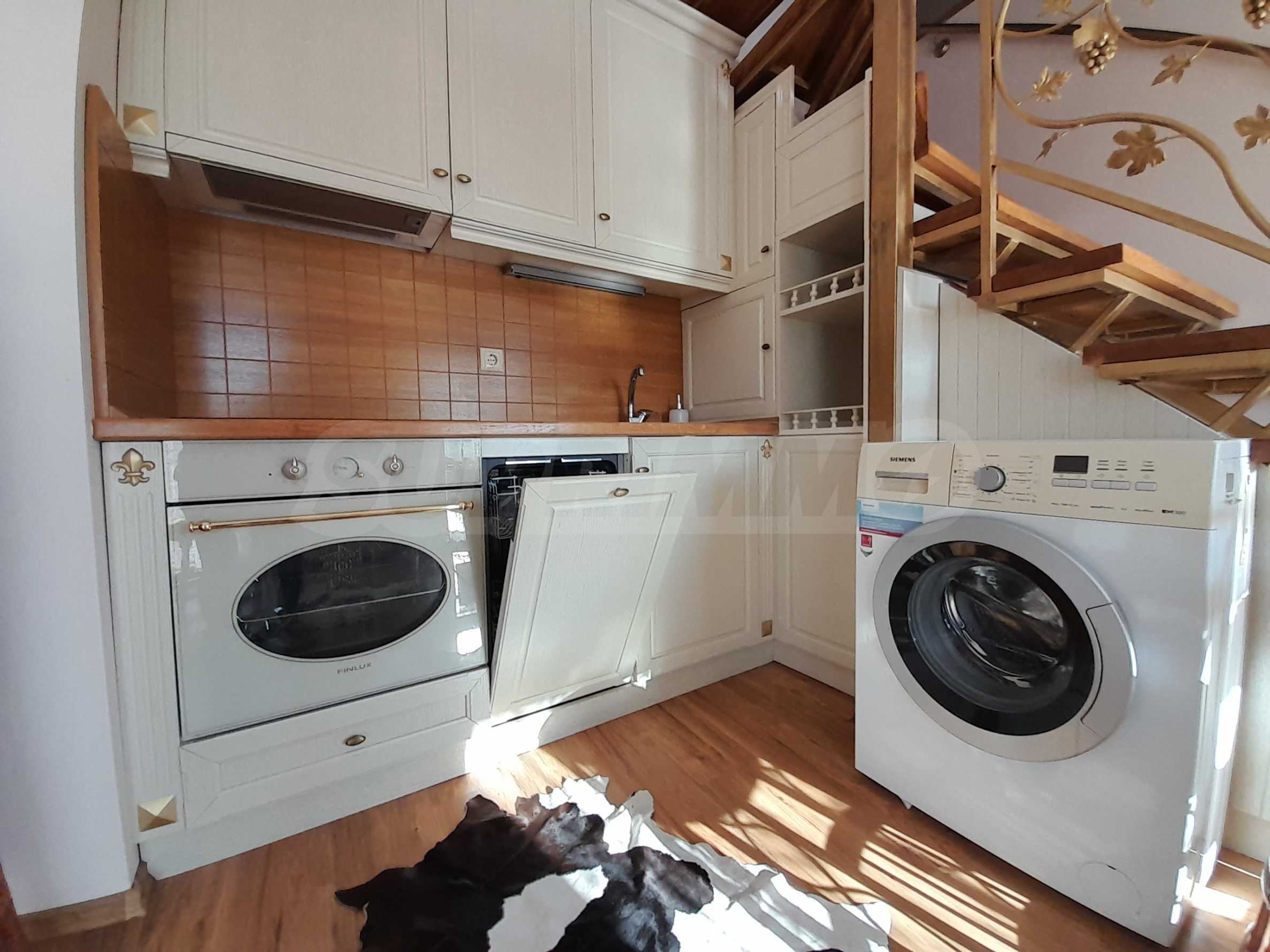 На първия етаж обзавеждането е чисто ново, подбрано с вкус: вградена кухня с уреди висок клас - двукрилен хладилник с фризер, печка, котлони, съдомиялна машина, аспиратор и перална машина; шестоъгълна маса и масивни столове са поставени в дневния тракт.