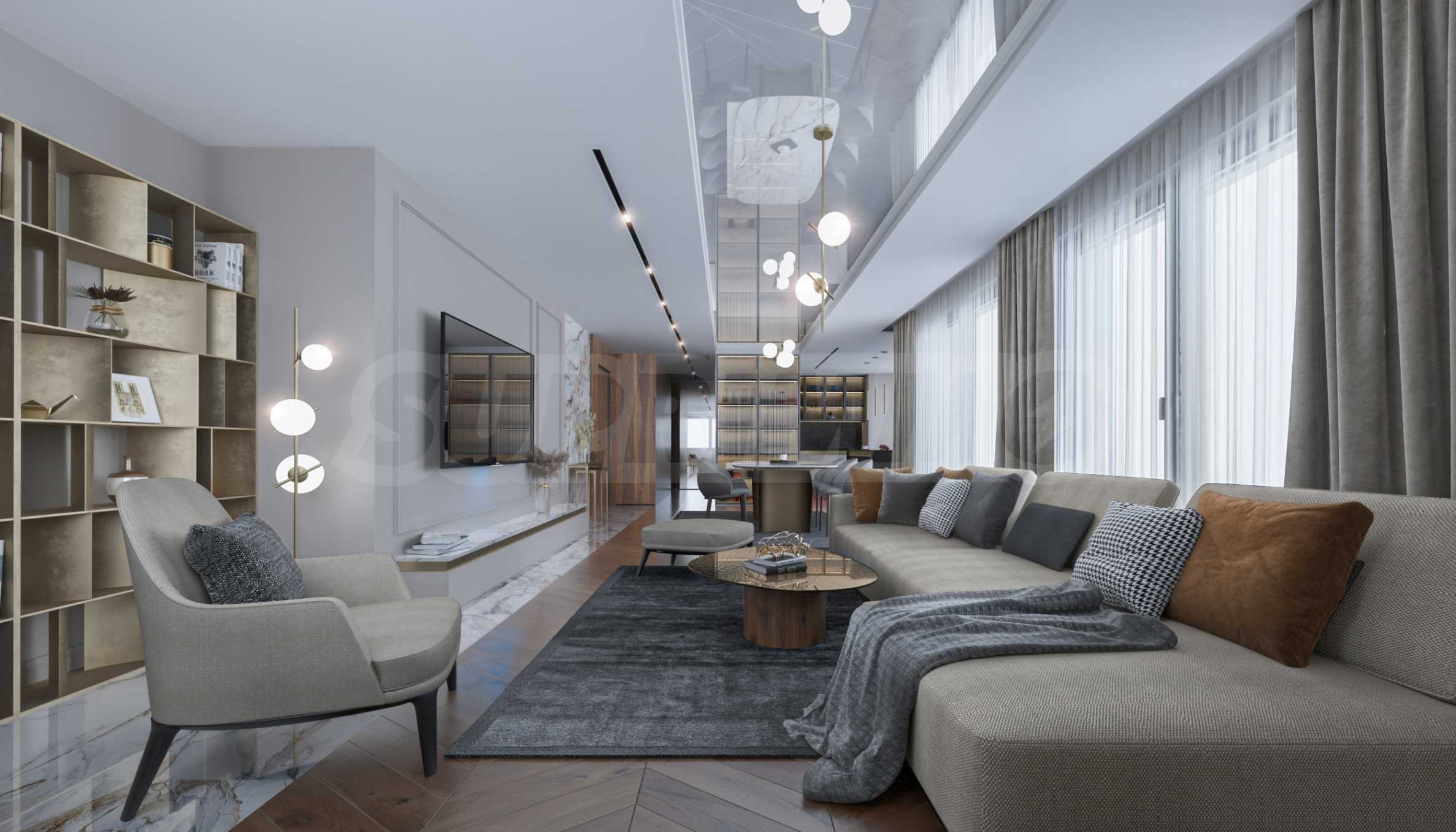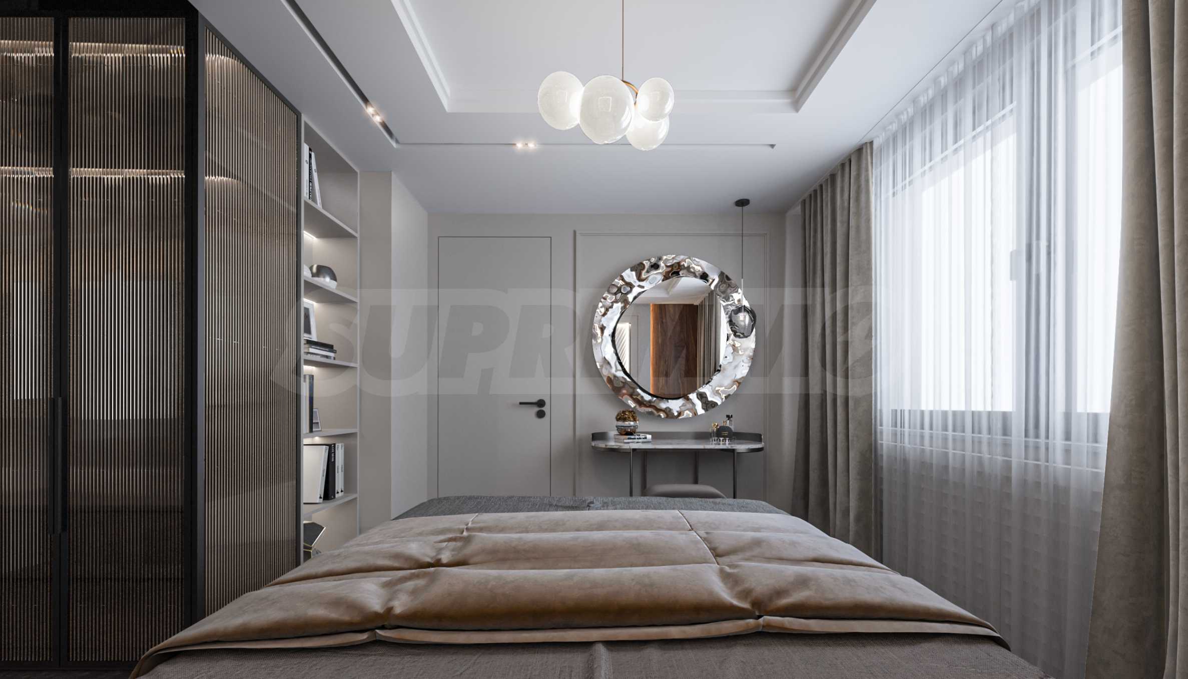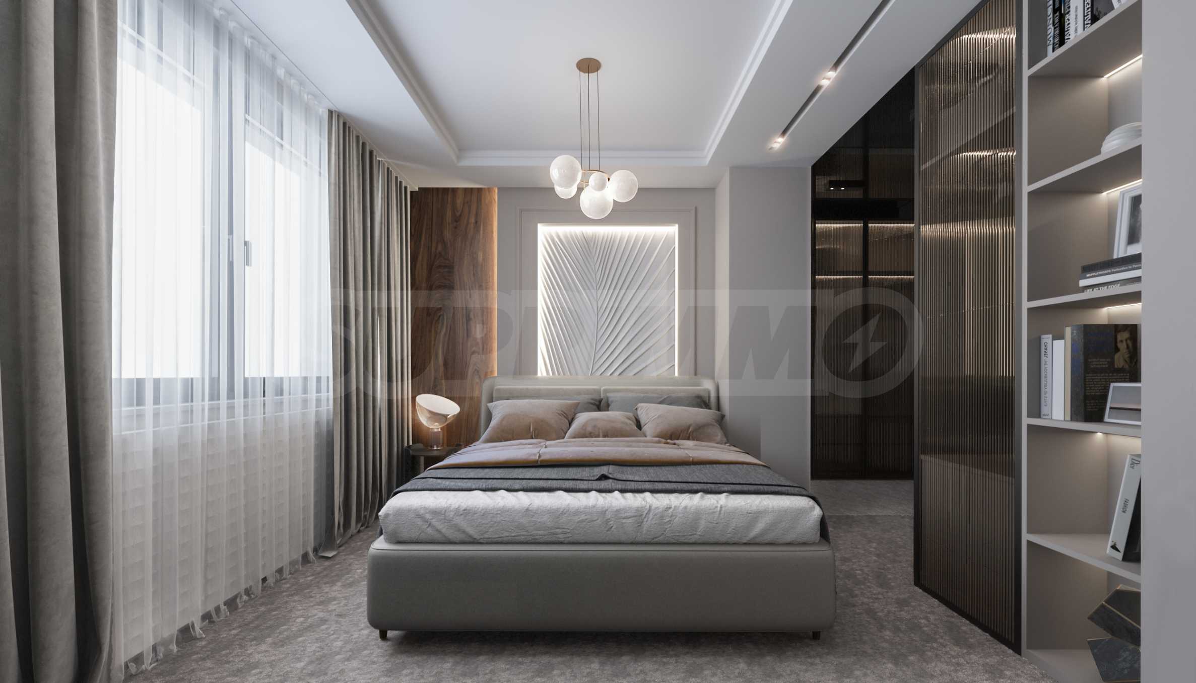 Сградата се състои само от 5 апартамента – по един на всеки етаж. Отличаваща се с модерна визия, фасадата е елегантно съчетание от естествен камък минерална мазилка.