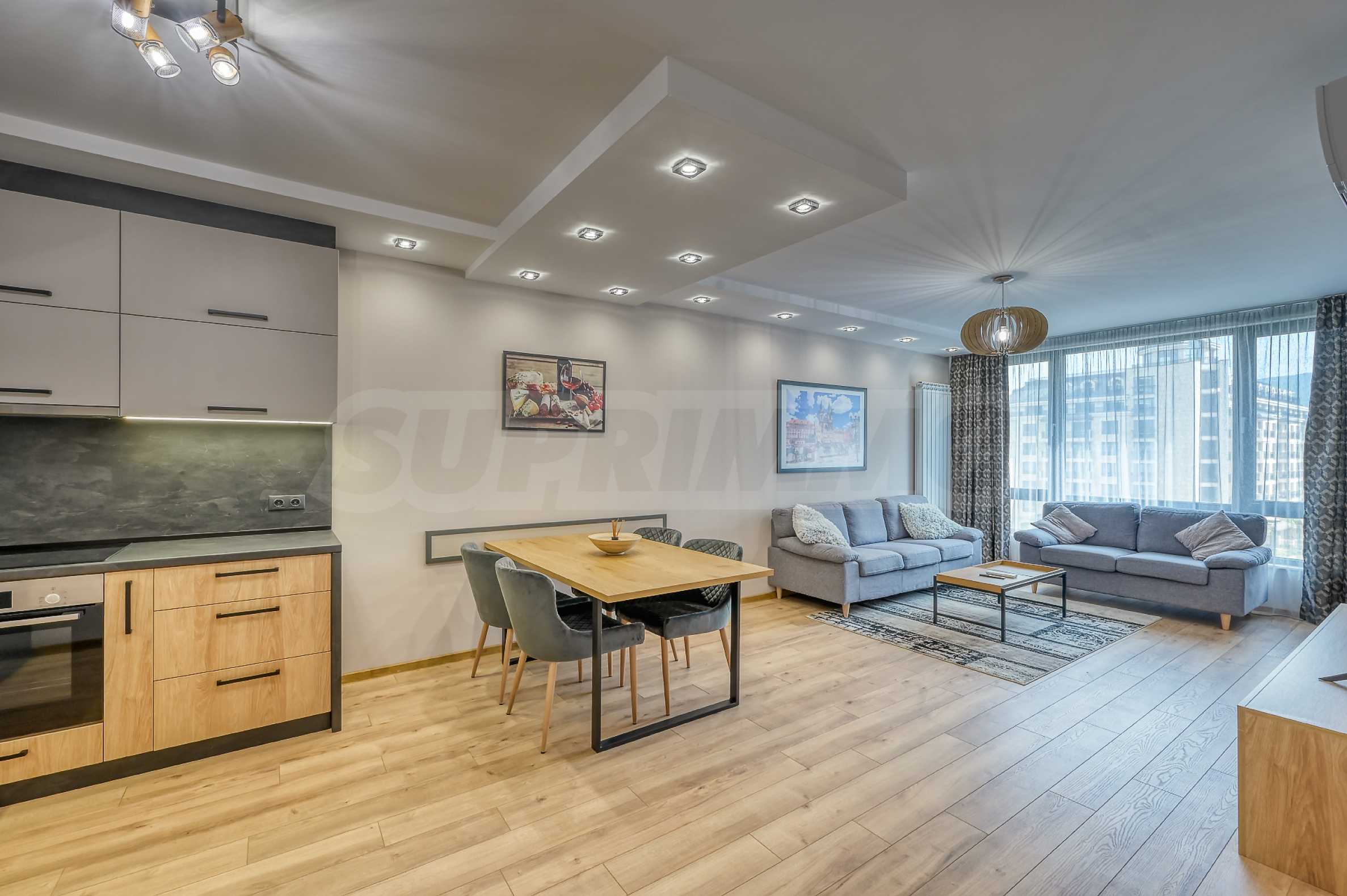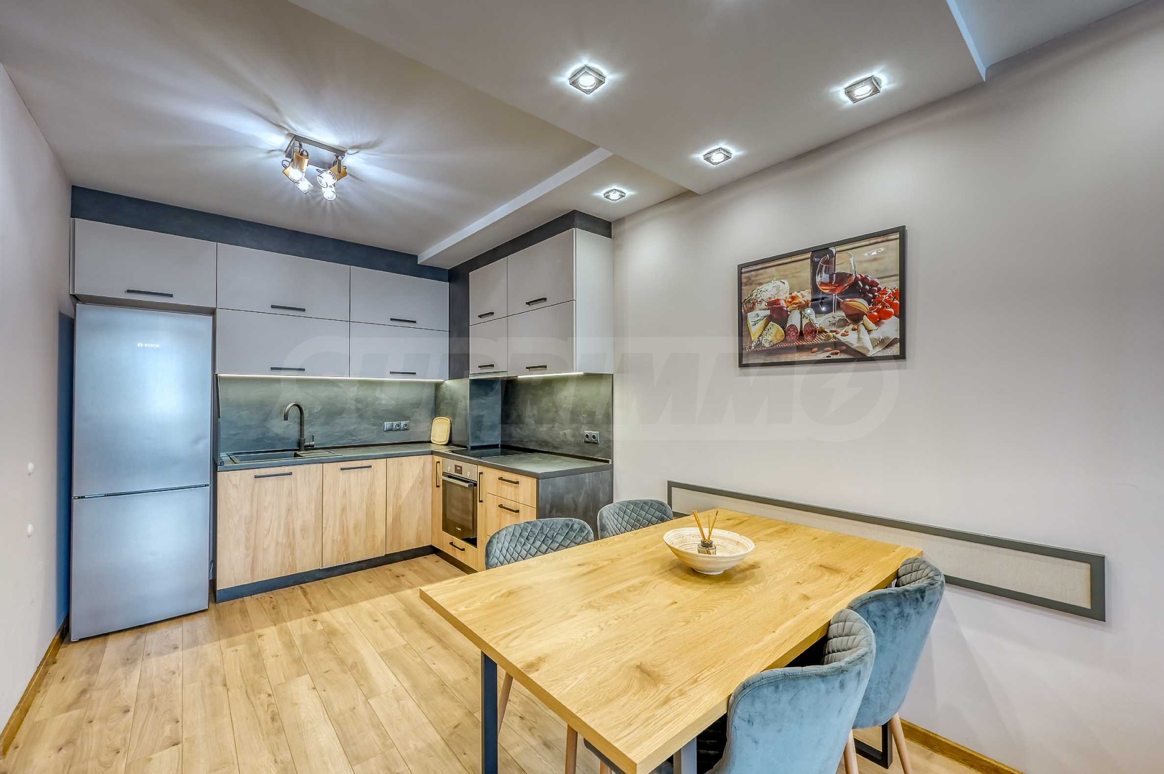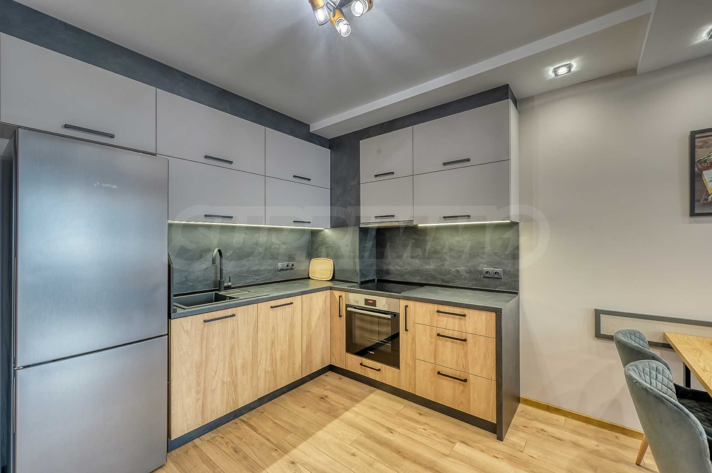 Интериорът е уютен, с модернo обзавеждане, корпусна мебел по пръчка, висок клас уреди на Bosch и телевизор Samsung.