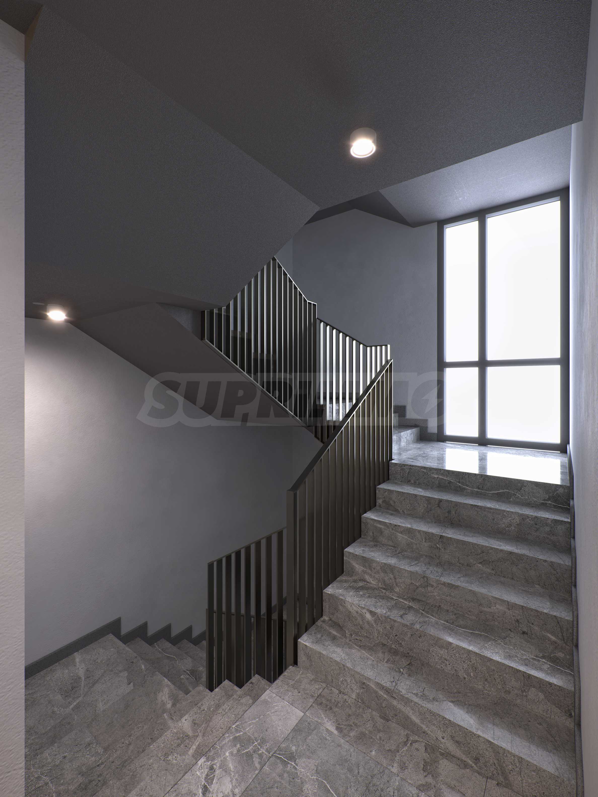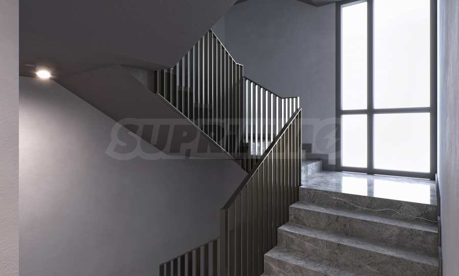Настилките по общите части на сградата, фоайе, коридори и стълбища ще са изпълнени с плочи от естествен камък — полиран гранит. Стълбищните парапети са ажурни от алуминий, по архитектурен детайл, видим в интериорните 3D визуализации на сградата. Ще бъдат предвидени стъклени врати към етажните площадки, които са димоуплътнени, самозатварящи се. За настилките на балконите и лоджиите сме избрали италиански гранитогрес, осигурен срещу хлъзгане. Откритите тераси ще са с изграден двоен под и подови настилки от италиански керамични плочи.