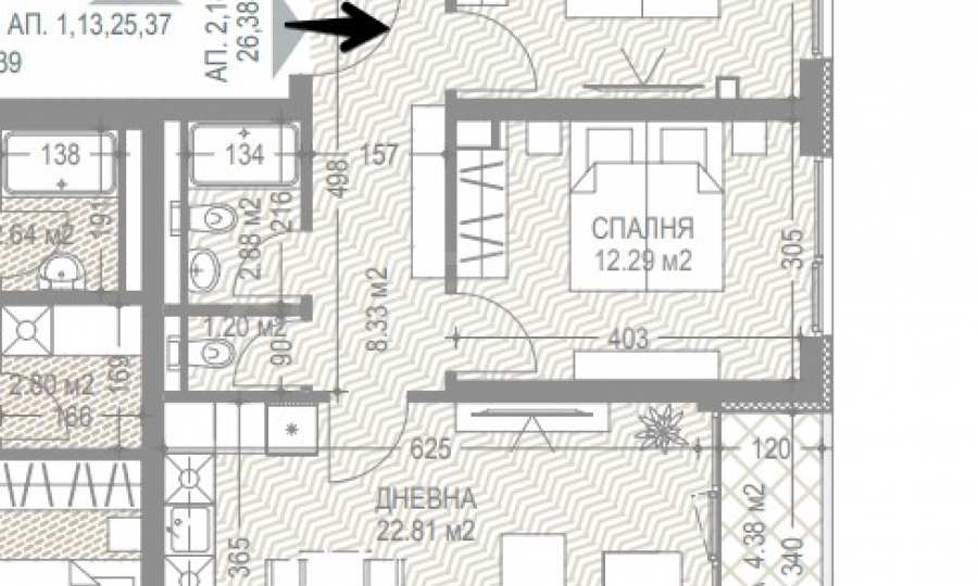 Апартамент №26 е разположен на 3-ти етаж и се състои от две спални, хол, тераса, баня/тоалетна, тоалетна и антре.