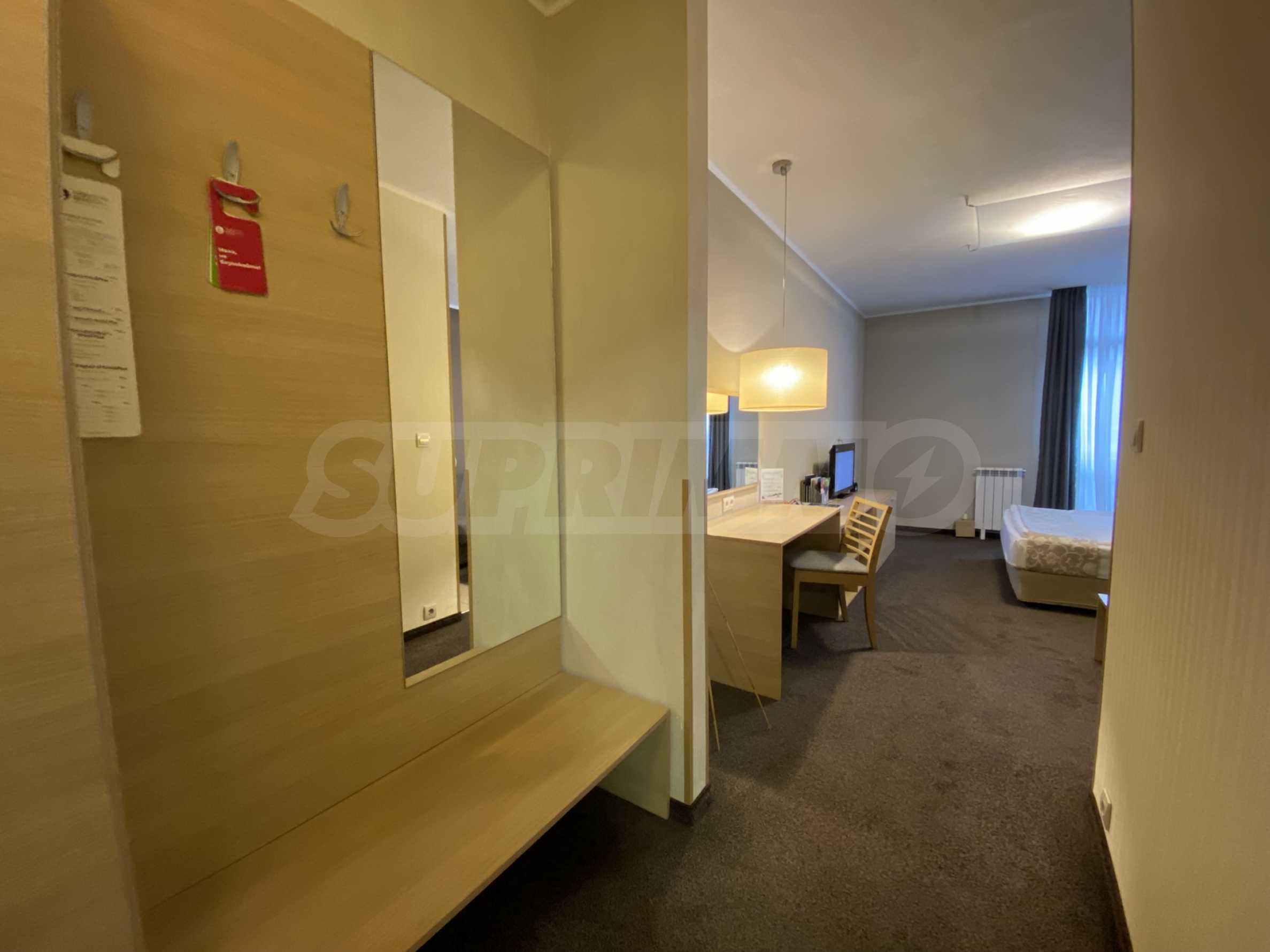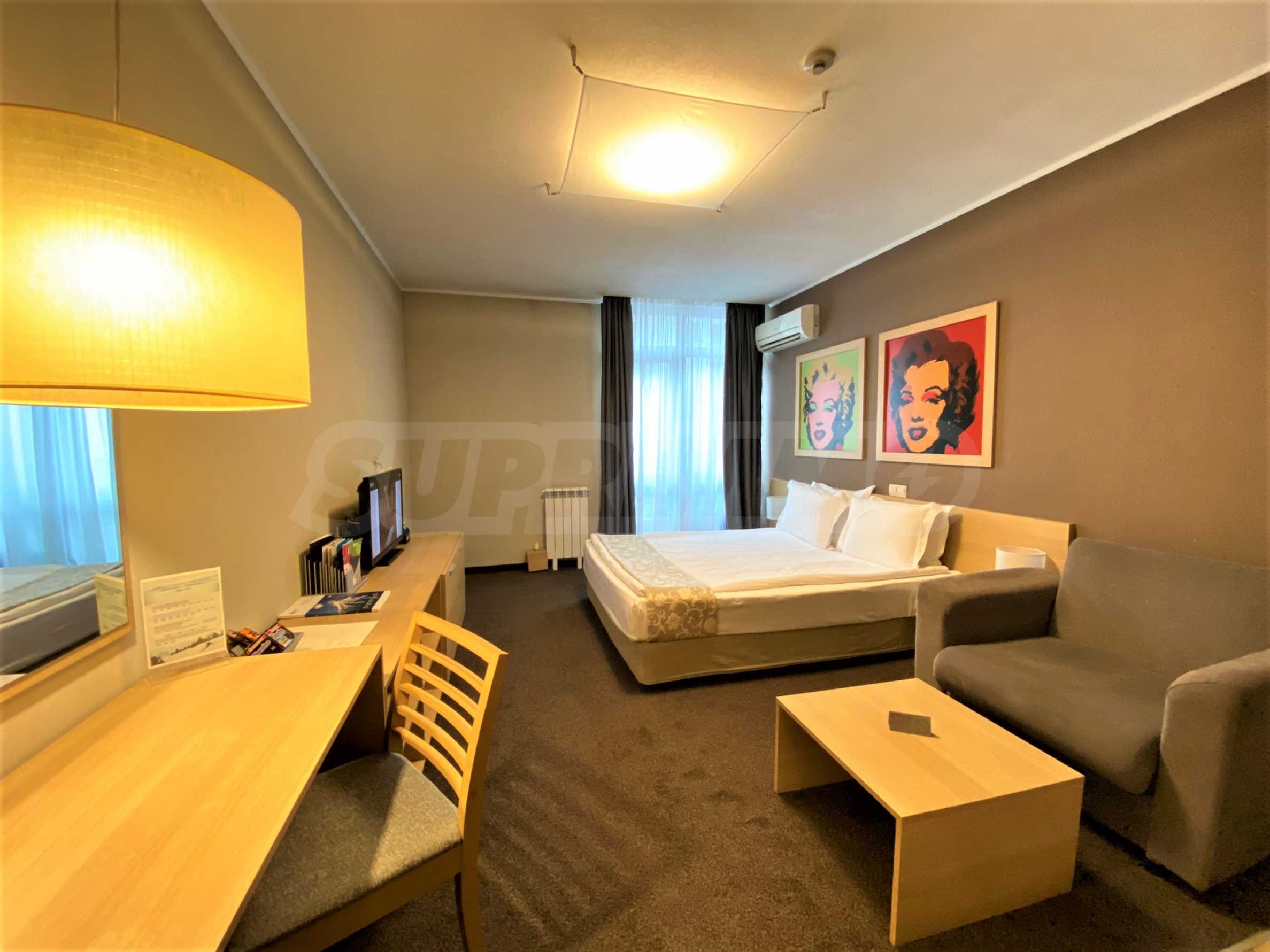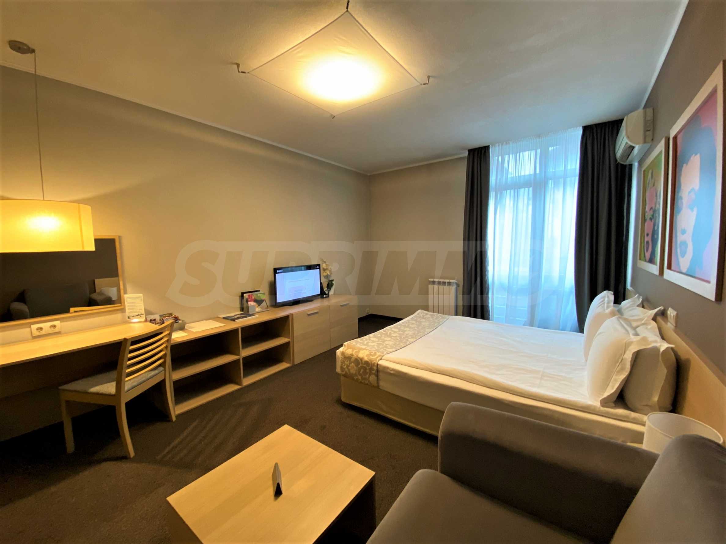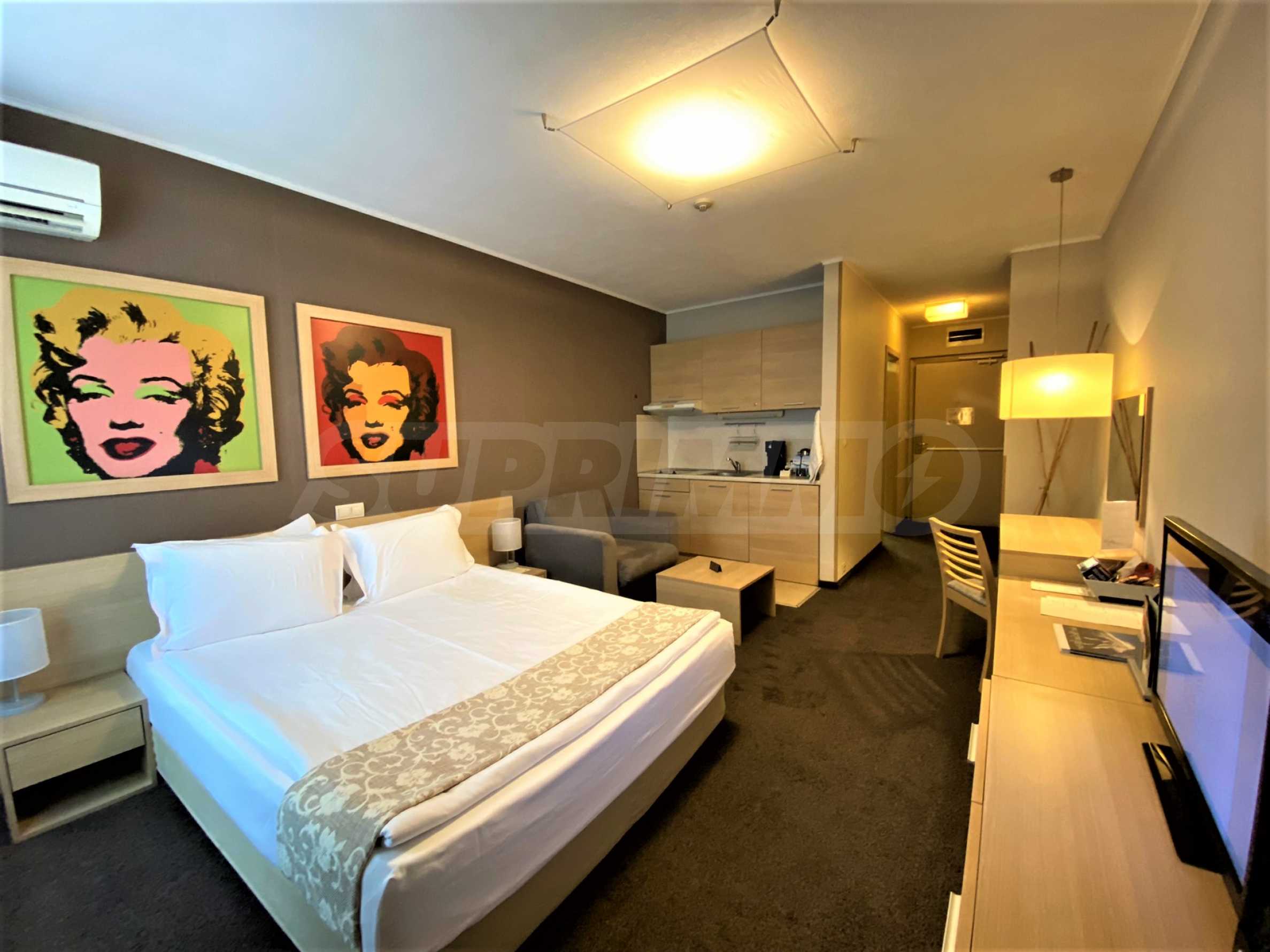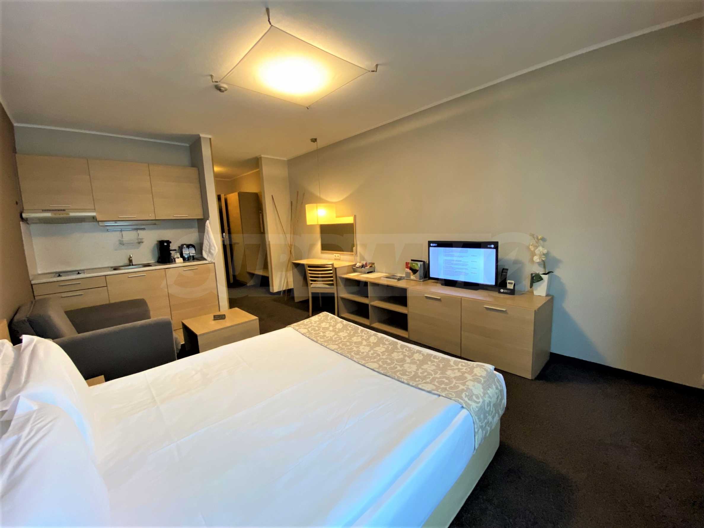 Апартаментът е разпределен между кухня, двойно легло, диван, баня с тоалетна. Имотът е подходящ за инвестиция или за лично ползване.