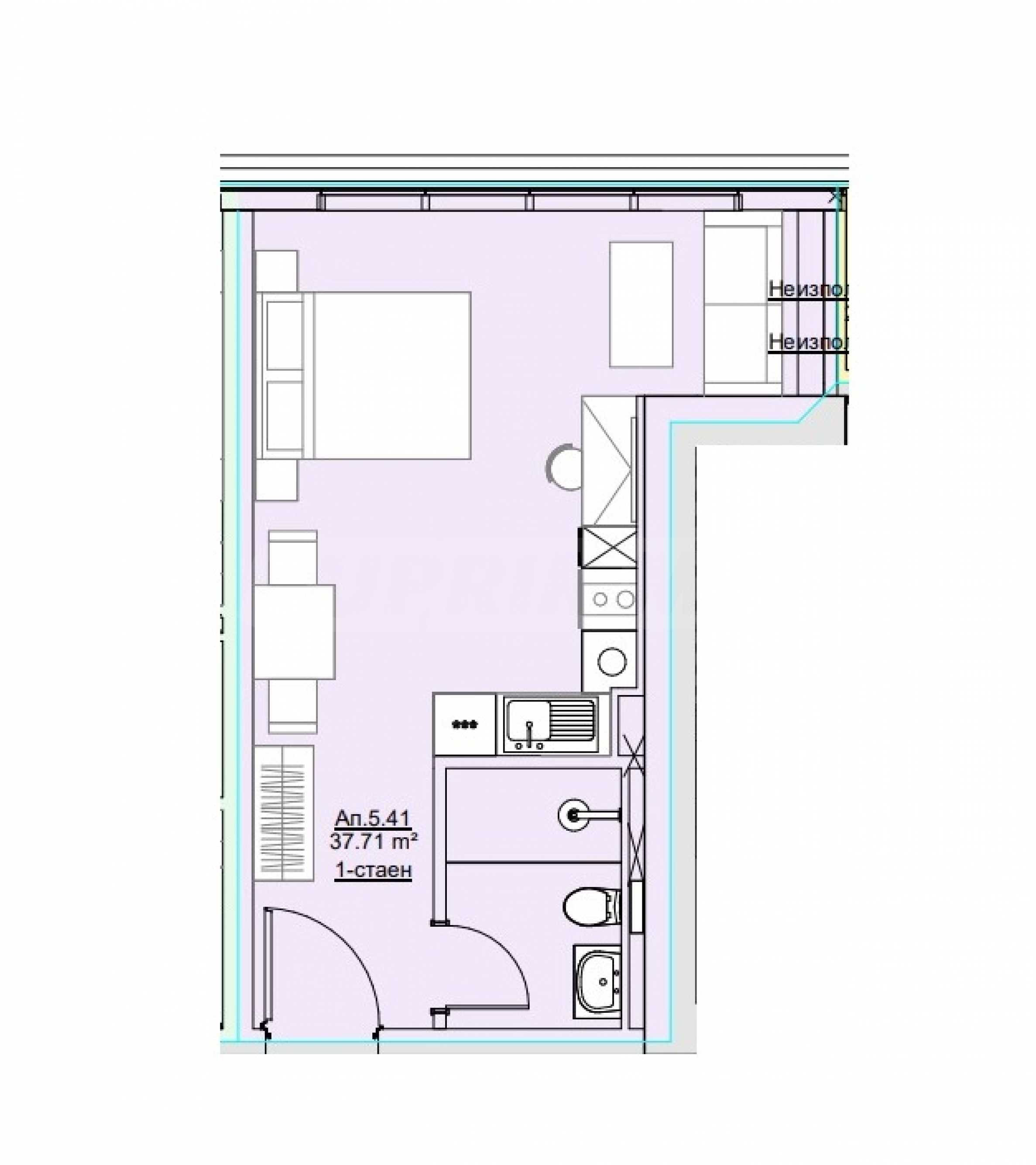 Апартамент 5.41 е ситуиран на 5-и етаж от общо 15 и предлага 46.03 кв.м обща площ - 37.71 кв.м нетна площ и 8.32 кв.м общи части.