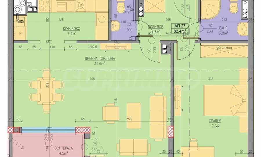 Конкретната оферта е за просторен двустаен апартамент на девети етаж с обща площ от 98.04 м2 и следното разпределение: антре, спалня, хол с трапезария и кухненски бокс (31.6м2), баня с тоалетна и душ-кабина, тоалетна, остъклена тераса, мазе.
