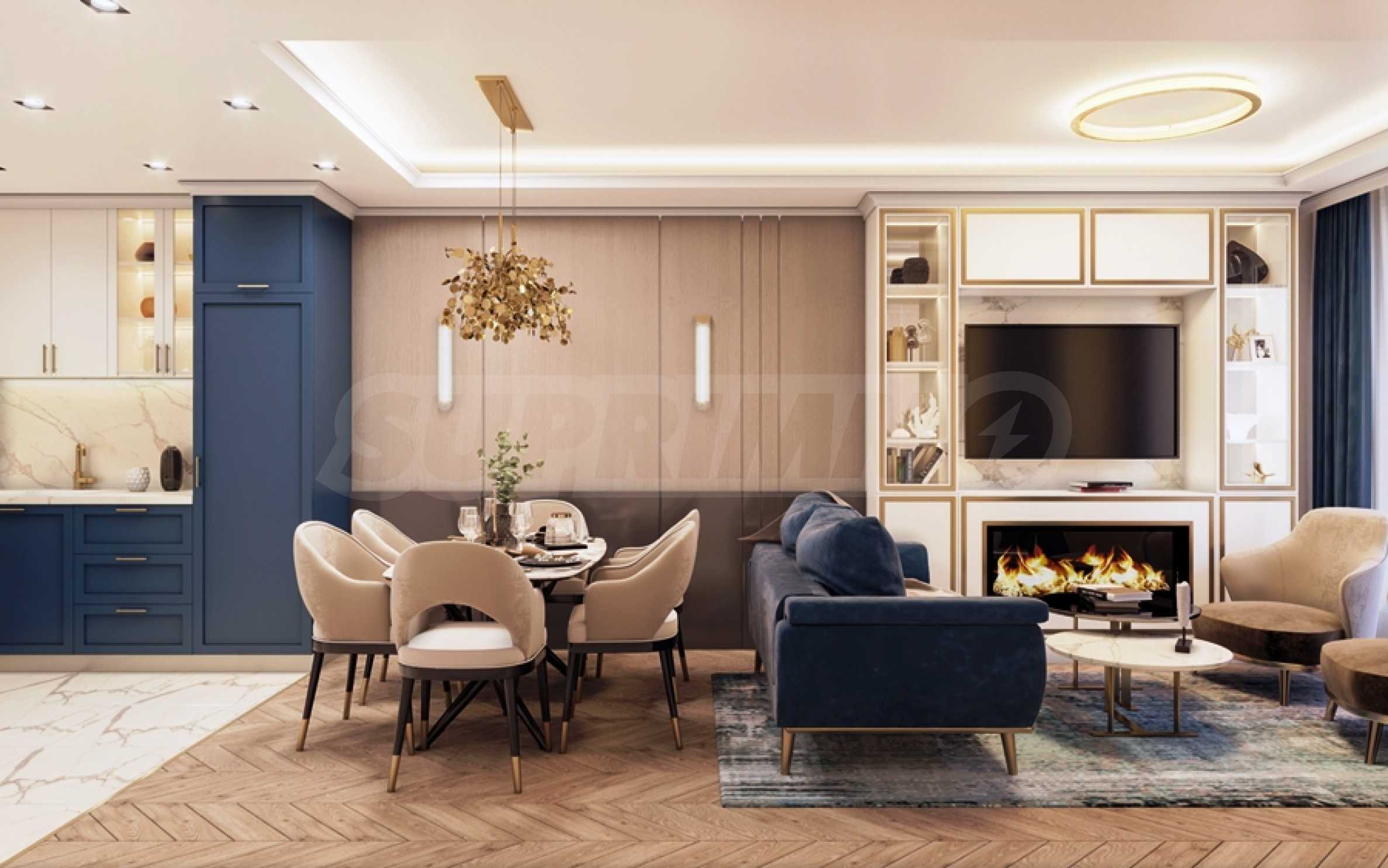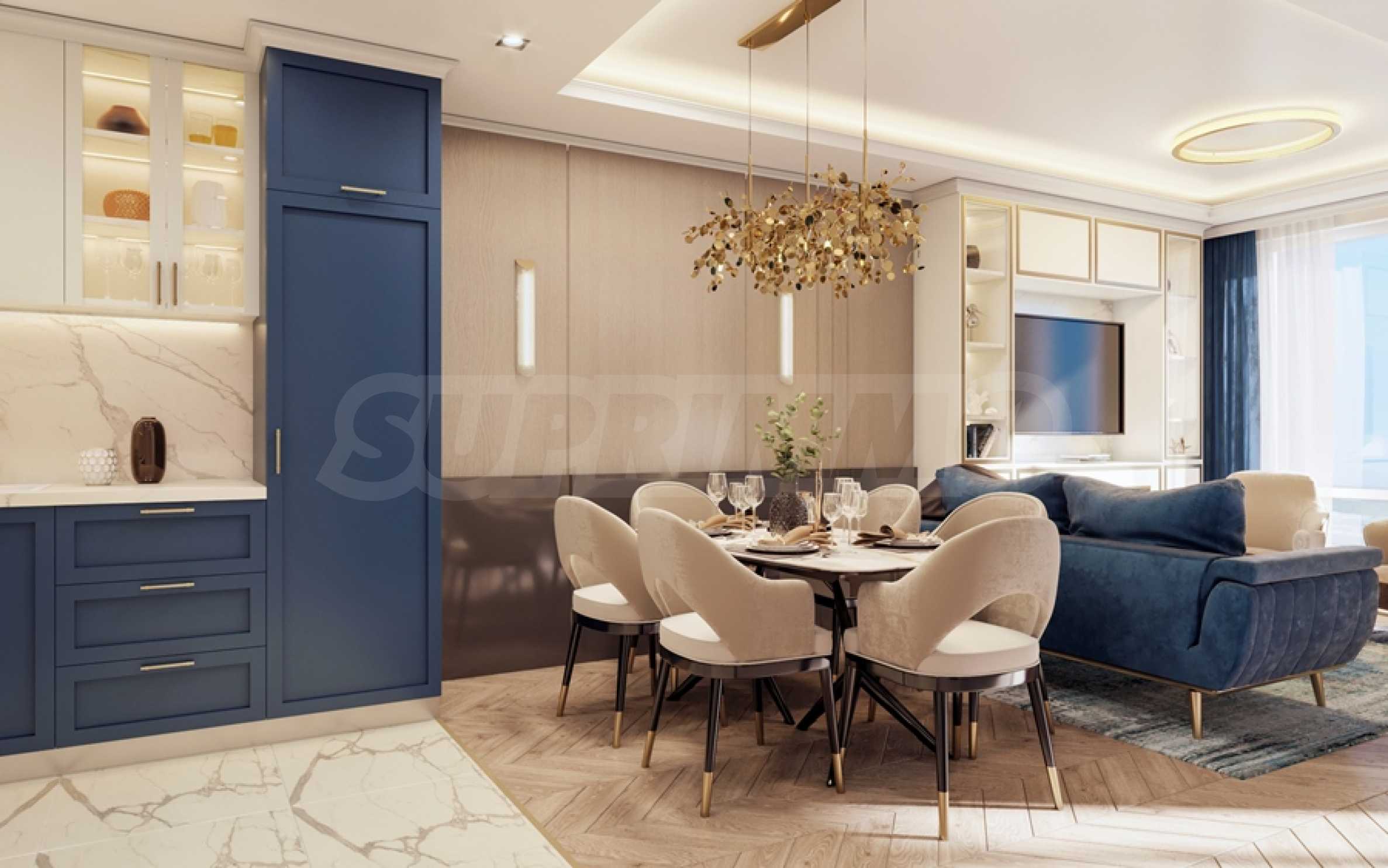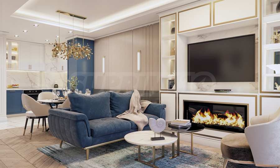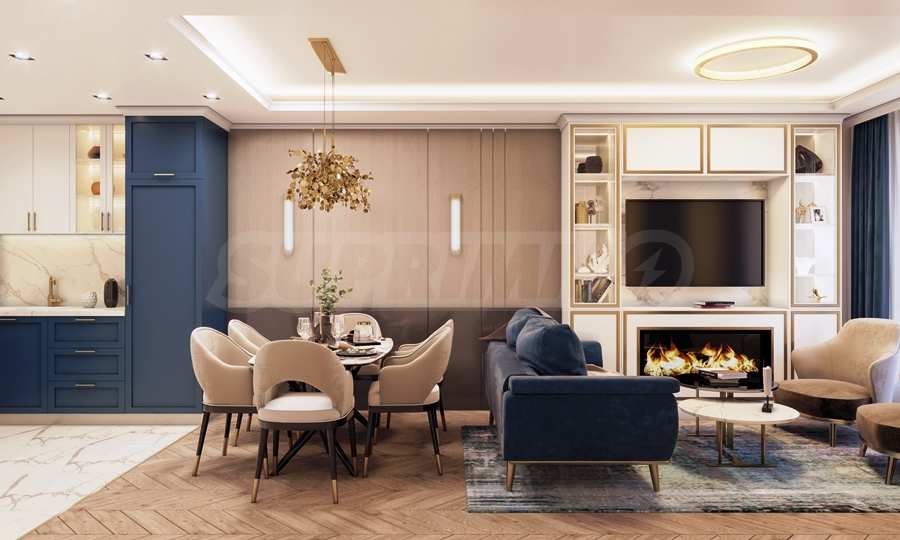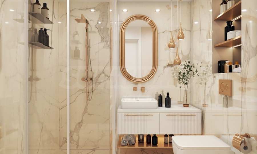 Има възможност за довършването на имотите "до ключ" и с пълно обзавеждане по бутиков дизайнерски проект срещу допълнително заплащане. Проектът се предоставя като бонус, има и варианти за мебелиране. За акцент са използвани син и златно бежов цвят. Банята е в класически стил, с плочки от бежов мрамор, както по снимките към тази оферта.