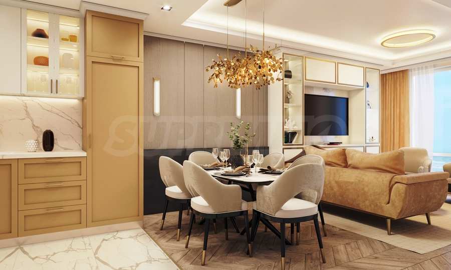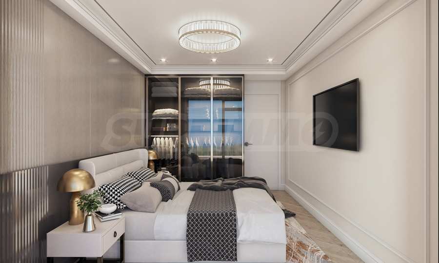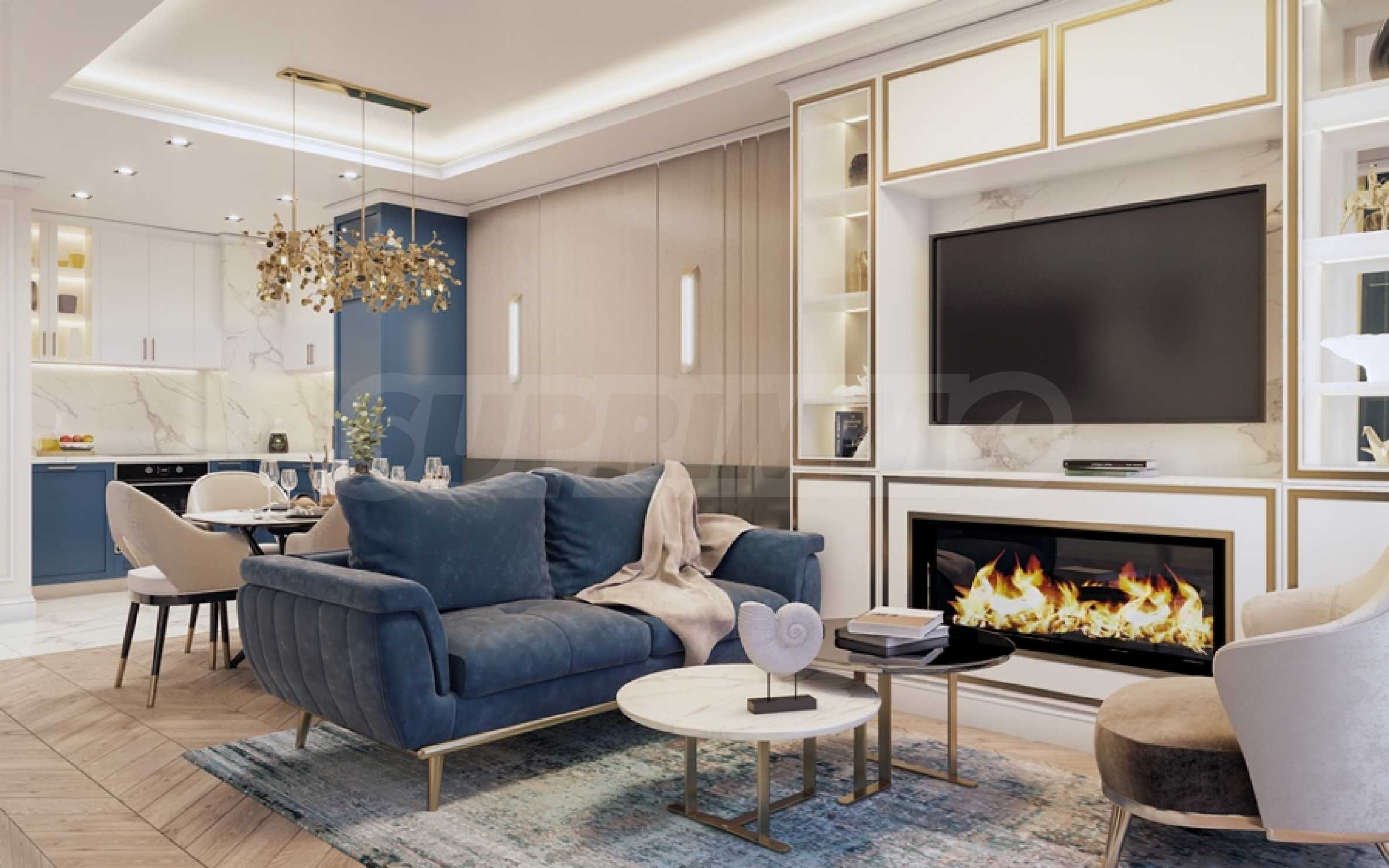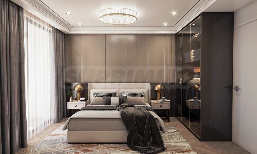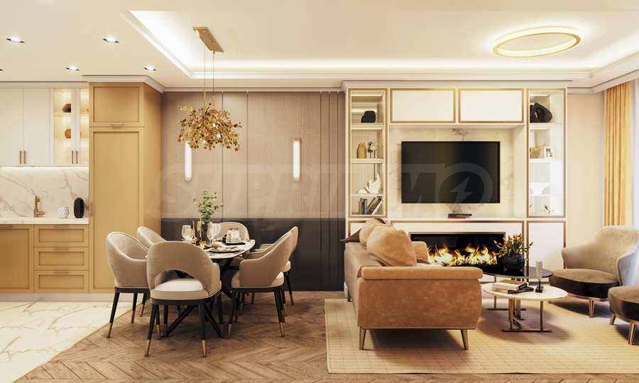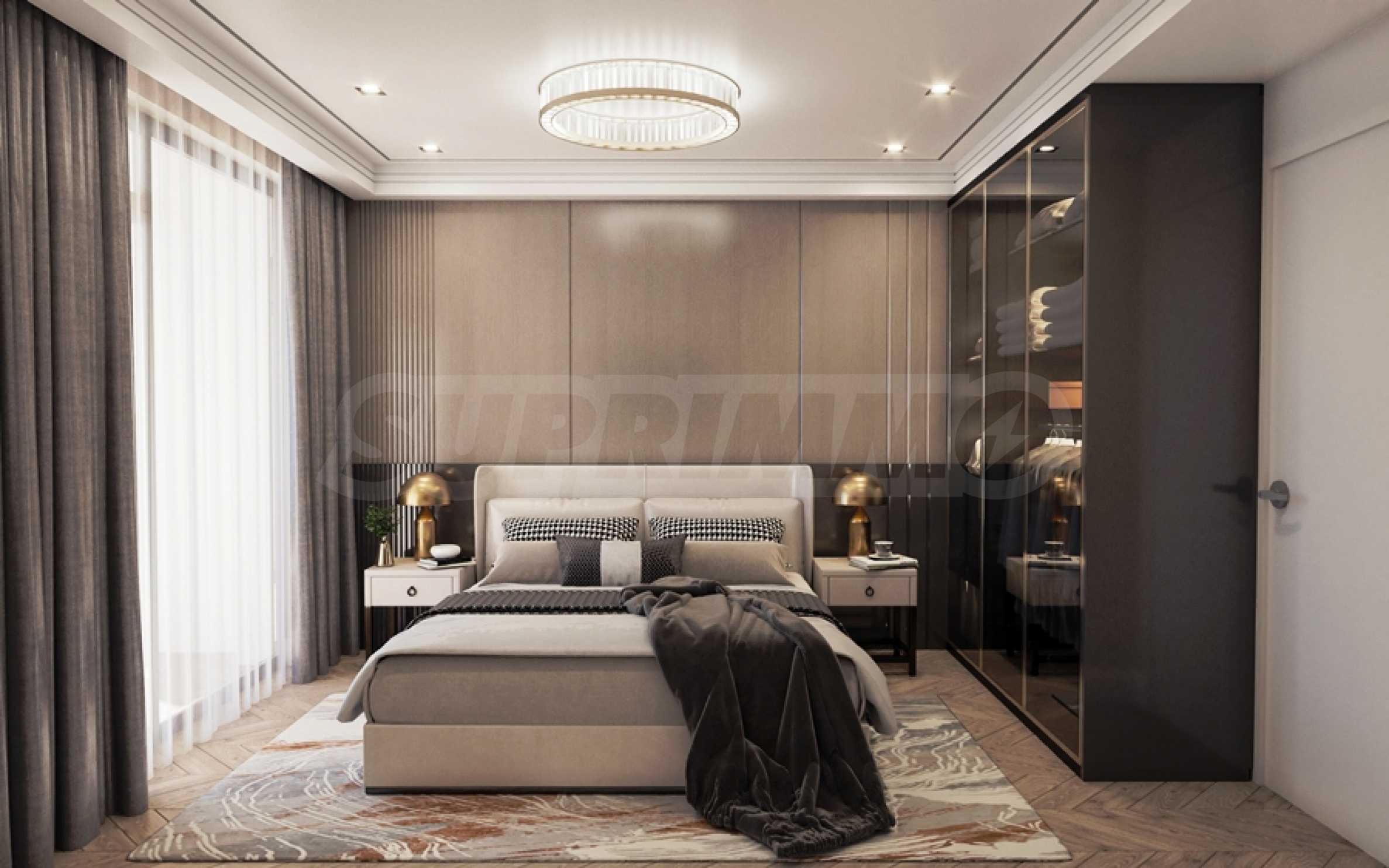 Има възможност за довършването на имотите "до ключ" и с пълно обзавеждане по бутиков дизайнерски проект срещу допълнително заплащане. Проектът се предоставя като бонус, има и варианти за мебелиране. За акцент са използвани син и златно бежов цвят. Банята е в класически стил, с плочки от бежов мрамор, както по снимките към тази оферта.