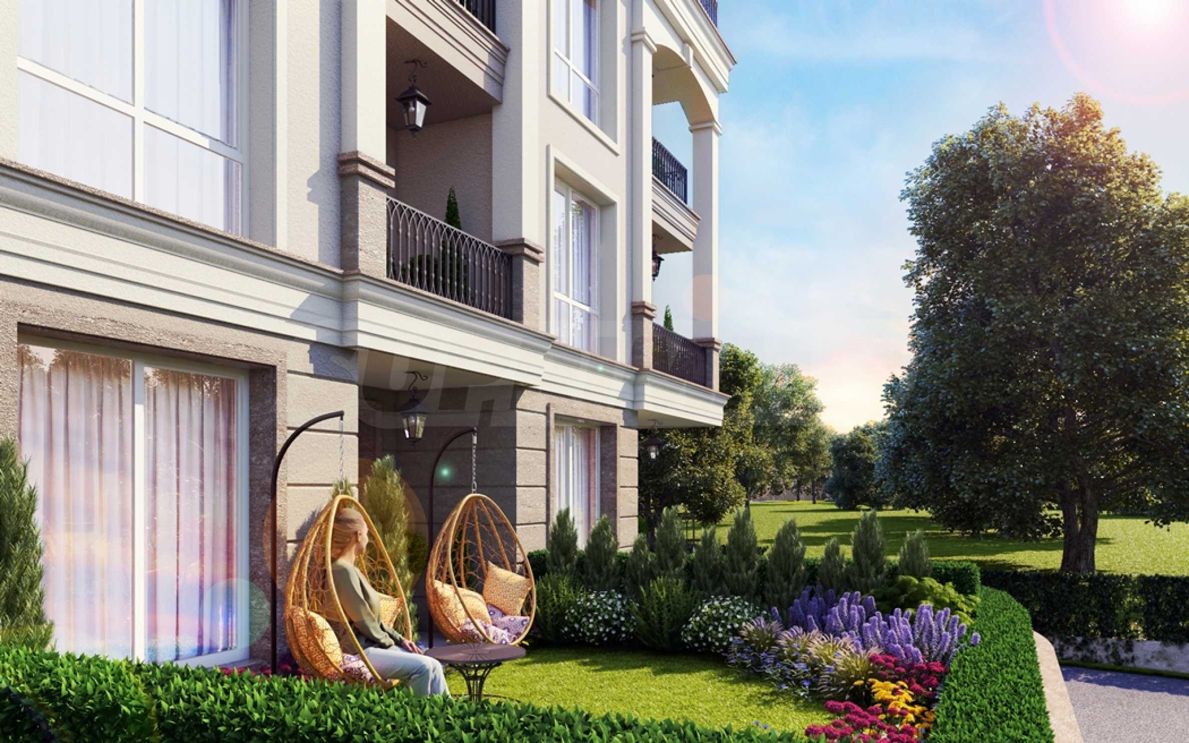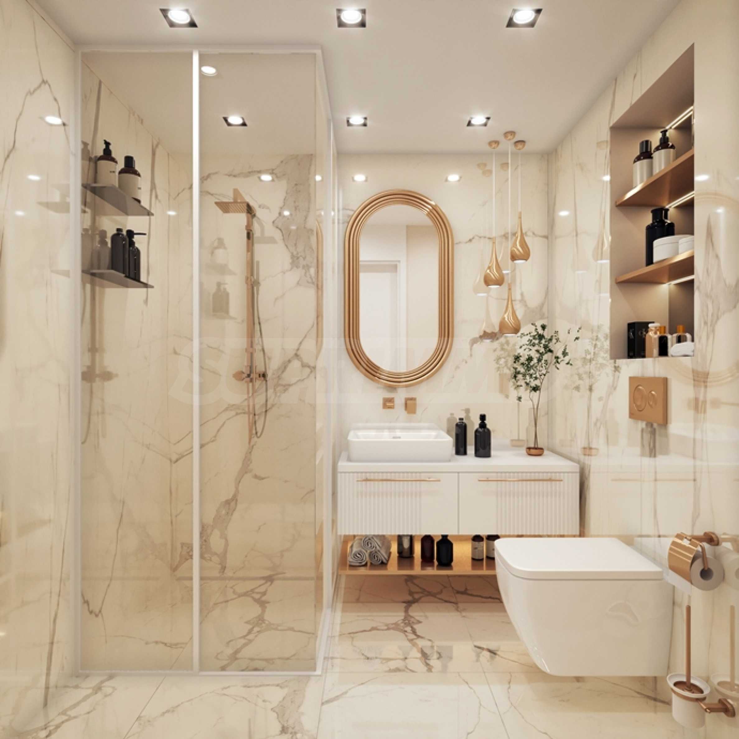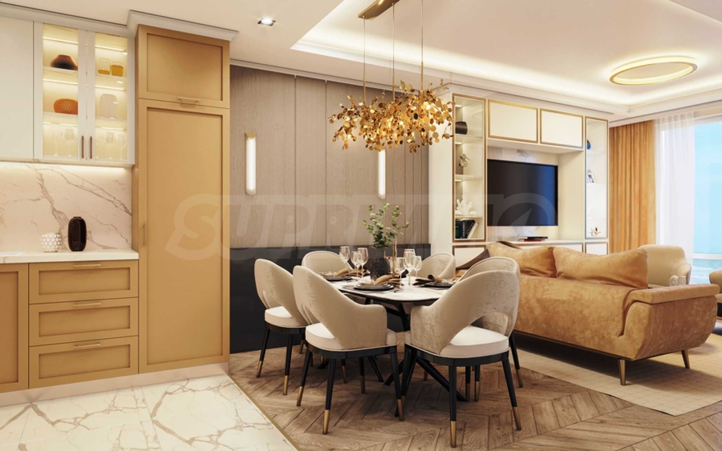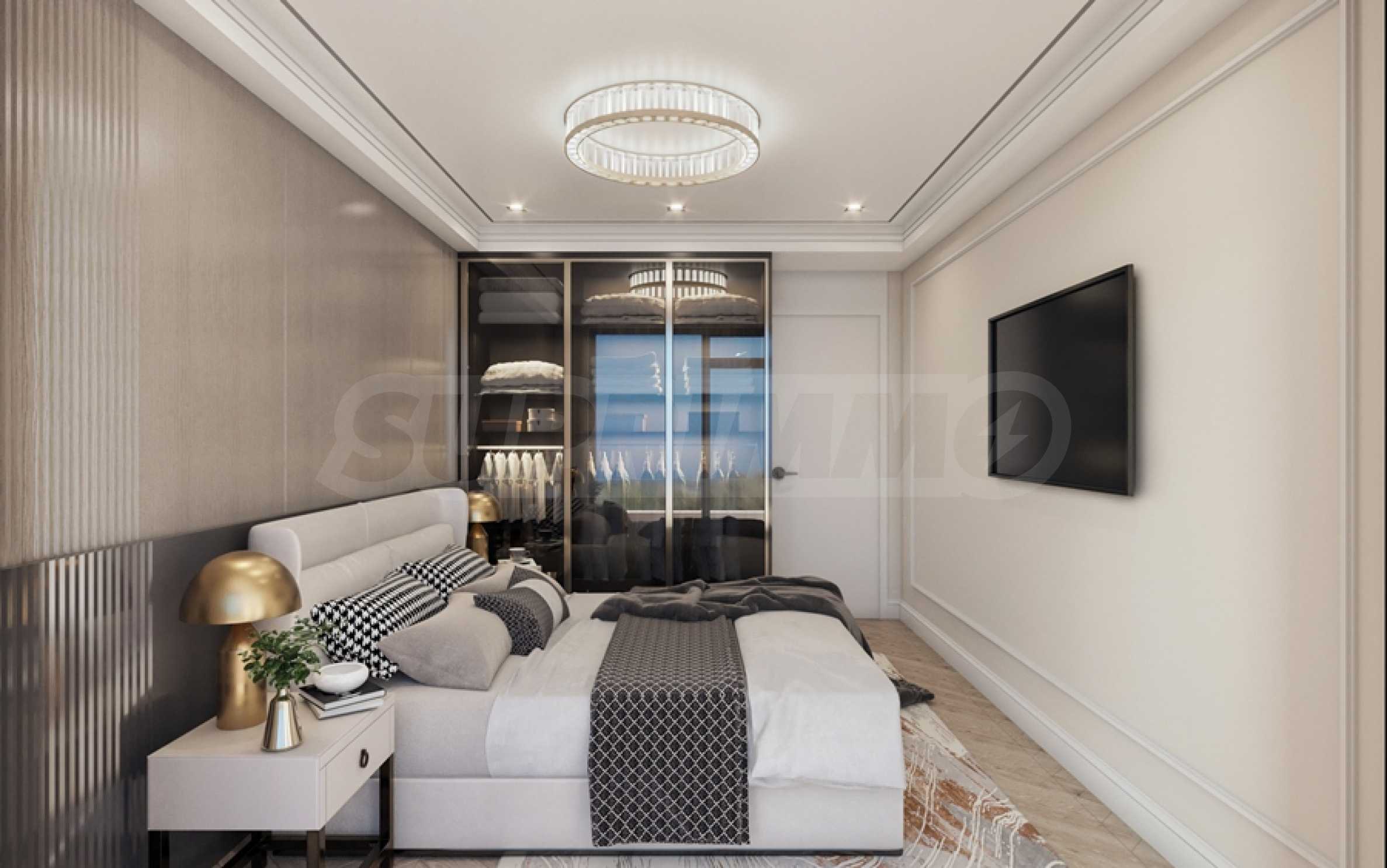 Има възможност за довършването на имотите "до ключ" и с пълно обзавеждане по бутиков дизайнерски проект срещу допълнително заплащане. Проектът се предоставя като бонус, има и варианти за мебелиране. За акцент са използвани син и златно бежов цвят. Банята е в класически стил, с плочки от бежов мрамор, както по снимките към тази оферта.