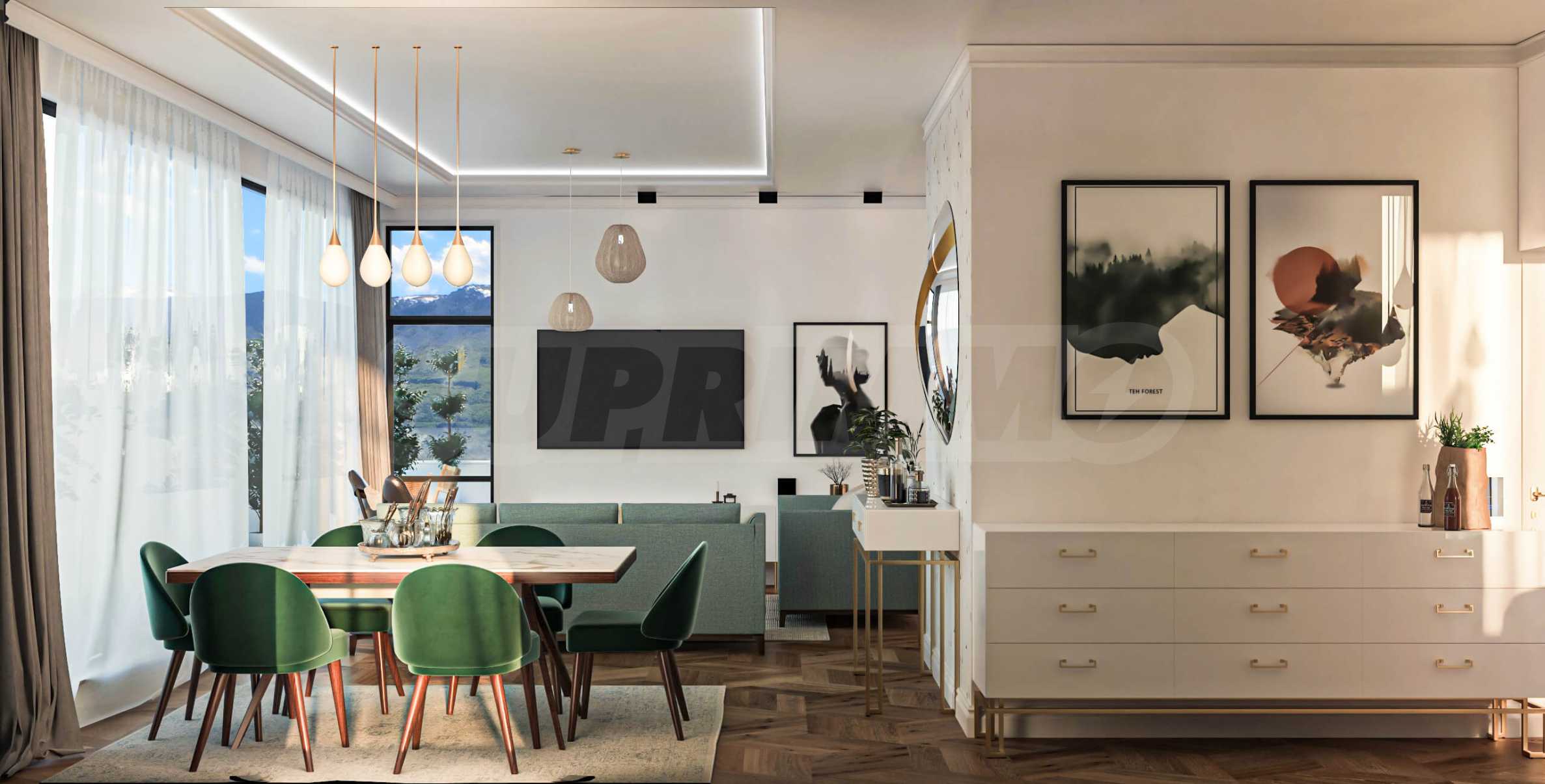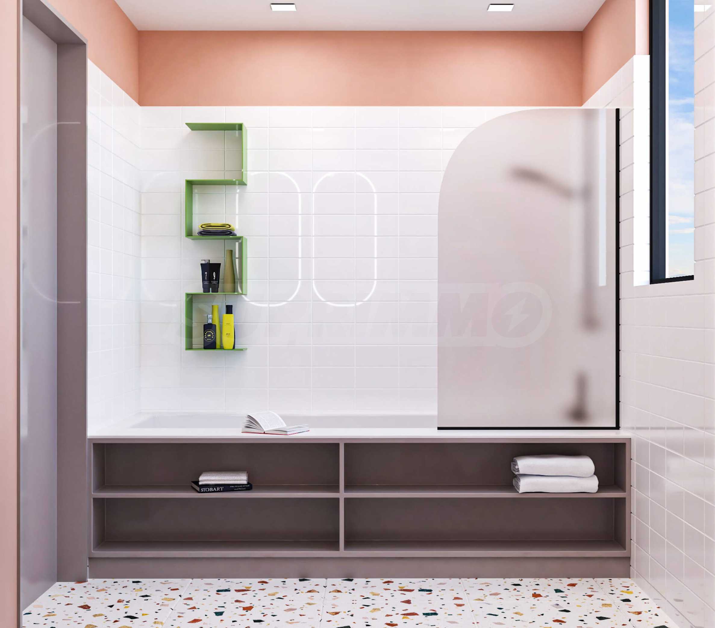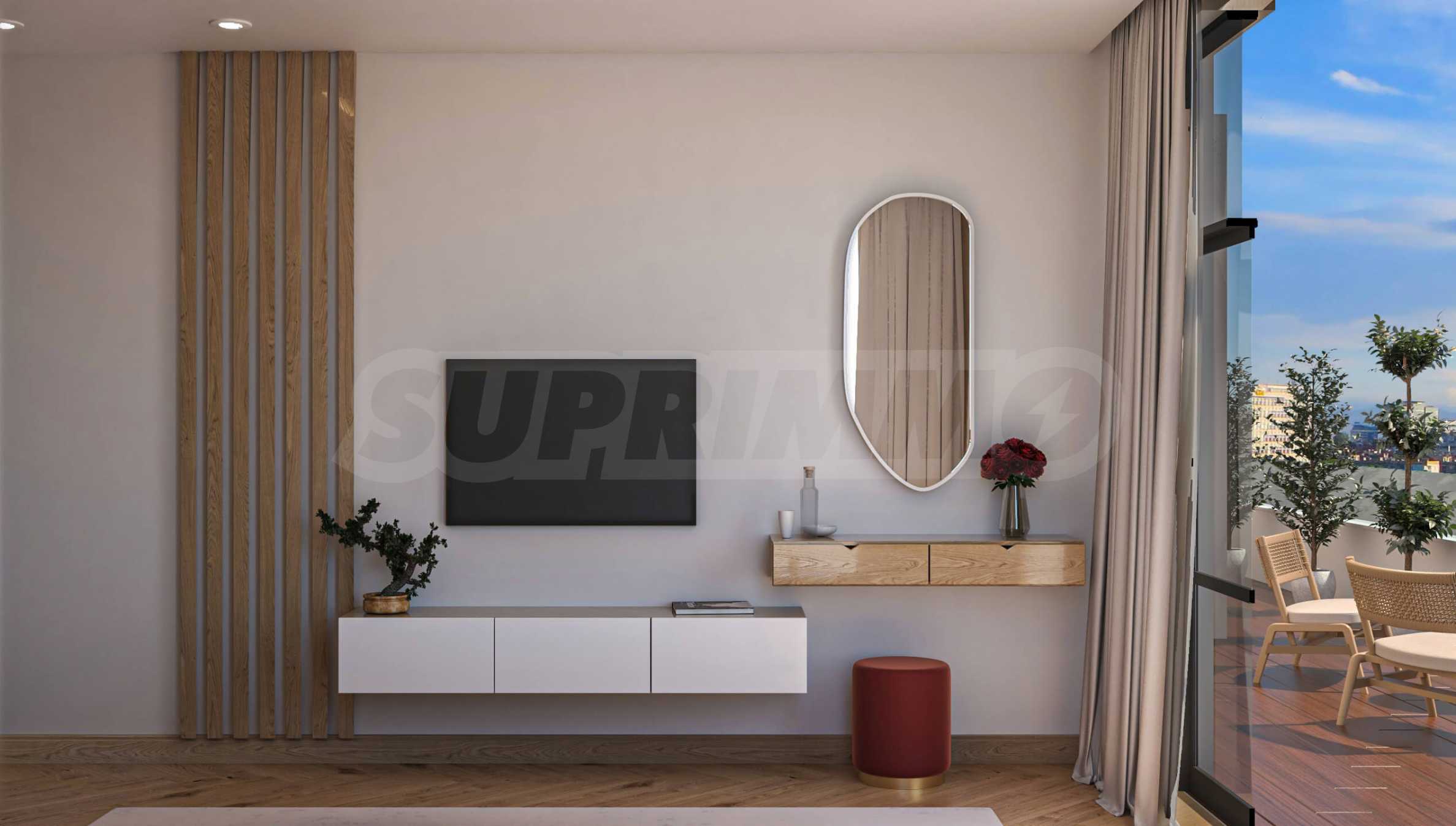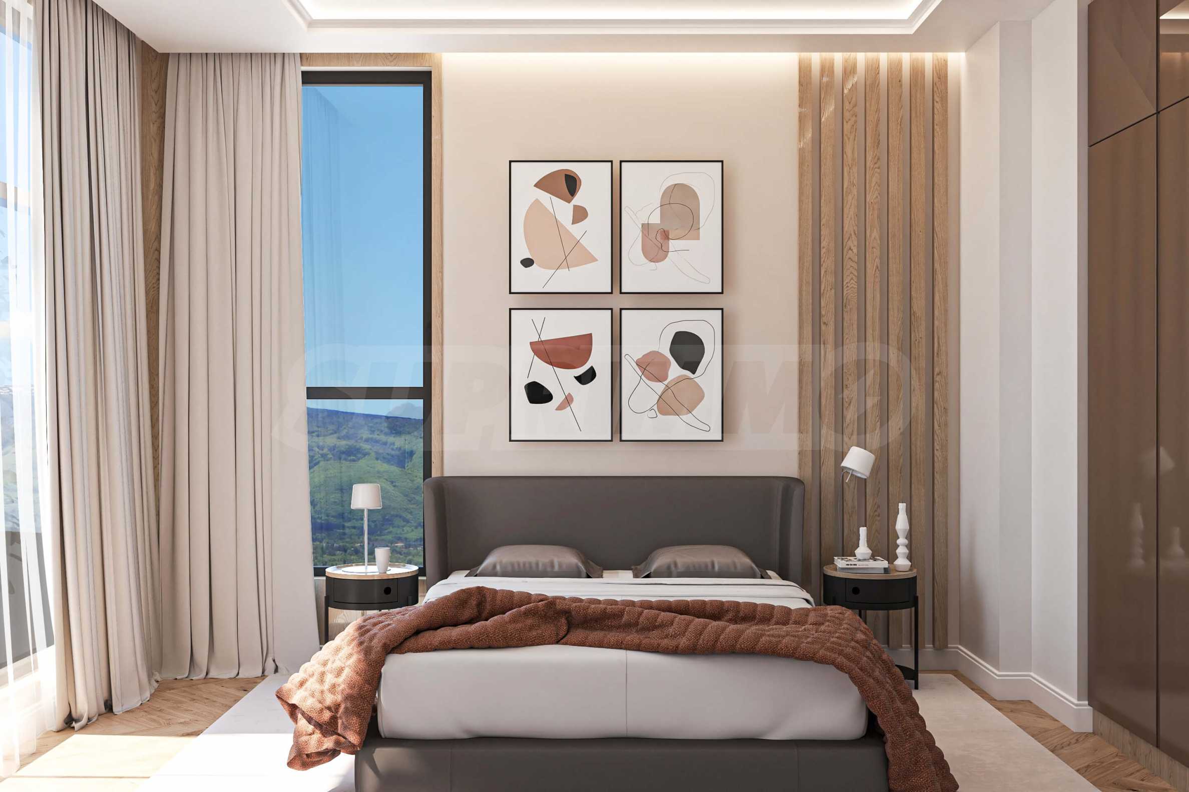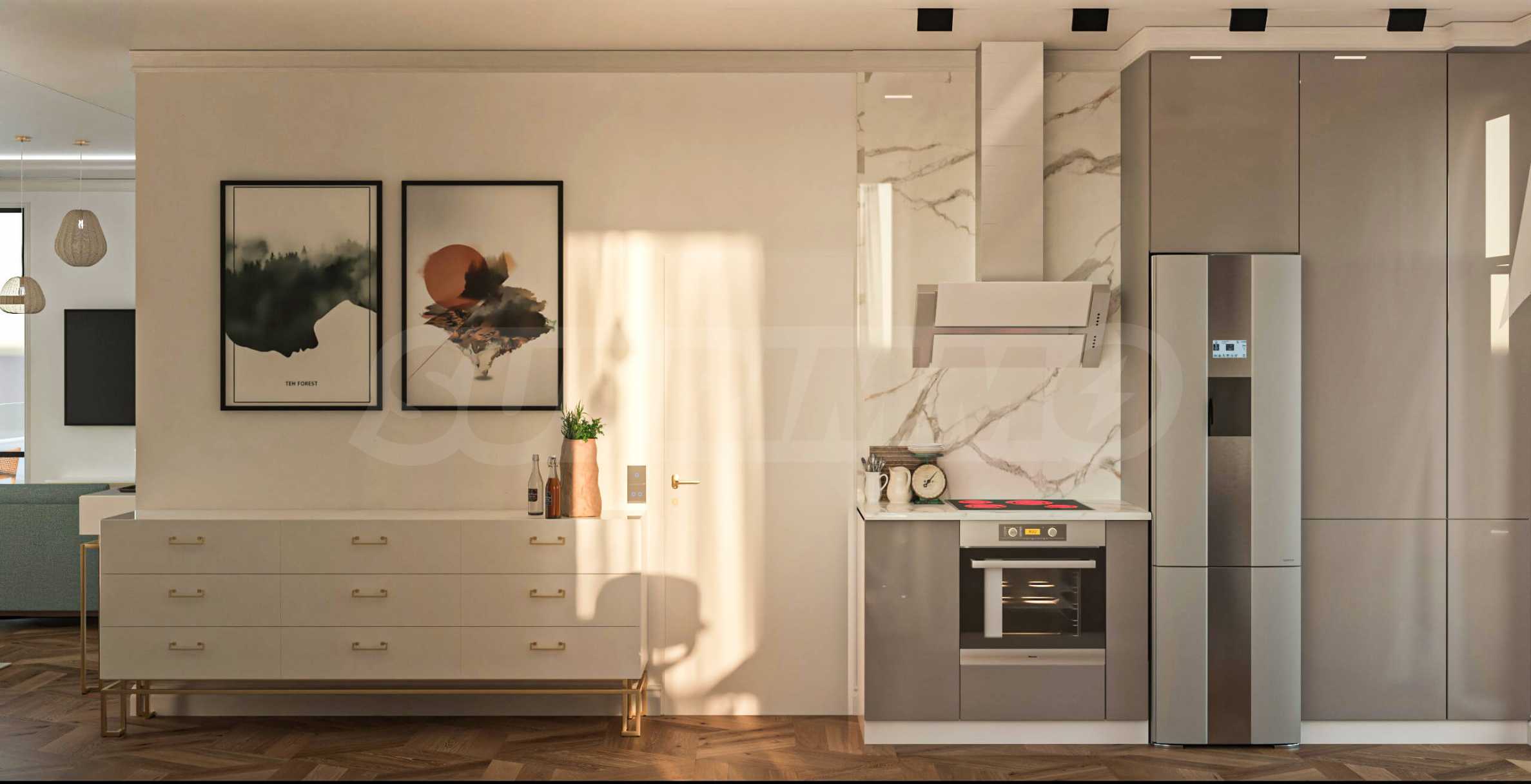 Визуализациите са примерни. Инвеститорът предлага примерни интериорни решения, като е обърнато особено внимание на детайлите, които да създадат усещането за топлина в дома и радост от новото жилище. Опитните дизайнери и архитекти на фирмата са готови да осигурят съпровод до пълна пространствена реализация на всеки индивидуализиран обект.Изложение: юг-запад-север.