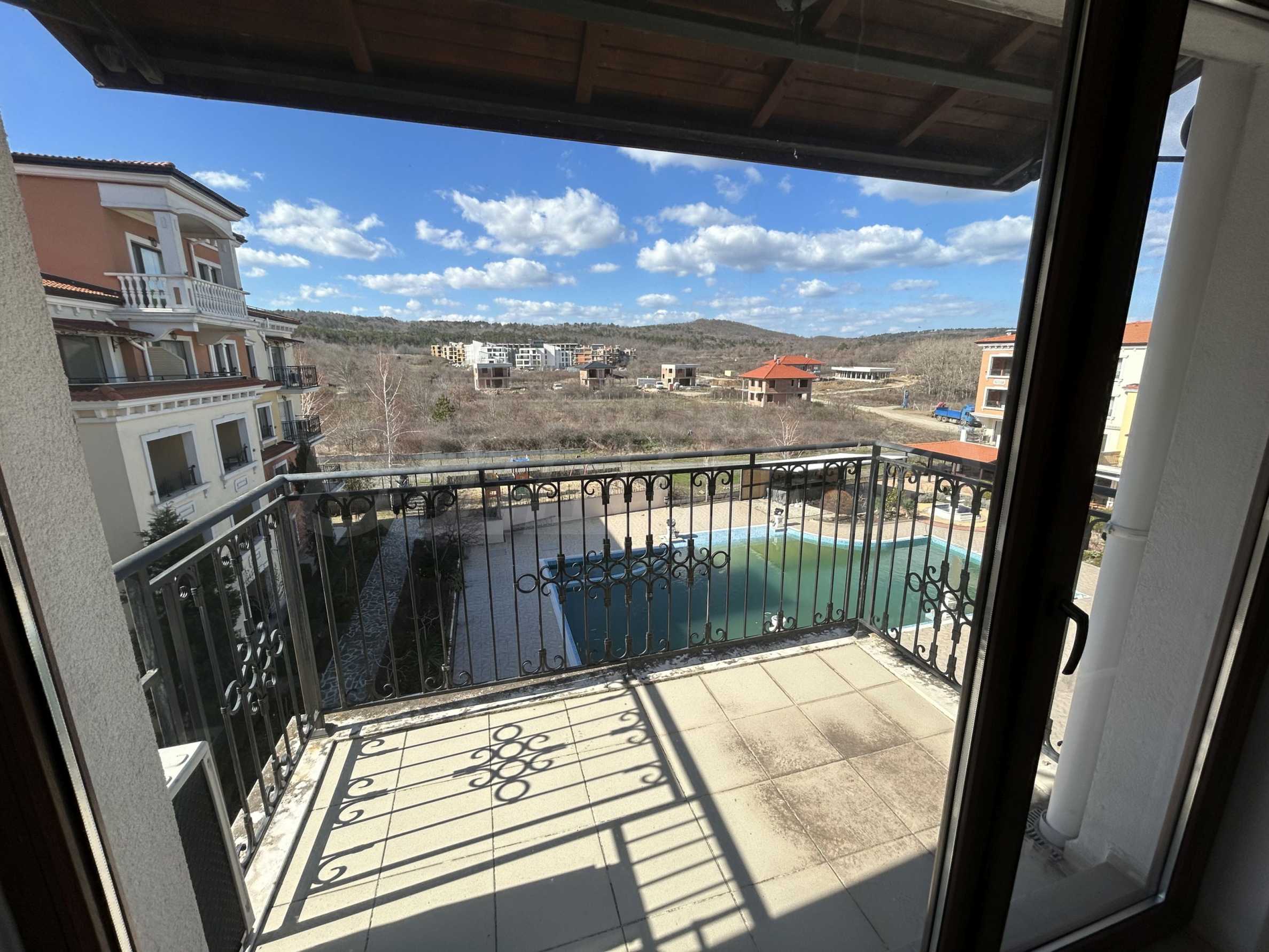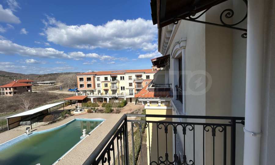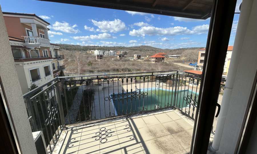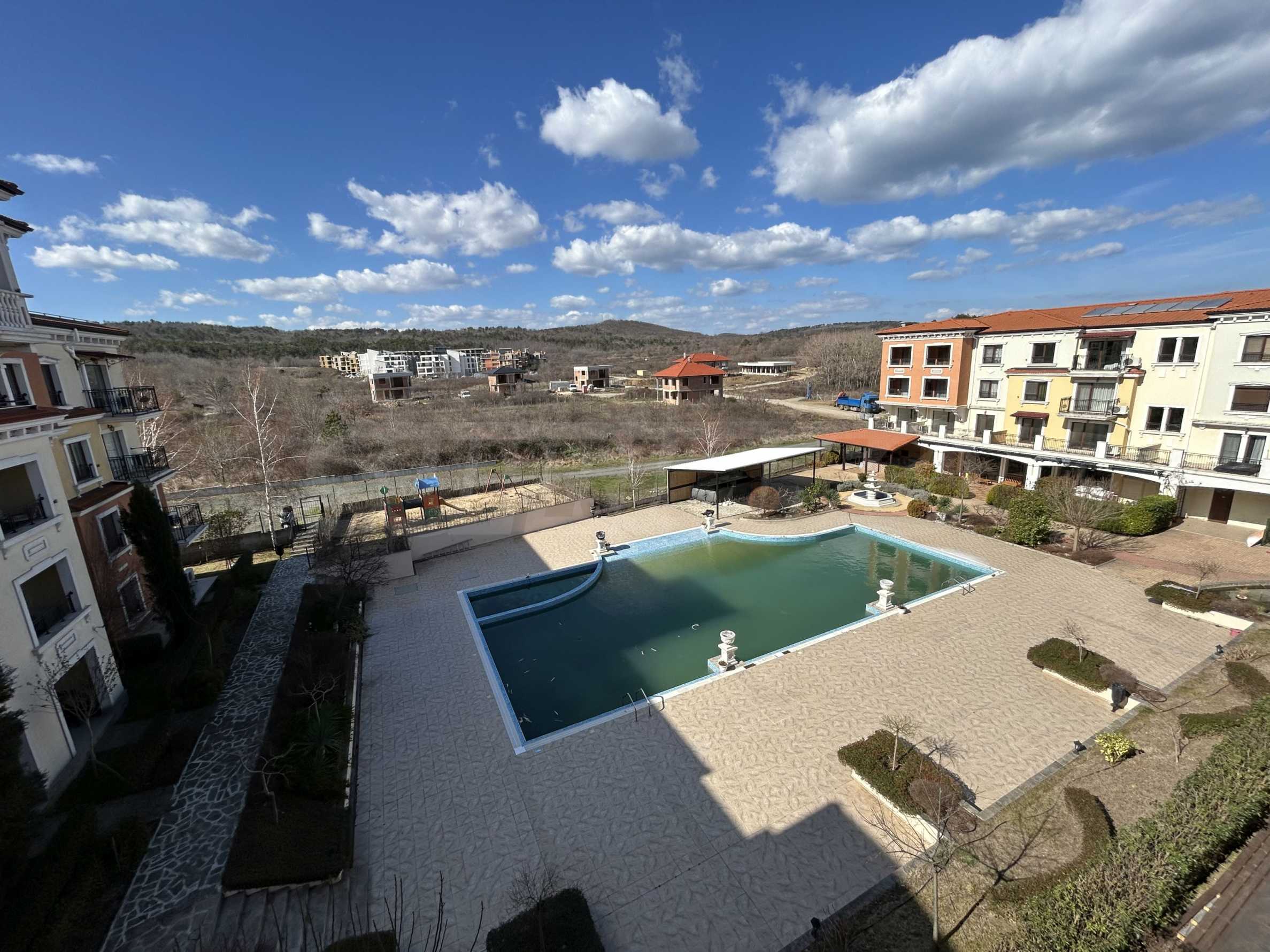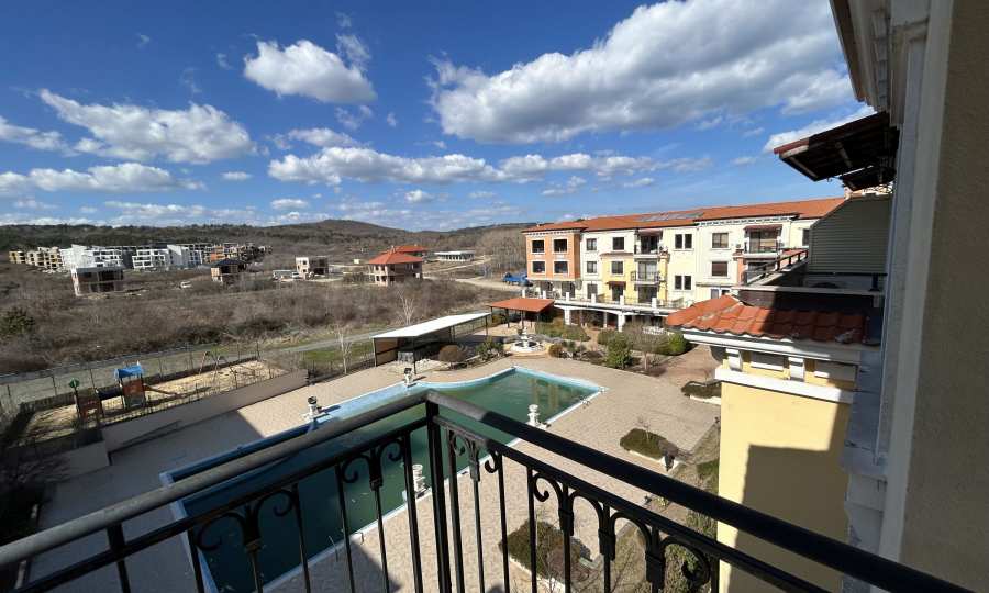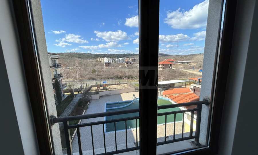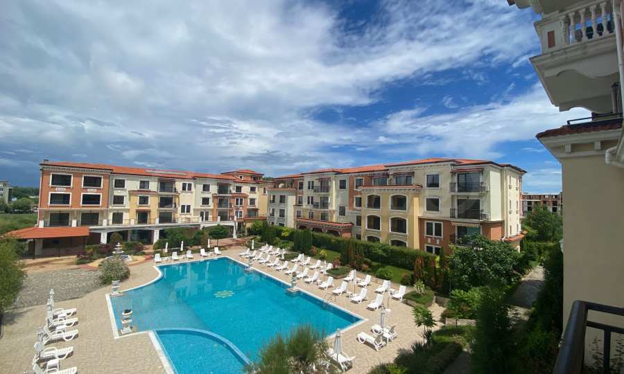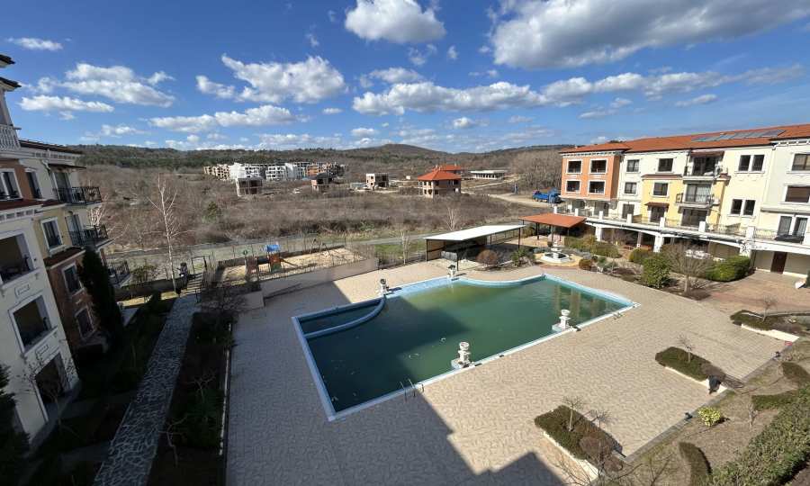 Апартаментът от 100.44 кв.м се намира на 4-ти етаж и има гледка към басейна.