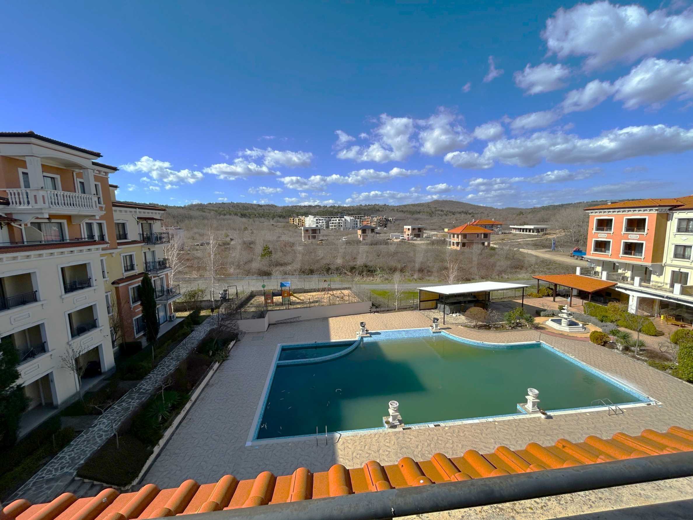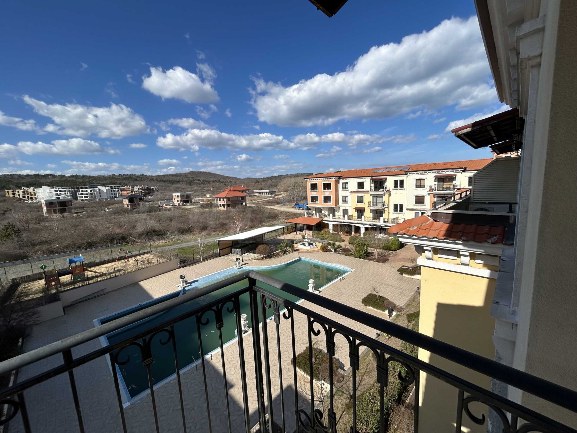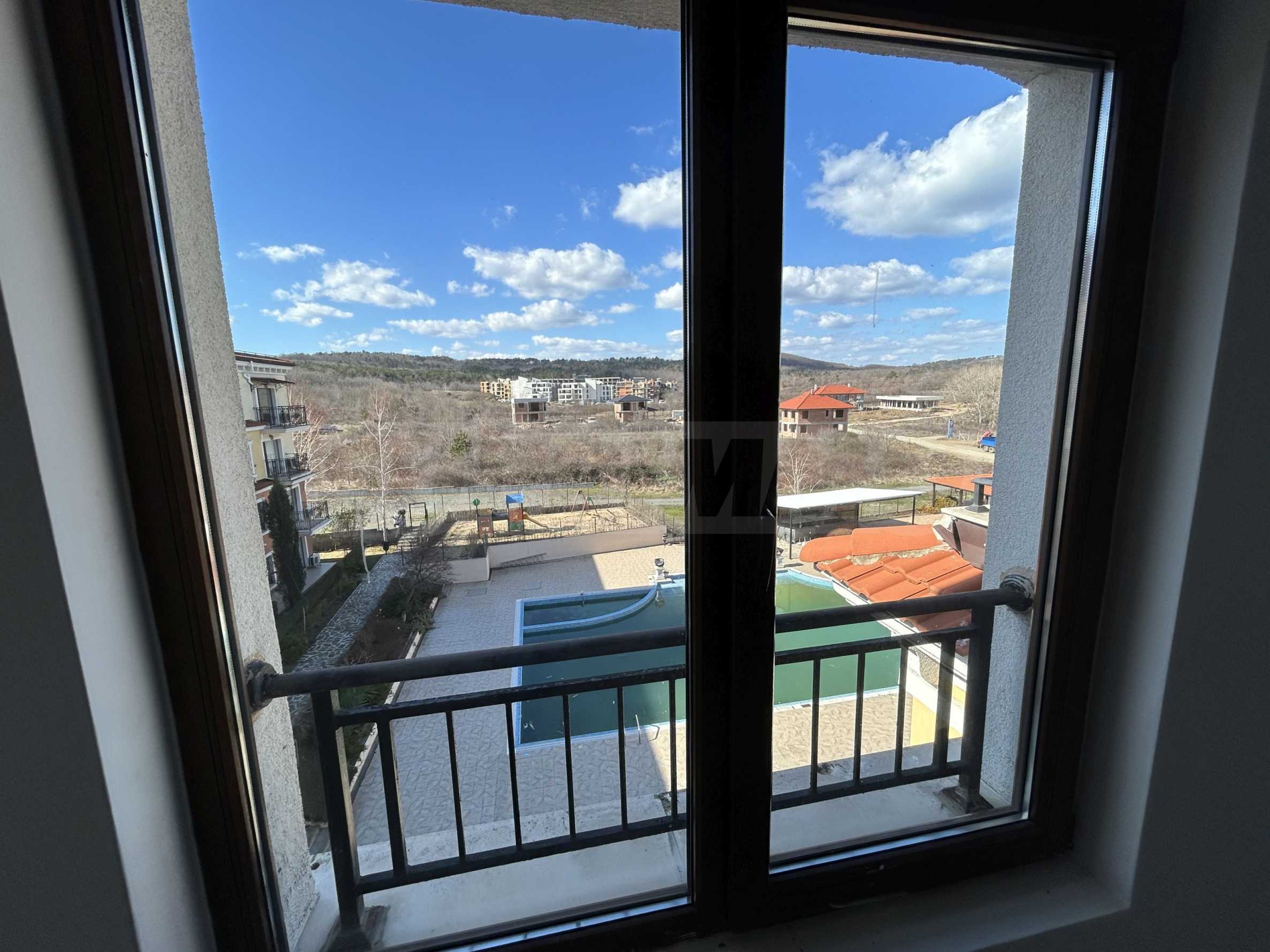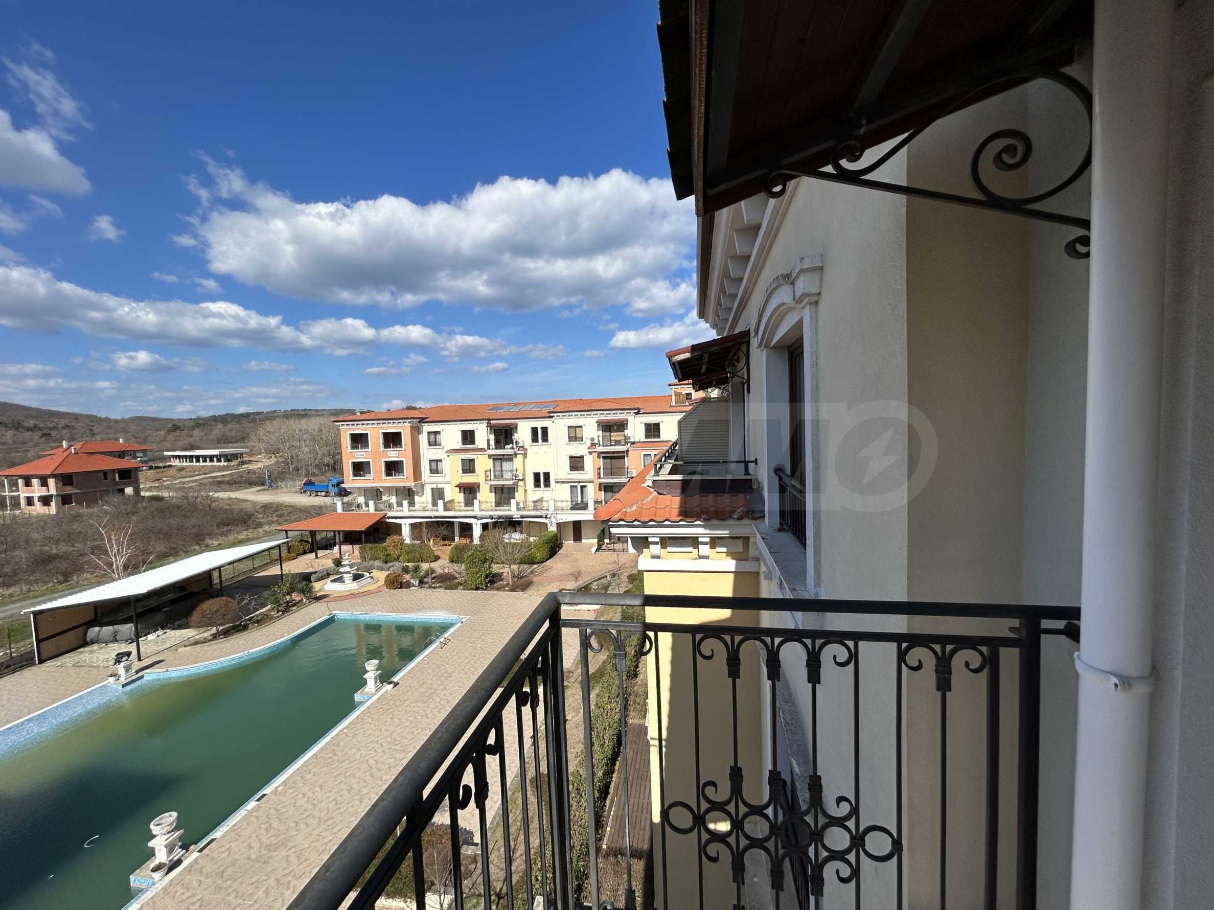 Апартаментът от 100.44 кв.м се намира на 4-ти етаж и има гледка към басейна.
