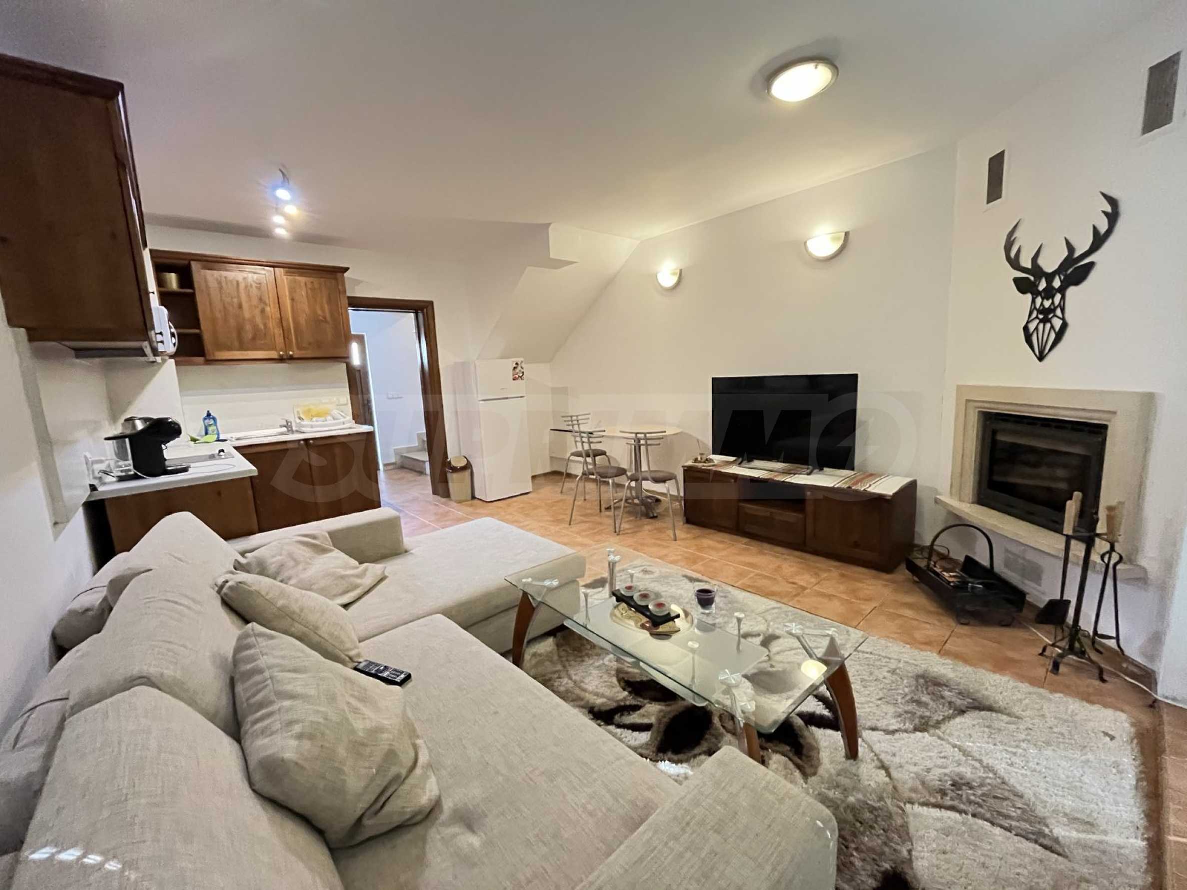 - Къщата разполага с просторен хол с камина, трапезария, кухня, две спални, две бани, балкон.