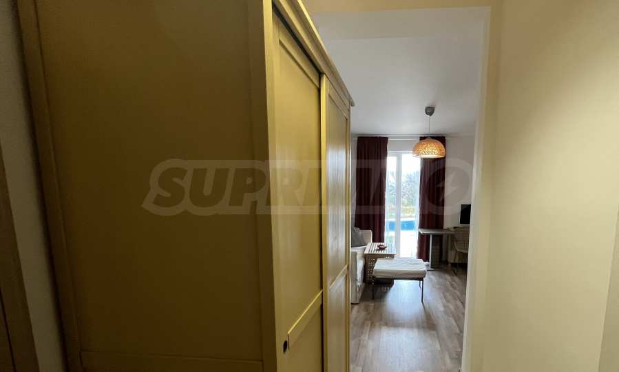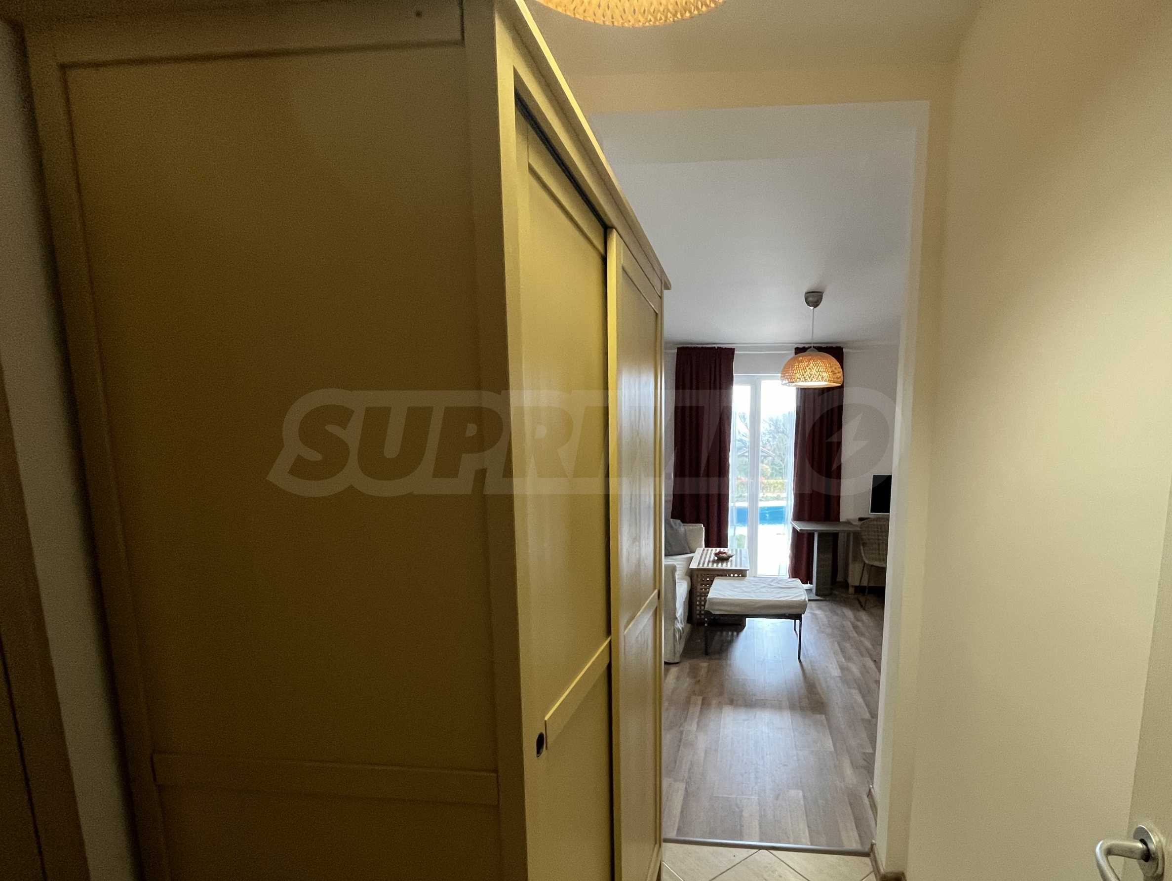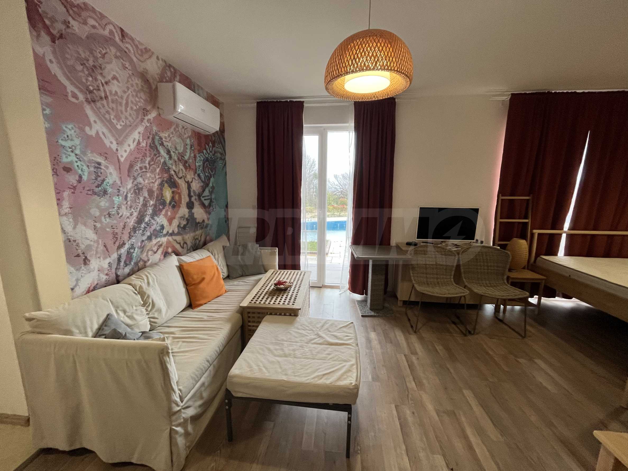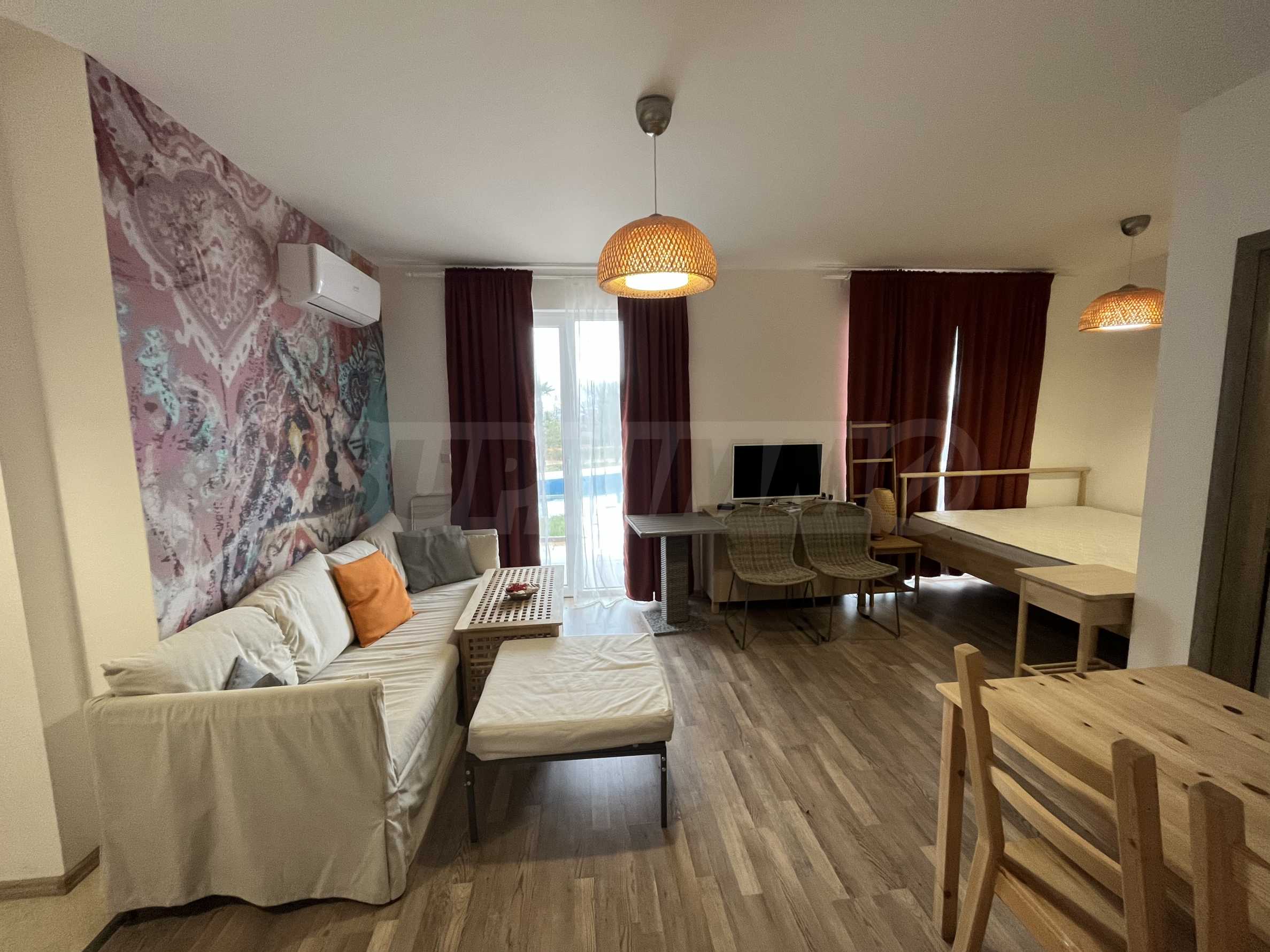 Имотът се намира на първи етаж и има тераса - 9.38 кв.м, с гледка към басейна. Предлага се с бутиково обзавеждане, в морски стил, със зона-спалня и зона-кухня, напълно оборудвана баня с душ кабина.