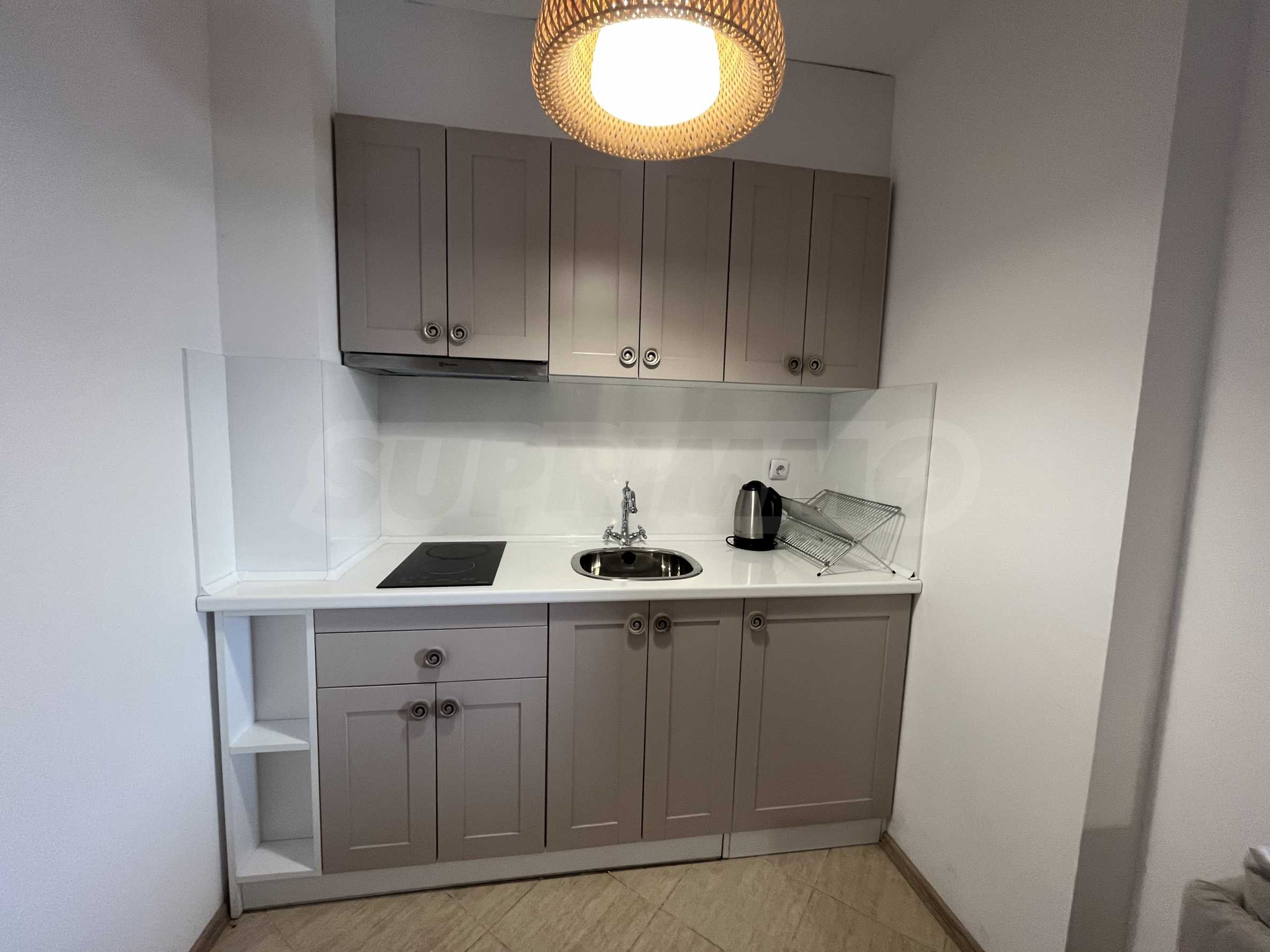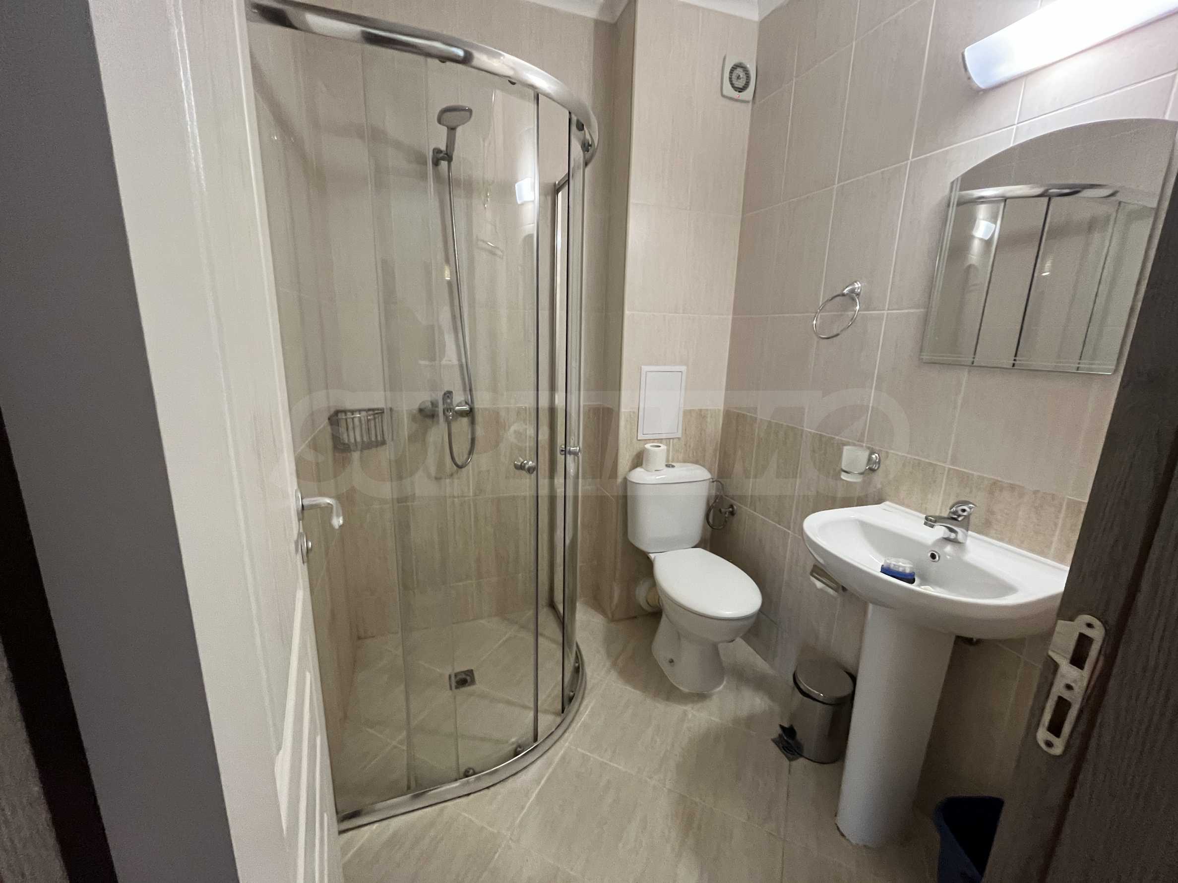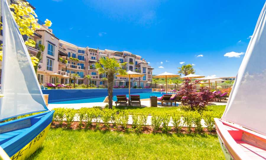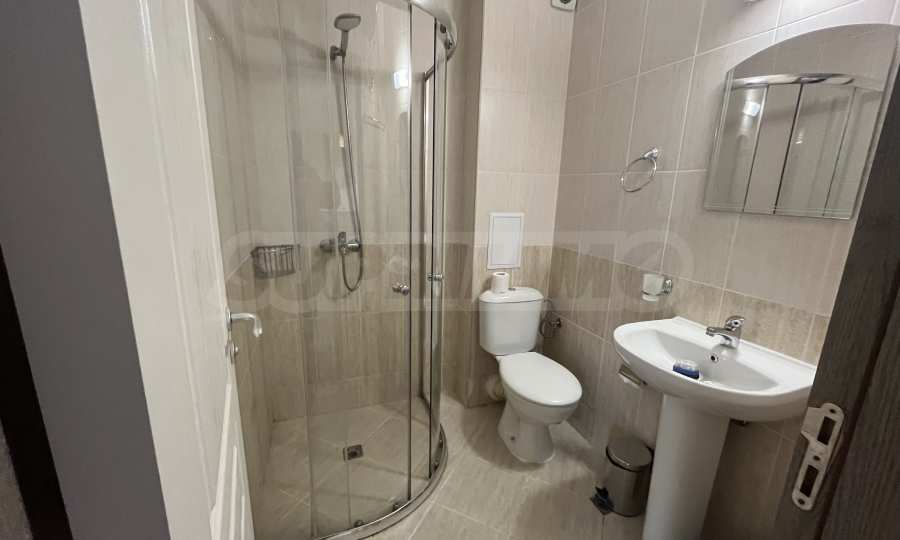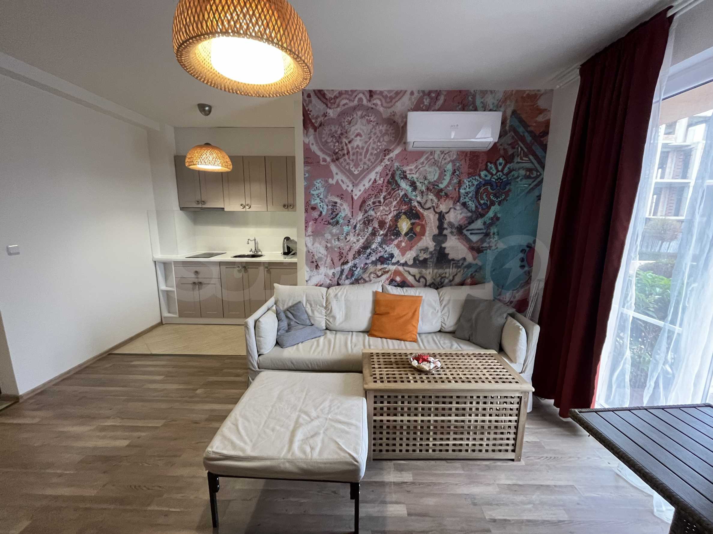 Имотът се намира на първи етаж и има тераса - 9.38 кв.м, с гледка към басейна. Предлага се с бутиково обзавеждане, в морски стил, със зона-спалня и зона-кухня, напълно оборудвана баня с душ кабина.