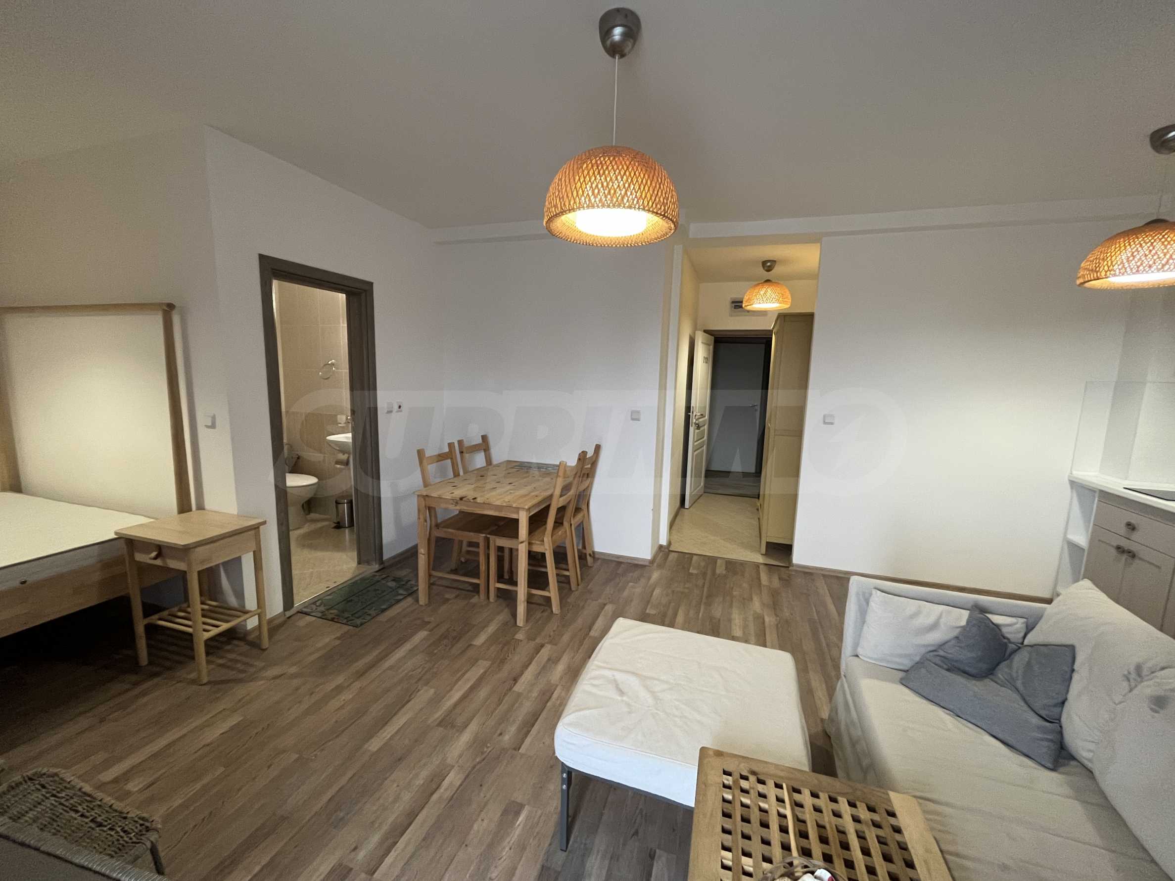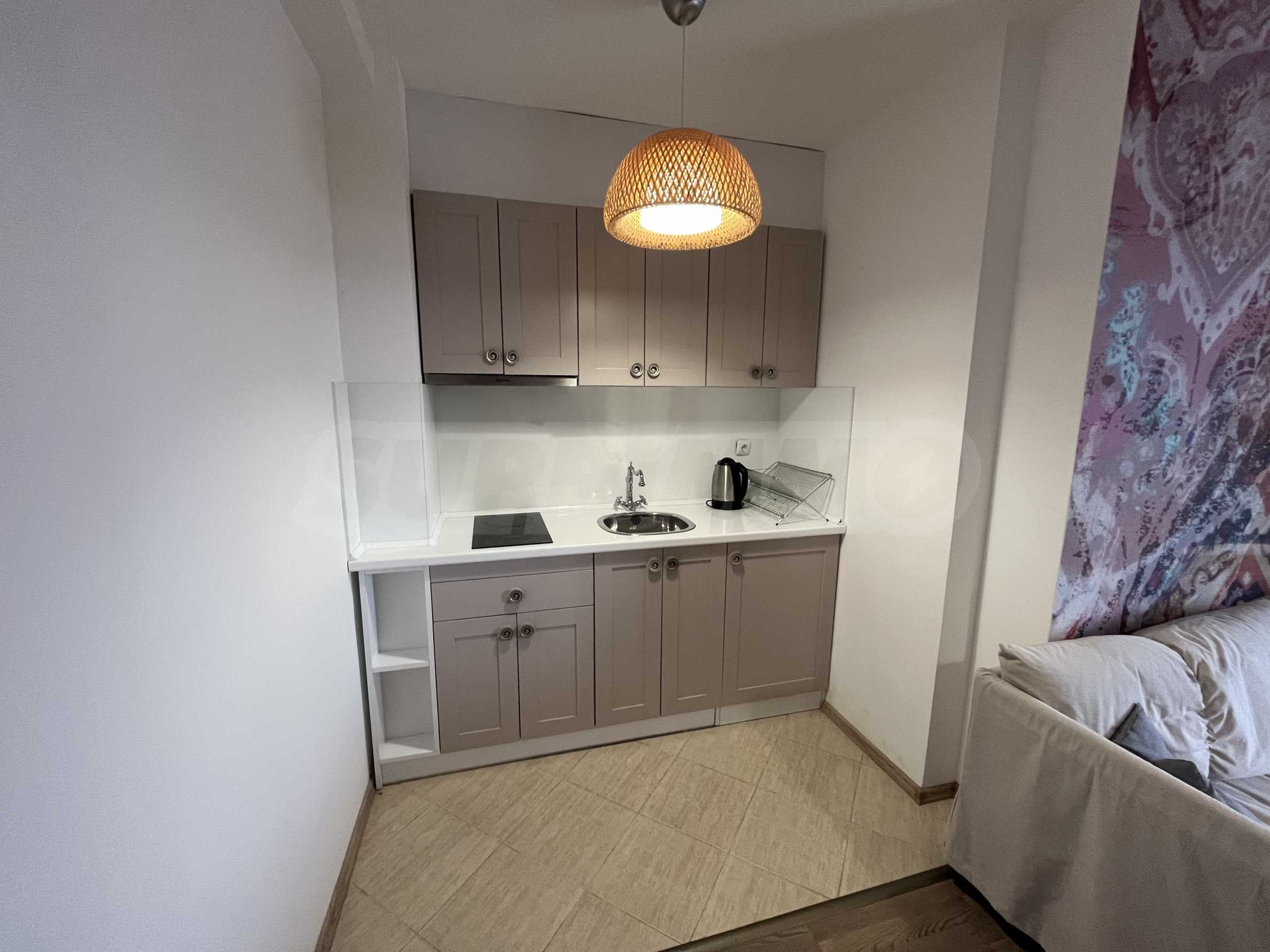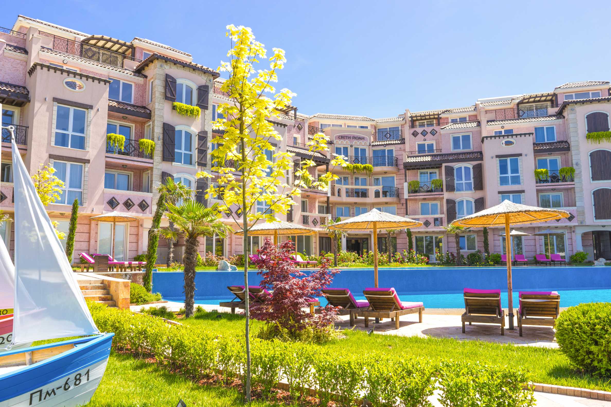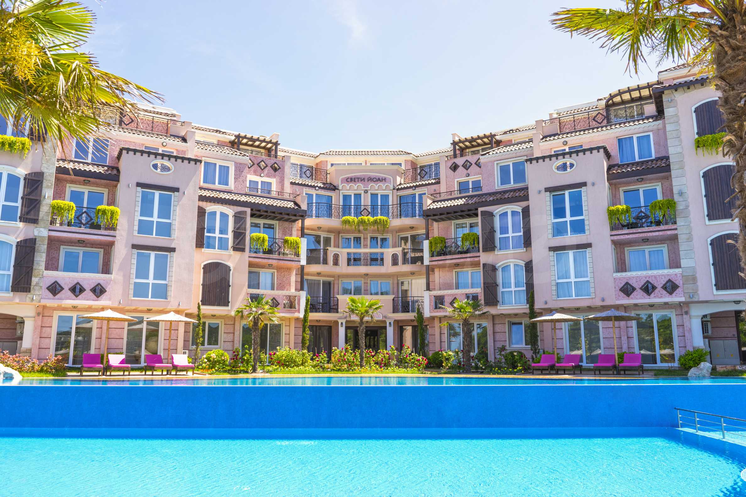 Имотът се намира на първи етаж и има тераса - 9.38 кв.м, с гледка към басейна. Предлага се с бутиково обзавеждане, в морски стил, със зона-спалня и зона-кухня, напълно оборудвана баня с душ кабина.