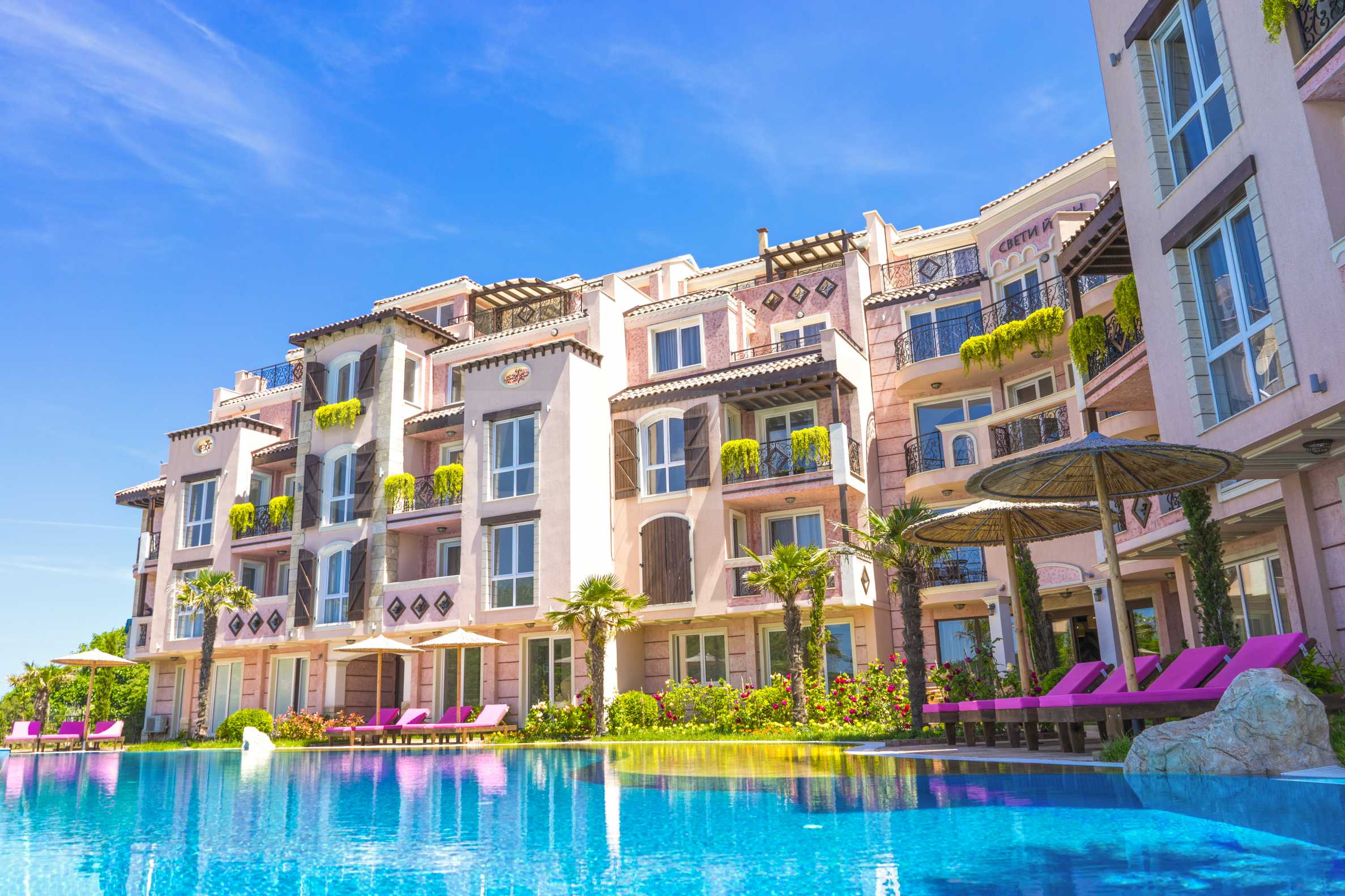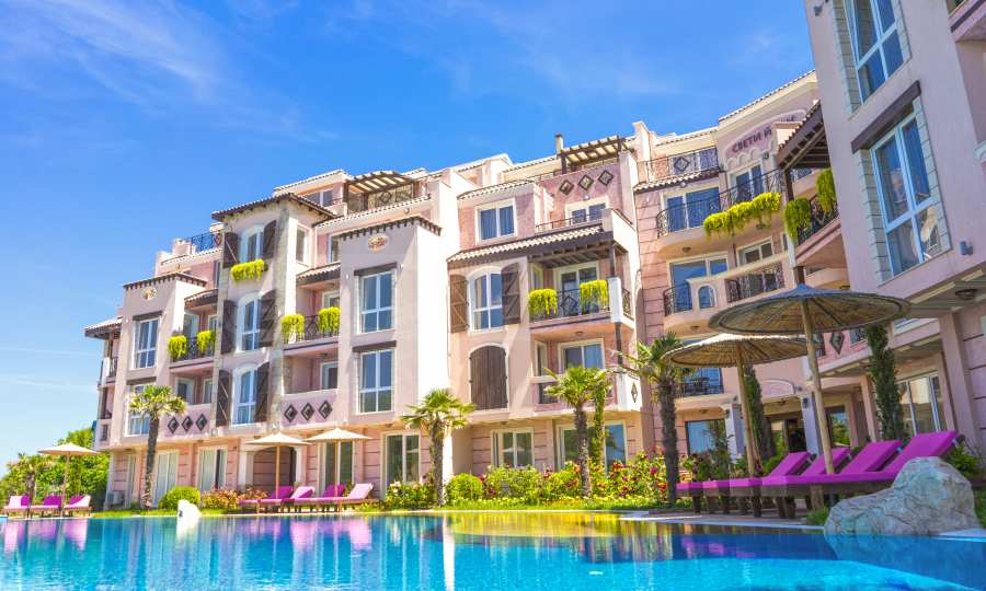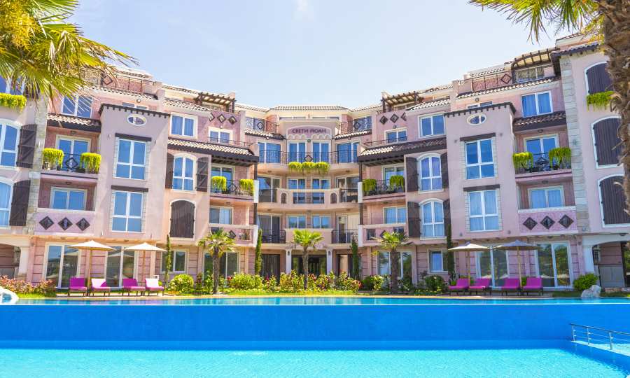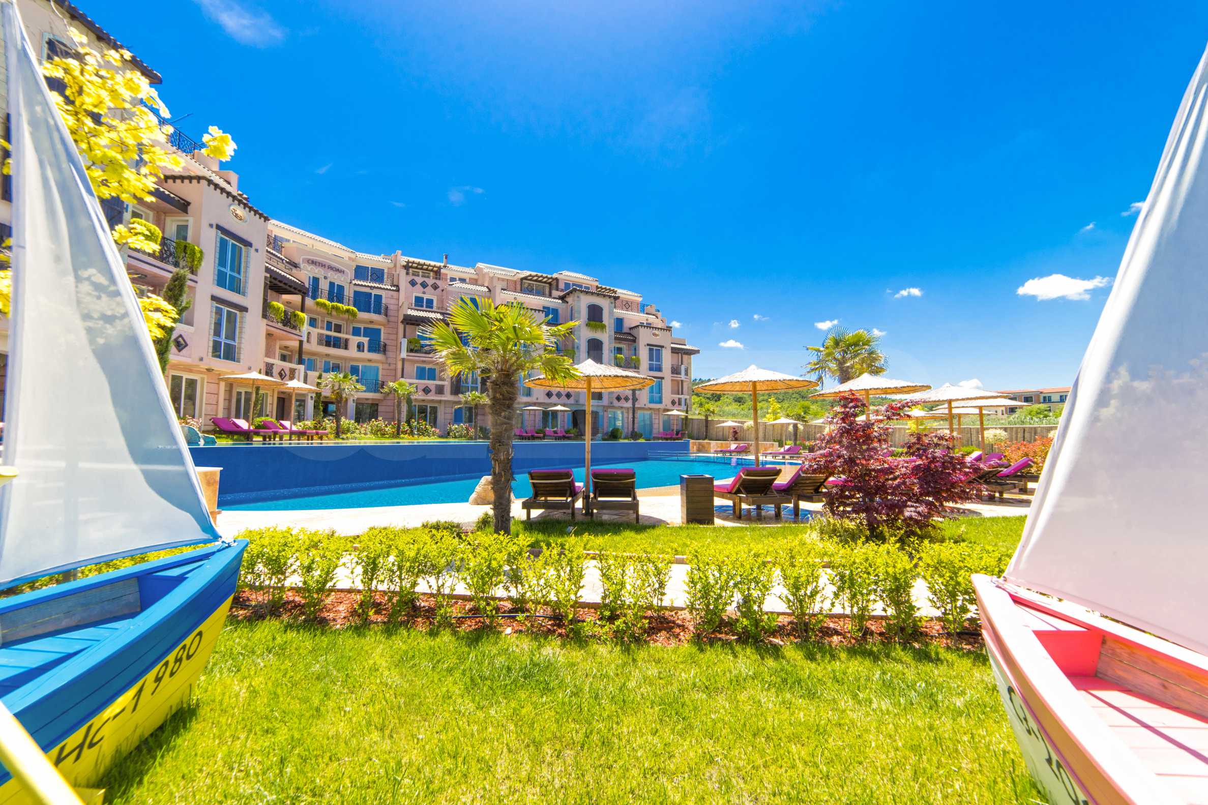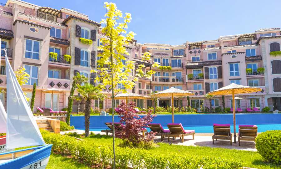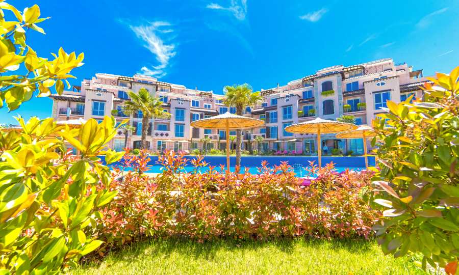 Сградите са обърнати към морето, а зад тях се вижда красива гледка към планината Странджа - архитектурен шедьовър, който комбинира функционалност, конструктивизъм и красотата на средиземноморския стил едновременно.