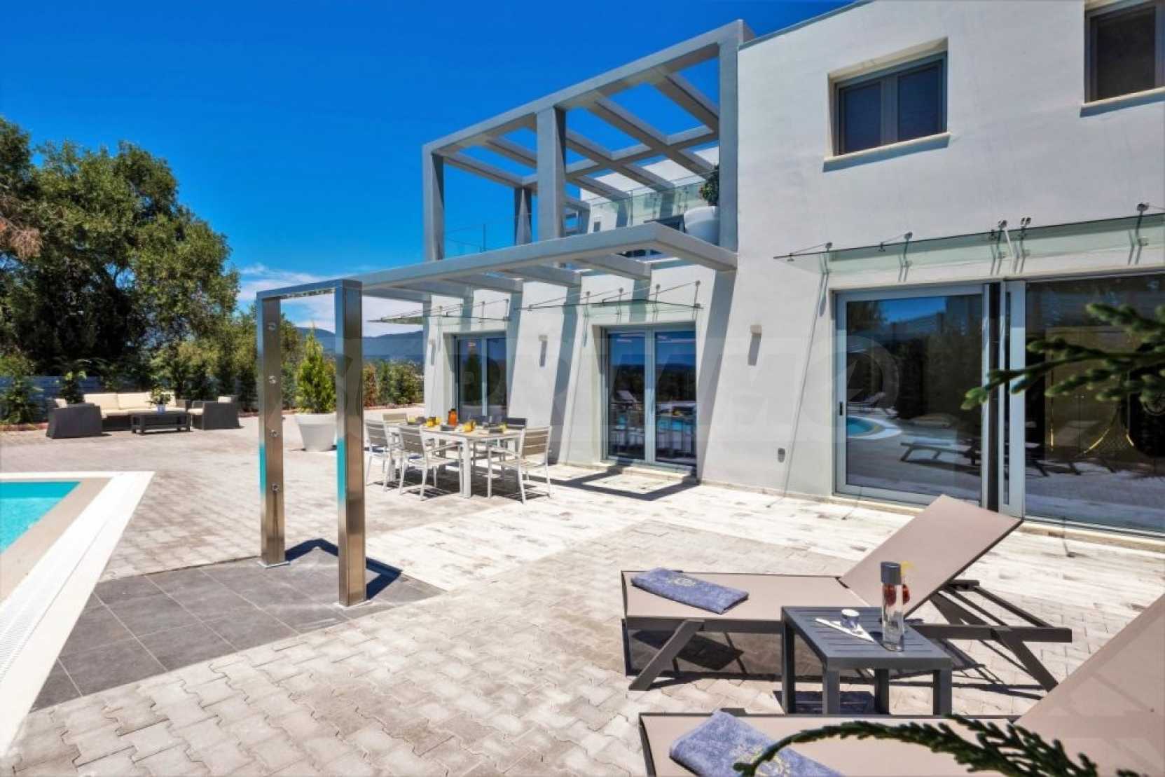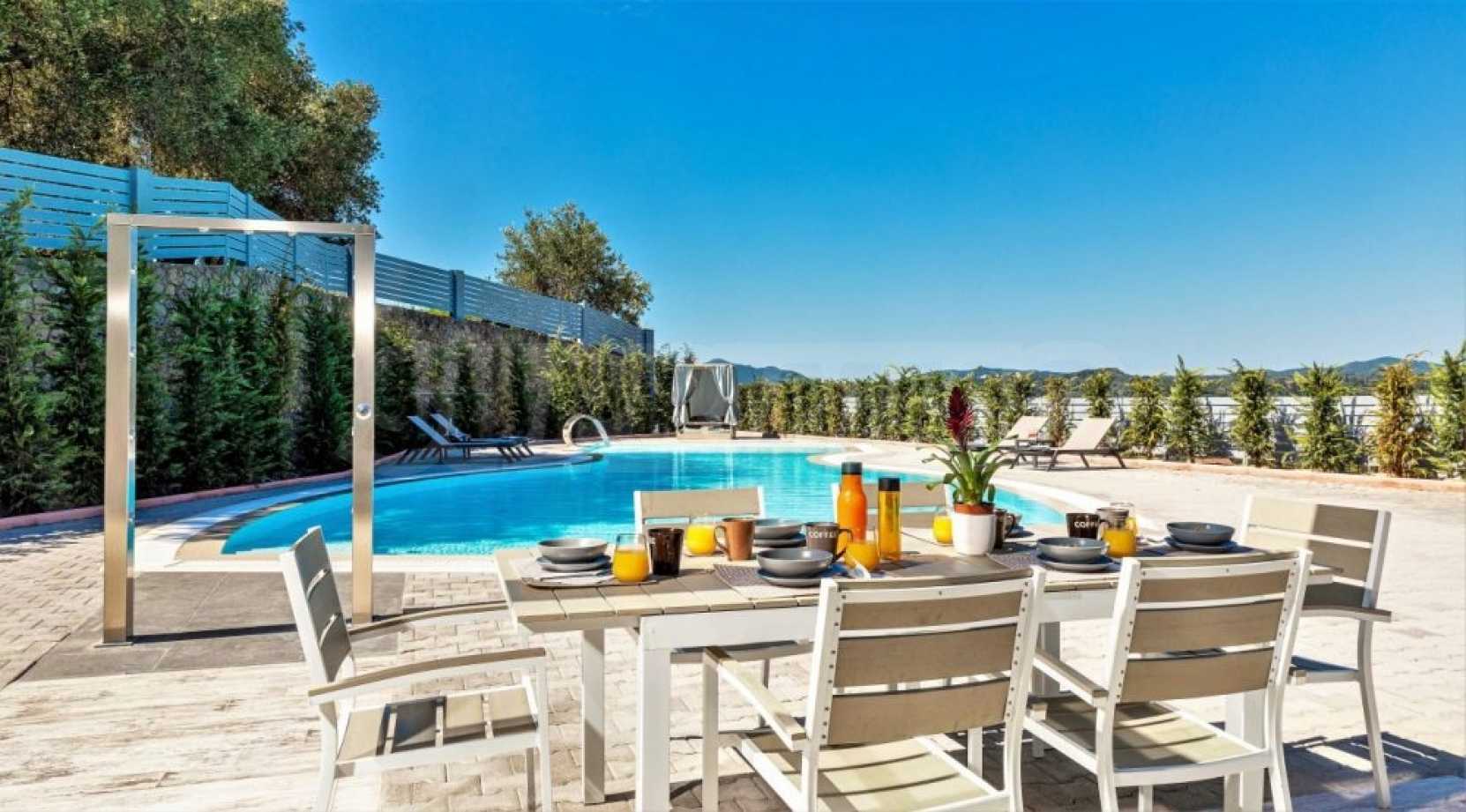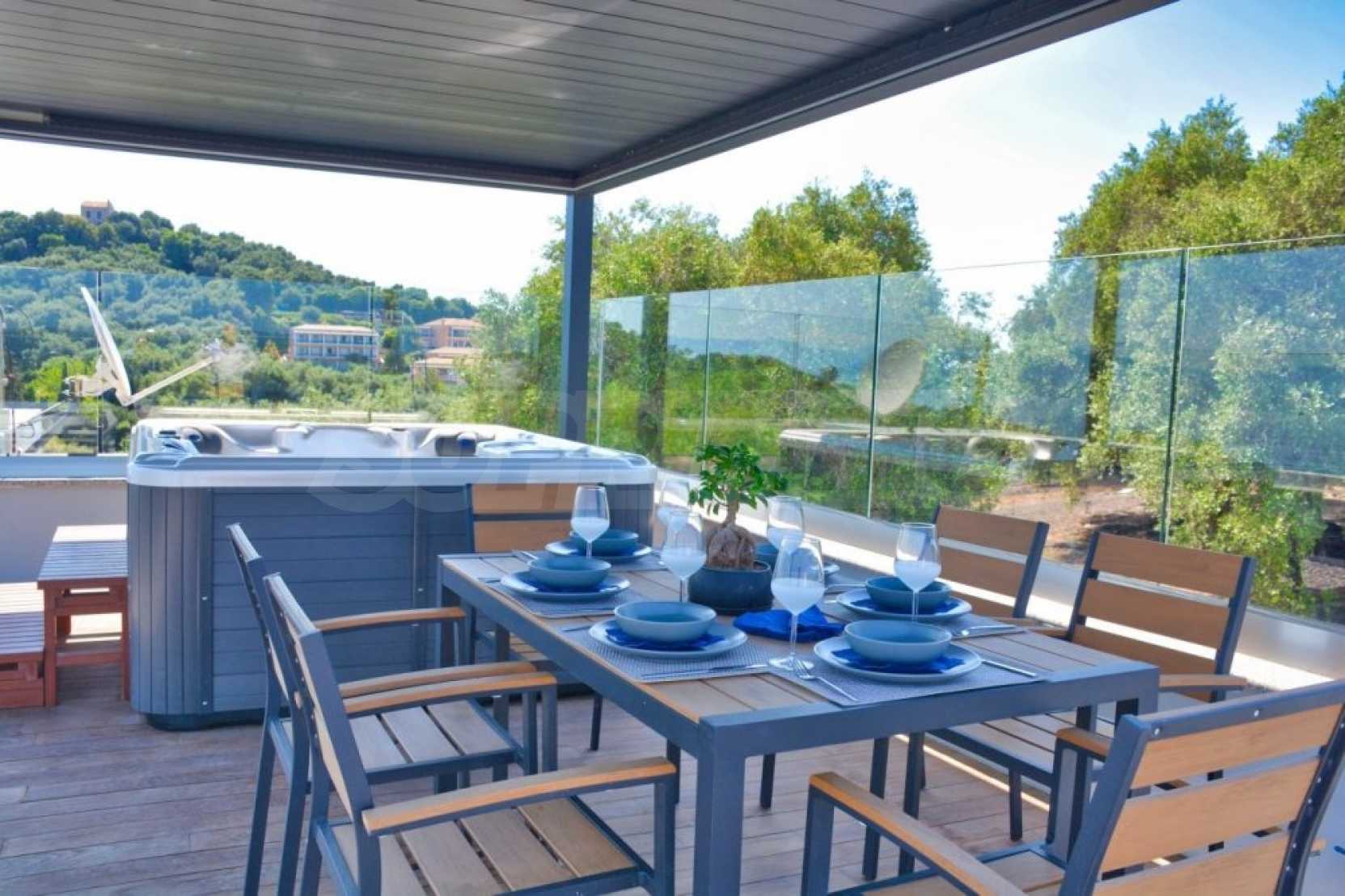 Този имот с интелигентна къща предлага невероятна гледка към дълбокото синьо море, околните тучни хълмове и град Корфу. На кратко разстояние с кола има много красиви пясъчни плажове. Районът Дасия и Ипсос, които са на по-малко от 10 минути път с кола от вилата, разполага с всякакви магазини, услуги и удобства, включително училища, супермаркети, кафенета, ресторанти и много други.