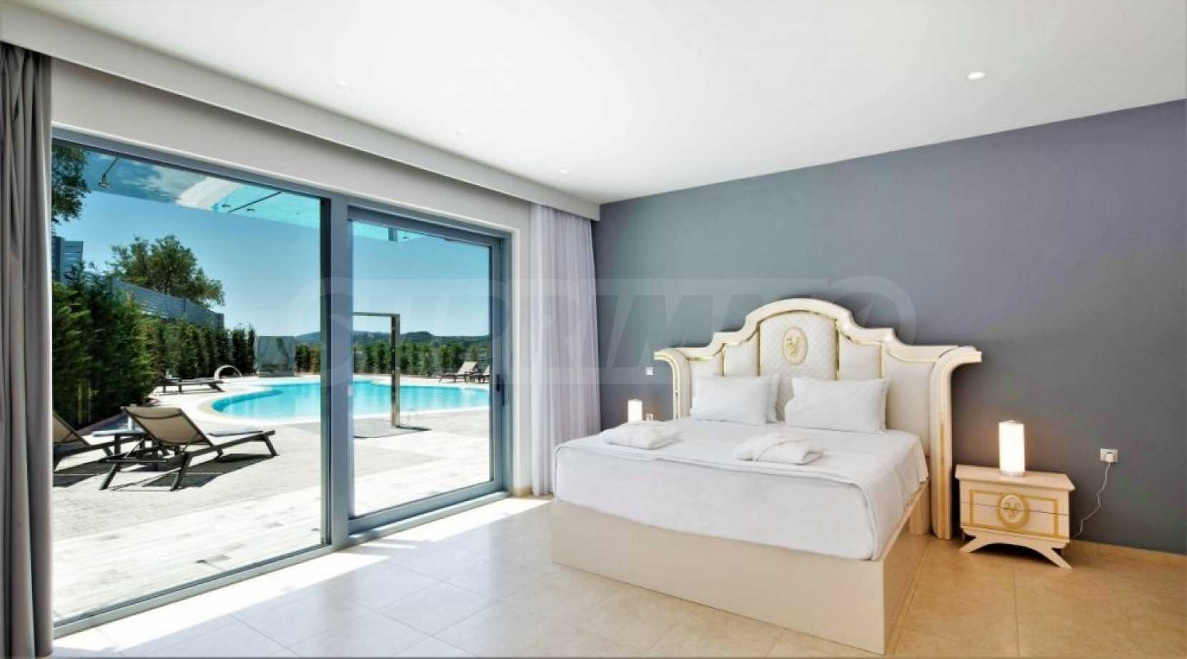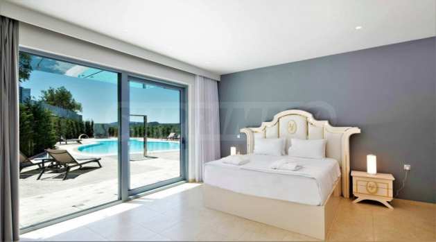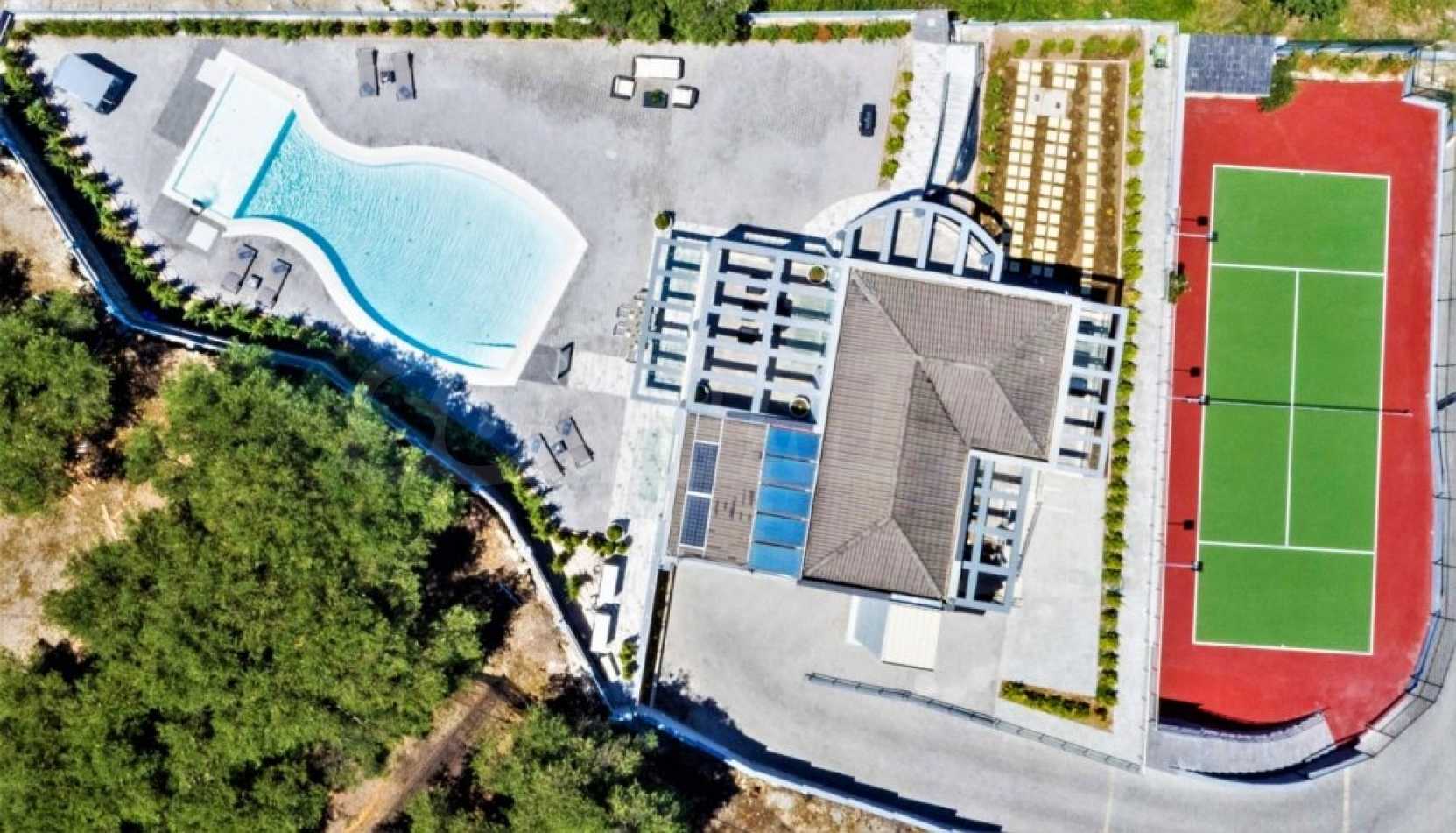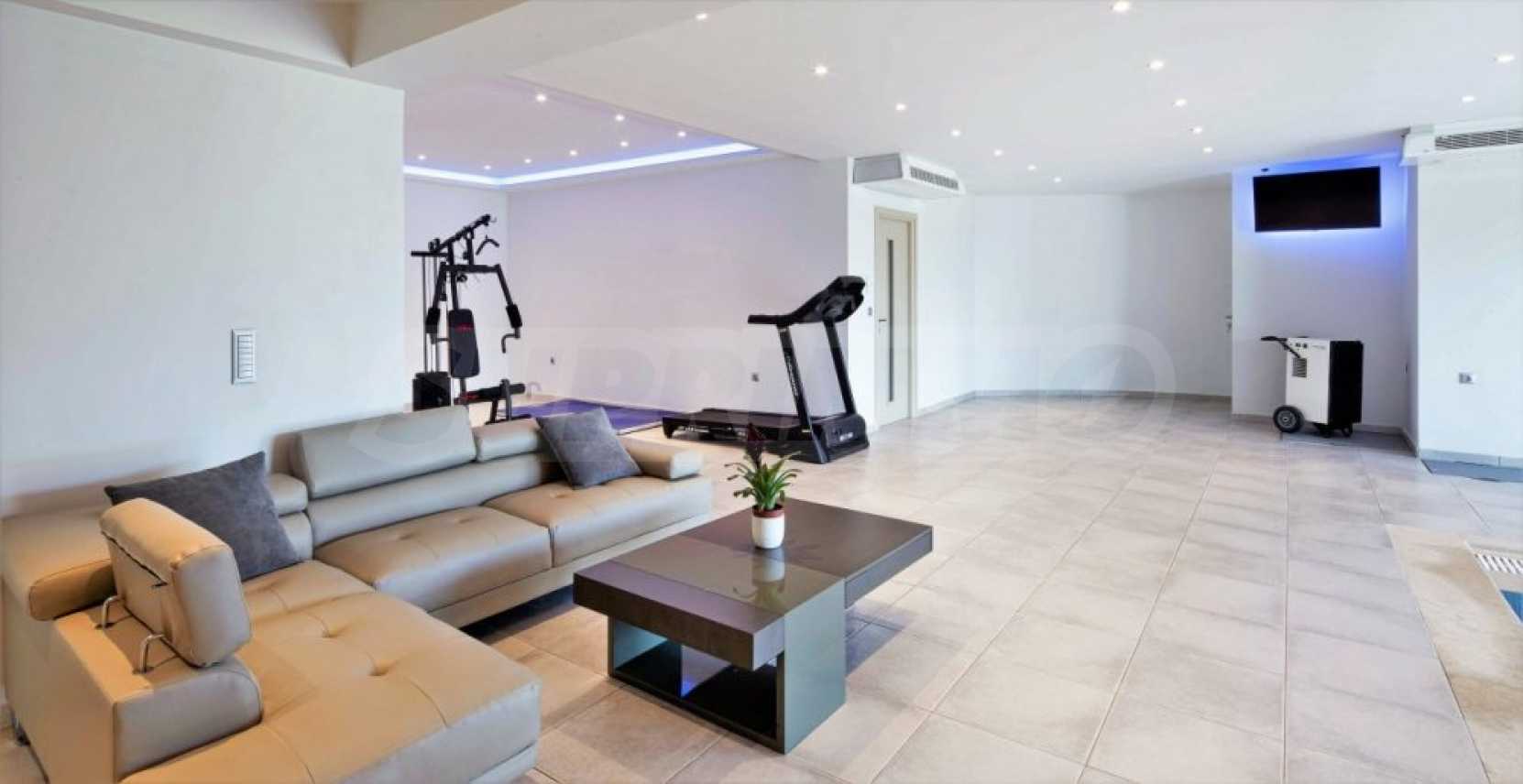 Вътрешно стълбище свързва трите етажа. Има и асансьор, който свързва трите нива. Трето ниво разполага с баня, родителска спалня и просторни веранди от 3 страни. Главната спалня разполага с дрешник и самостоятелна баня с душ. Вилата разполага и с алуминиева дограма. Външните части са озеленени с тревна градина и големи тераси. Има достатъчно пространство и невероятен плувен басейн, както и частен тенис корт.