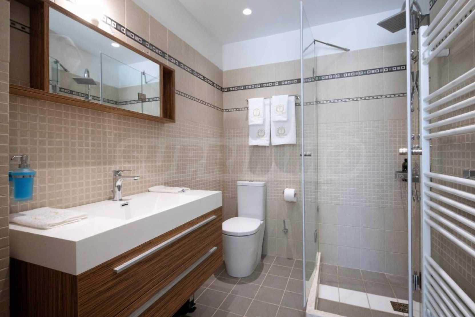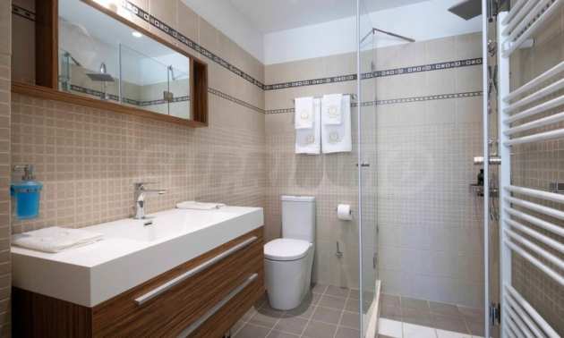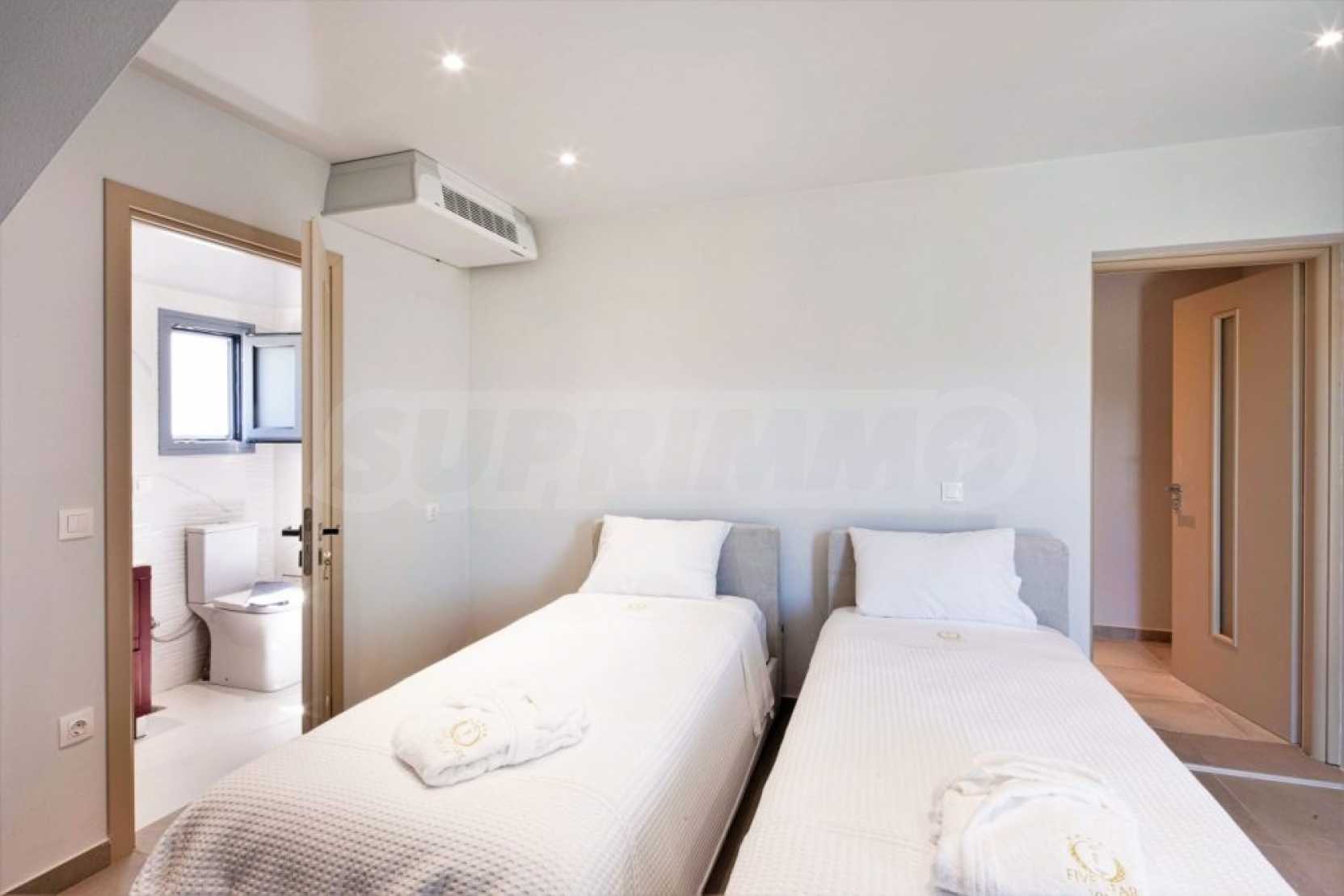 Вътрешно стълбище свързва трите етажа. Има и асансьор, който свързва трите нива. Трето ниво разполага с баня, родителска спалня и просторни веранди от 3 страни. Главната спалня разполага с дрешник и самостоятелна баня с душ. Вилата разполага и с алуминиева дограма. Външните части са озеленени с тревна градина и големи тераси. Има достатъчно пространство и невероятен плувен басейн, както и частен тенис корт.