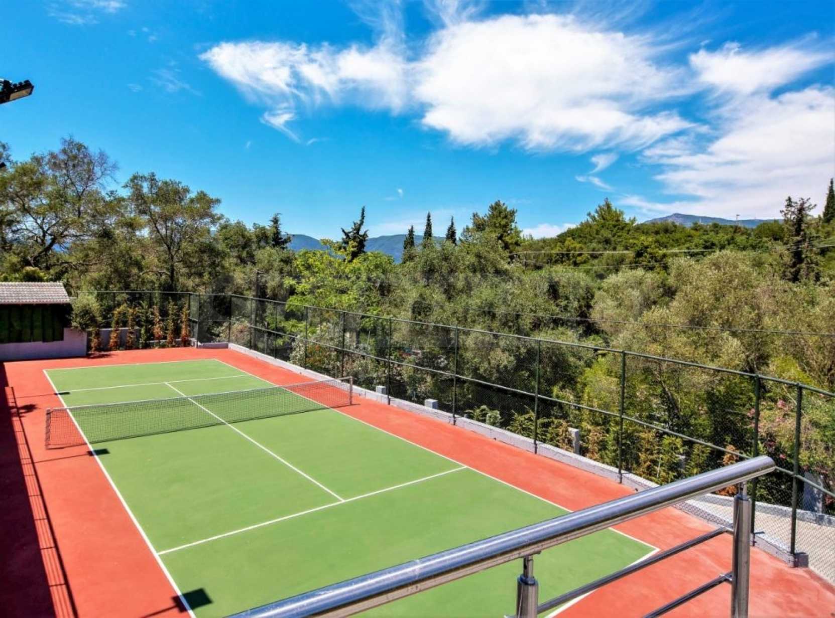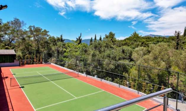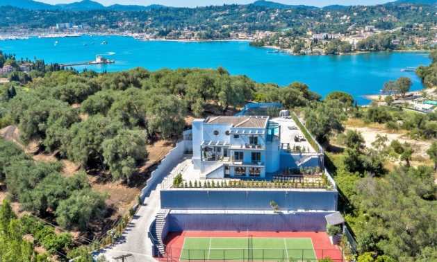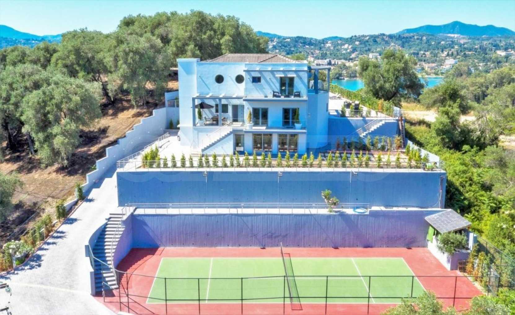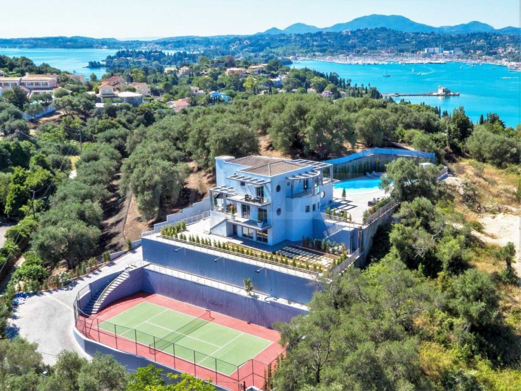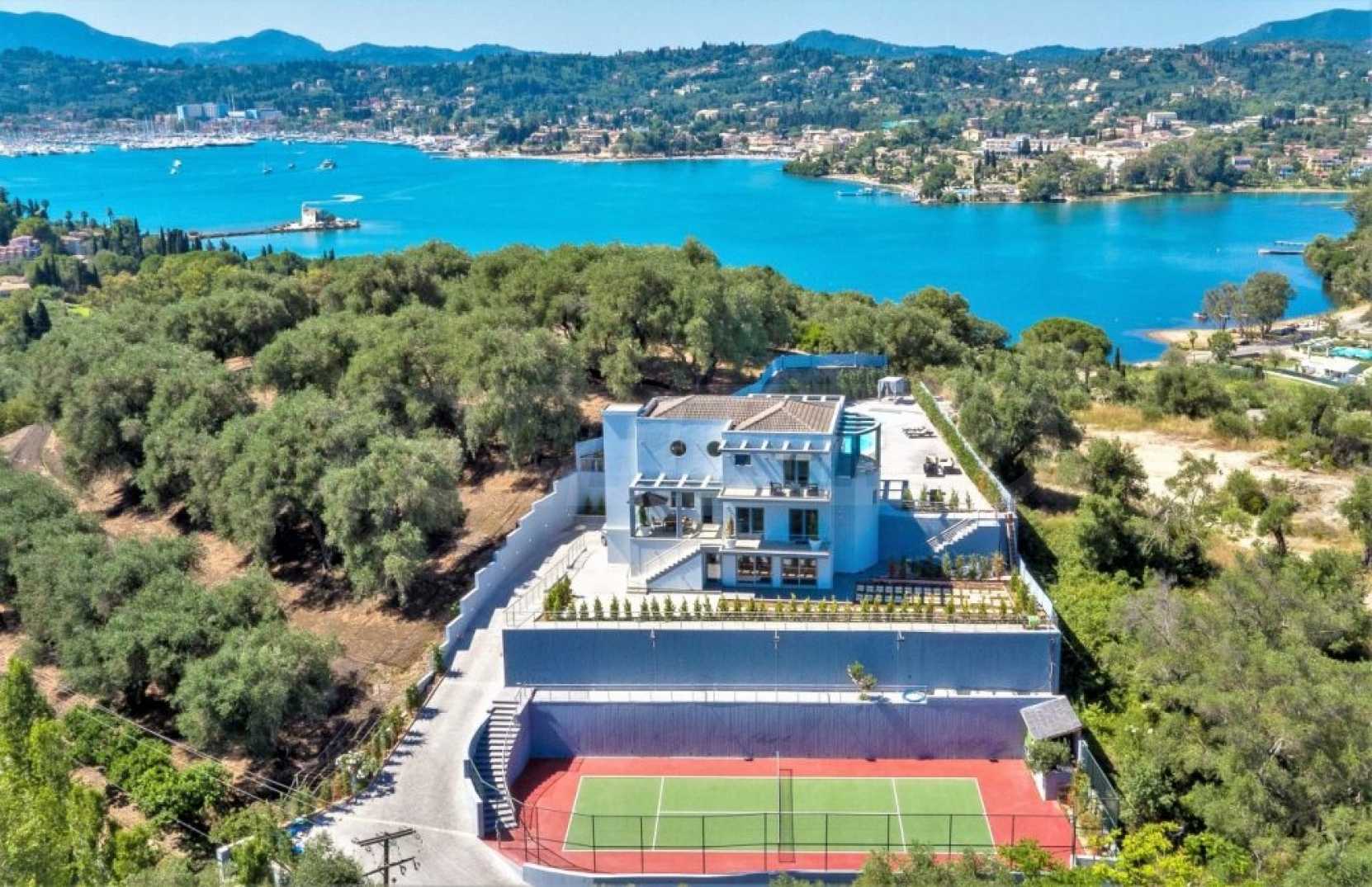 Тази уникална луксозна вила с обща площ от 436 кв.м. с тенис корт и 2 плувни басейна е построена на едно от най-добрите места на острова, района Комено, който се намира централно на Корфу.
